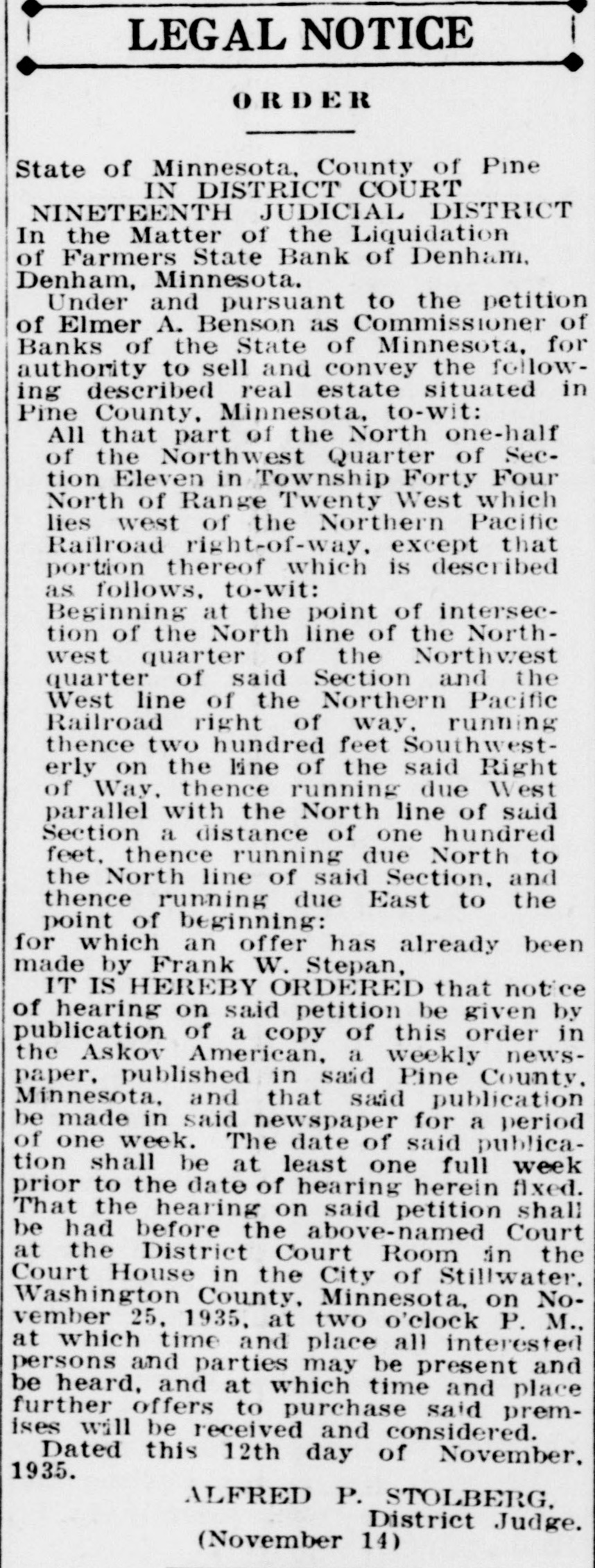 LEGAL NOTICE ORDER State of Minnesota, County of Pine IN DISTRICT COURT NINETEENTH JUDICIAL DISTRICT In the Matter of the Liquidation of Farmers State Bank of Denham, Denham, Minnesota. Under and pursuant to the petition of Elmer A. Benson as Commissioner of Banks of the State of Minnesota, for authority to sell and convey the following described real estate situated in Pine County. Minnesota, to-wit: All that part of the North one-half of the Northwest Quarter of Section Eleven in Township Forty Four North of Range Twenty West which lies west of the Northern Pacific Railroad right-of-way, except that portion thereof which is described as follows, to-wit: Beginning at the point of intersection of the North line of the Northwest quarter of the Northwest quarter of said Section and the West line of the Northern Pacific Railroad right of way, running thence two hundred feet Southwesterly on the line of the said Right of Way, thence running due West parallel with the North line of said Section a distance of one hundred feet, thence running due North to the North line of said Section, and thence running due East to the point of beginning: for which an offer has already been made by Frank W. Stepan, IT IS HEREBY ORDERED that notice of hearing on said petition be given by publication of a copy of this order in the Askov American, a weekly newspaper, published in said Pine County. Minnesota, and that said publication be made in said newspaper for a period of one week. The date of said publication shall be at least one full week prior to the date of hearing herein fixed. That the hearing on said petition shall be had before the above-named Court at the District Court Room in the Court House in the City of Stillwater. Washington County, Minnesota, on November 25, 1935, at two o'clock P. M., at which time and place all interested persons and parties may be present and be heard, and at which time and place further offers to purchase said premises will be received and considered. Dated this 12th day of November, 1935. ALFRED P. STOLBERG. District Judge. (November 14)