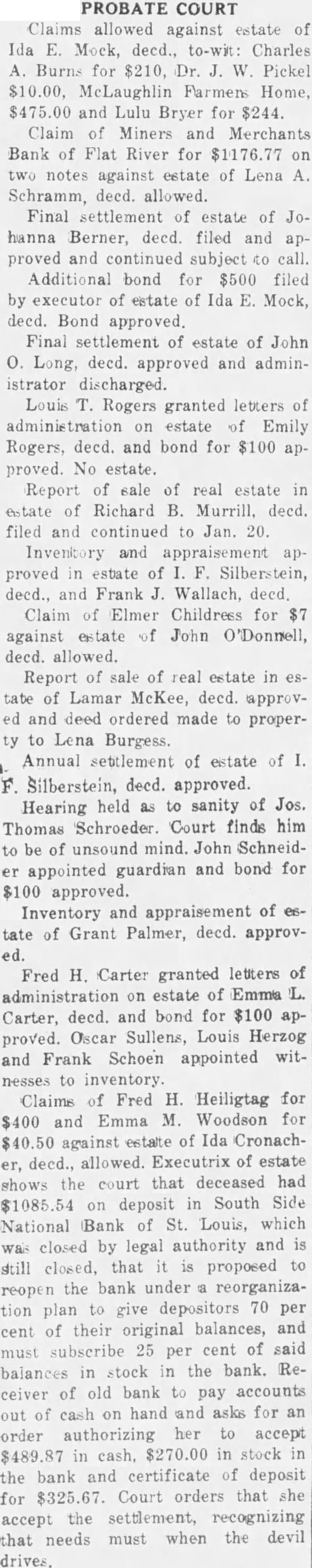 If politics were religion, then the manner of disposing of county printing set forth in the Advocate artiwould be exactly correct, but. in. asmuch polities is not eligion, and all know never will be, then their suggested manner of handling the printing orders, for that inatter the handling of political patronage of any character, whether be printing the disposition of political posi tion, exactly to the usual and regular manner of handling polipatronage, and those handling in that manner are guilty of betraying their best, most and staunchest friends, and the strongest ally of the Democratic party, namely: The Democratic Press. The portion of your article with reference to extending patronage cally against its extension to side firms, as relates to the tax untion. extremely meritorious, and should be given the most consideration all taxpayers. No any kind should be ed to outside firms, local which is supporting the county with taxes, could do the contract the same price, at near the same Trusting and hoping that continue your readers and the good turn, by handling public current and future in the name and truthful manner, am with best wishes for the success of the and both national and state. Gratefully yours, An Humble Democrat proved. No estate. January Report of sale of real estate to estate of Richard B. Murrill, dec., filed and ordered continued to Jan. 20th. January 13Inventory and appraiser.ent approvin estates of Silberstein, dec. and Frank Wallach, dec. Claim of Elmer Childers for $7.00 against estate of John O'Donnell, dec., allowed. Report of real estate in of Lamar approvand deed ordered made to property Lena Burgess. Annual settlement of estate Silberstein, dec., approved. Hearing held as sanity of Joseph Thomas Schroeder. Court finds him to be unsound John Schnelder appointed guardian and bond for $100 approved. Inventory and appraisement of of Grant Palmer, dee., approved Fred H. Carter granted letters administration estate of Emma Carter. deceased, and bond for $100 approved. Osear Sullens, Louis Herzog and Frank Schoen appointed witnesses inventory Claims of Fred H. Heiligtag for and Emma Woodson for against estate of Ida Cronacker, dec., allowed. Executrix of estate shows the Court that deceased had on deposit in South Side National Bank of St. Louis, which was closed by legal authority and is still closed. that is proposed to reopen the bank under reorganization plan to give depositors 70 per cent of their inal balances and must subscribe 25 per cent of said balance in stock in the Bank. Receiver of old bank to pay accounts out of cash on hand, and asks for an order authorizing her accept $489.87 in $270.00 stock in bank and certificate of deposit for $325.67. Court orders that she accept the that when the devil to needs must