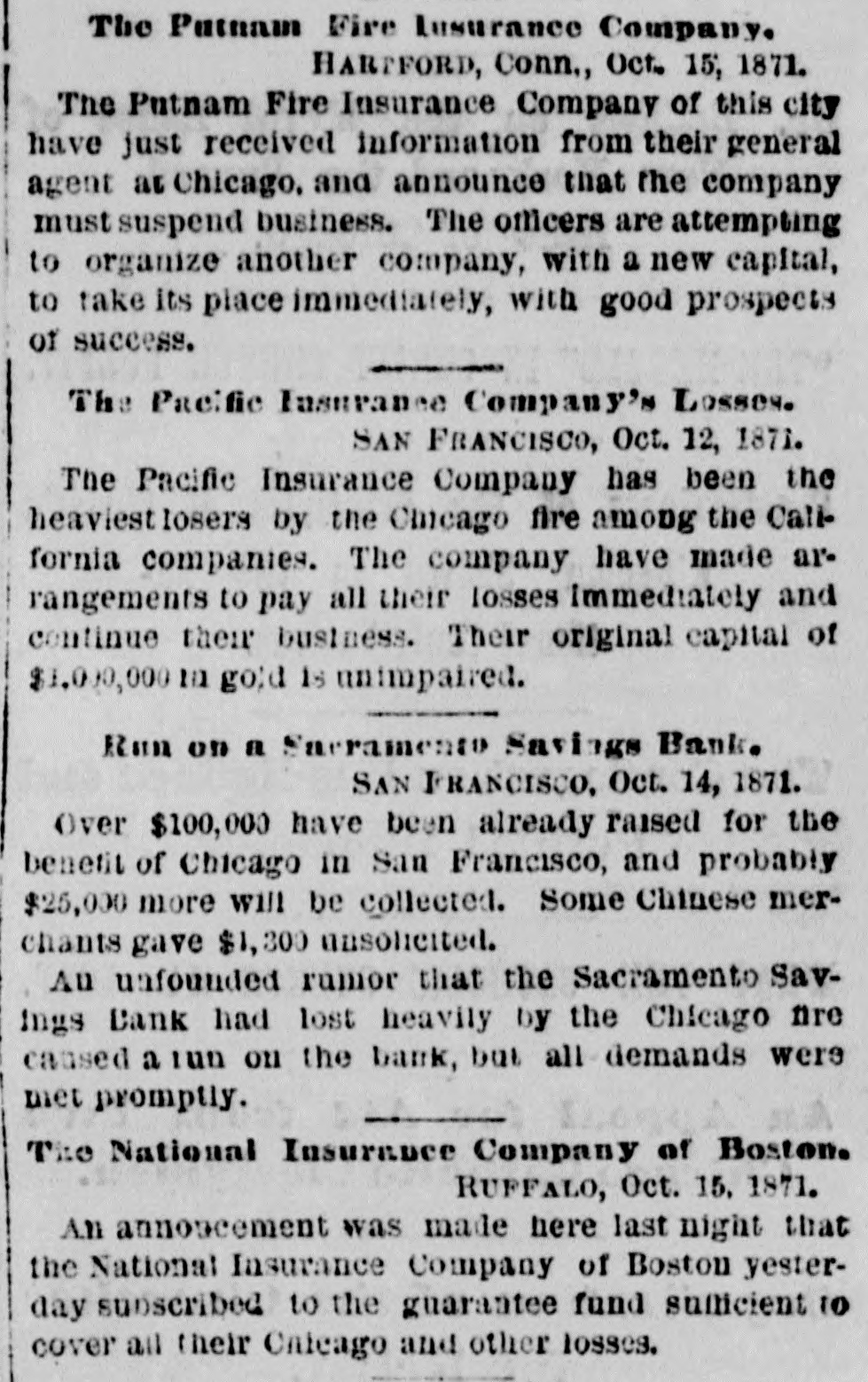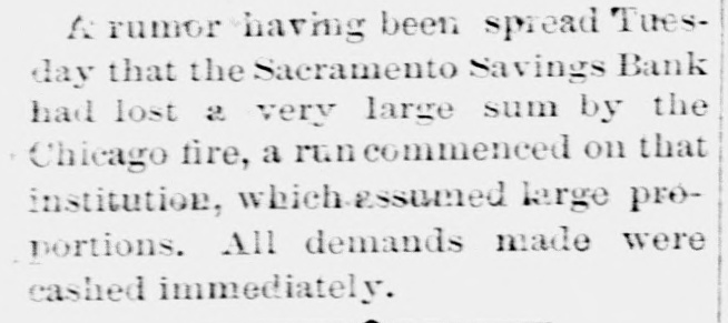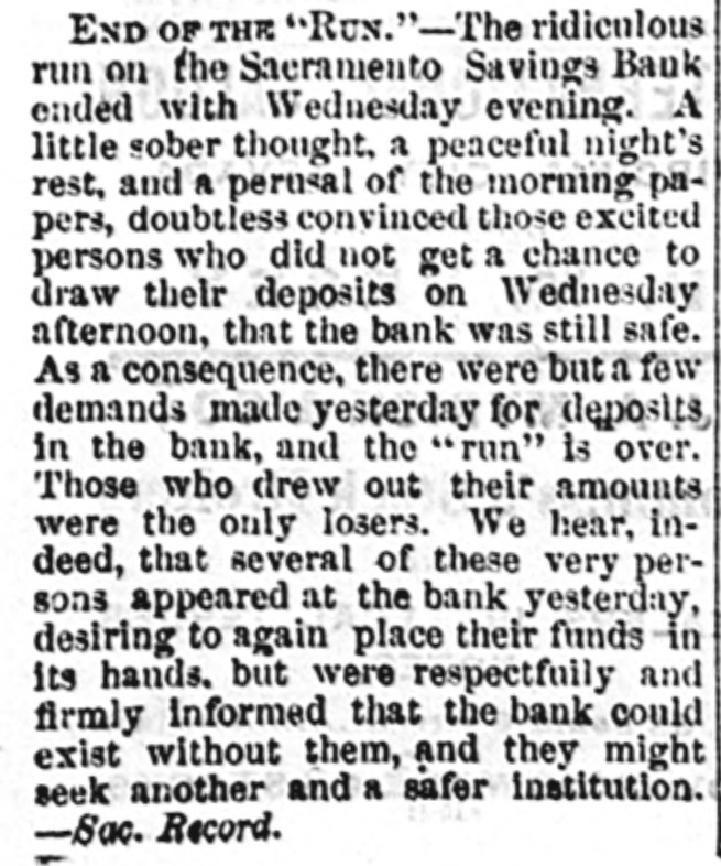 END OF THE "RUN.' - The ridiculous run on the Saeramento Savings Bauk ended with Wednesday evening. A little sober thought, a peaceful night's rest, and a perusal of the morning papers, doubtless convinced those excited persons who did not get a chance to draw their deposits on Wednesday afternoon, that the bank was still safe. As a consequence, there were but a few demands made yesterday for deposits, in the bank, and the "run" is over. Those who drew out their amounts were the only losers. We hear, indeed, that several of these very persons appeared at the bank yesterday, desiring to again place their funds in its hands. but were respectfully and firmly informed that the bank could exist without them, and they might seek another and a safer institution. - Sac. Record.