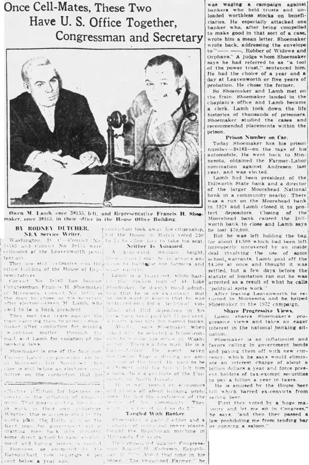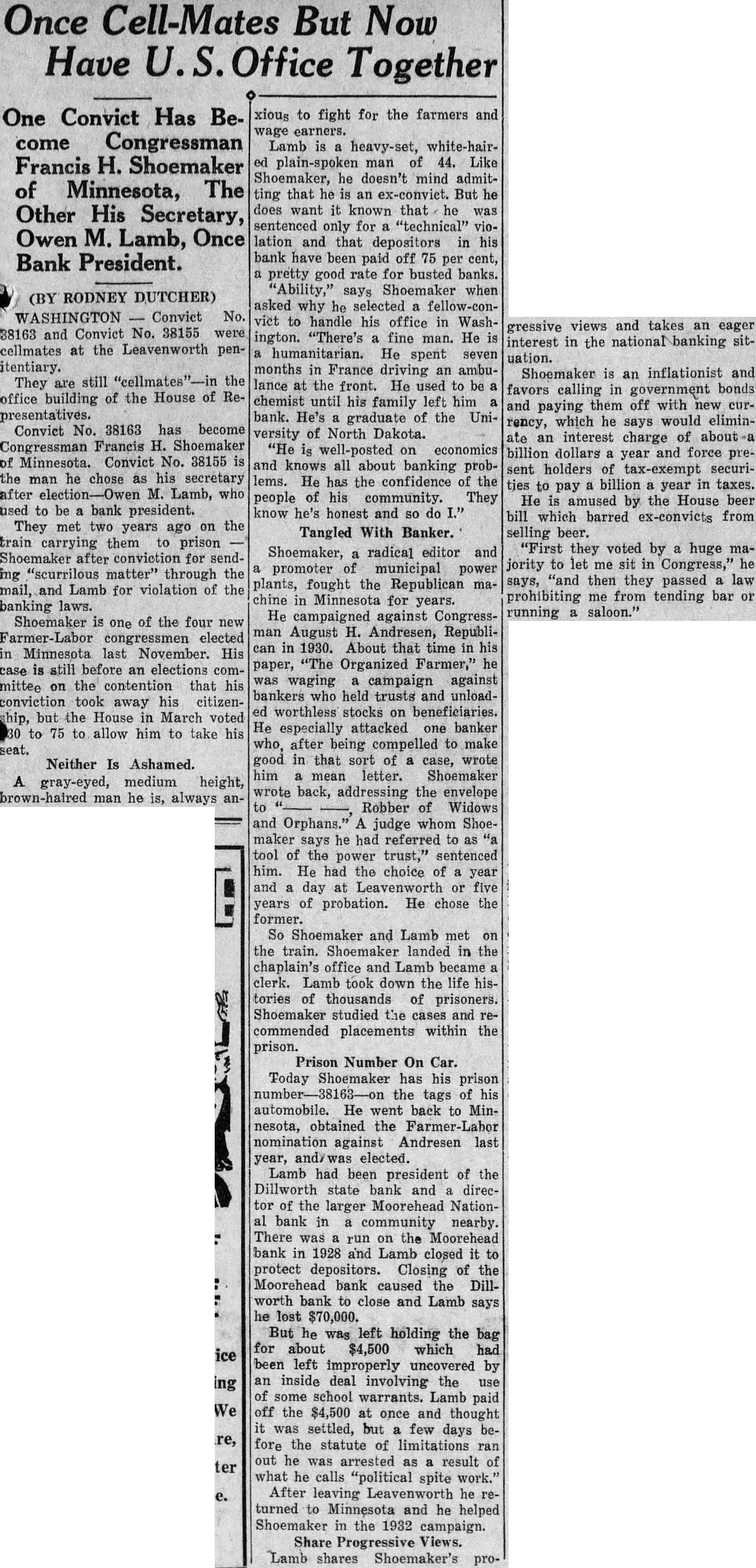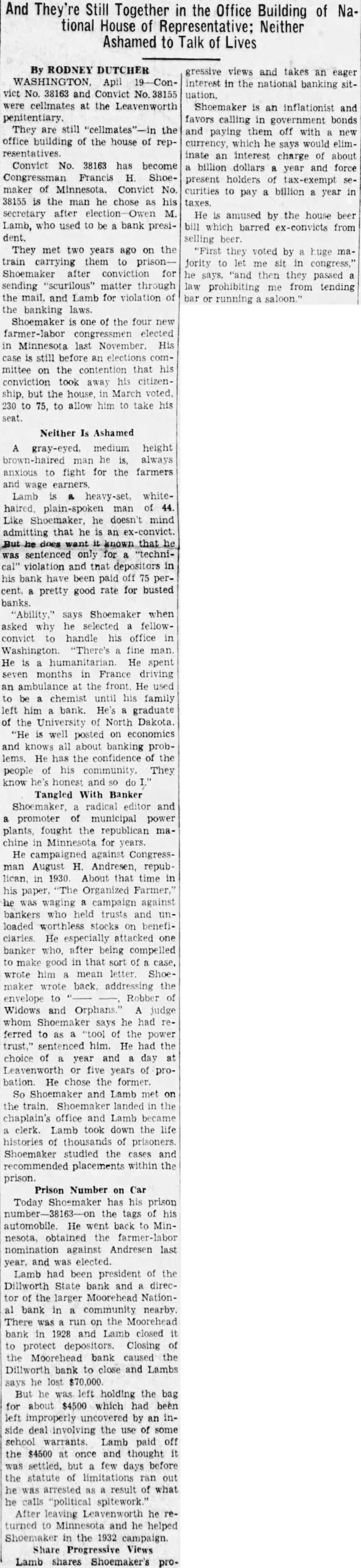 And They're Still Together in the Office Building of National House of Representative: Neither Ashamed to Talk of Lives By RODNEY DUTCHER Apil vict No. 38163 and Convict were cellmates at the Leavenworth penitentiary. They are still the office building of the house of repConvict No. 38163 has become Congressman Francis Shoemaker Minnesota. Convict No. 38155 the man he chose as his secretary after M. Lamb, who used to be bank president. They met two years ago on the train carrying them to Shoemaker after conviction for sending "scurilous" matter through the mail, and Lamb for violation of the banking laws. Shoemaker is of the four new farmer-labor congressmen elected in Minnesota last November. His case is still before an elections committee on the contention that his conviction took away his citizenship, but the house, in March voted. 230 to to allow him to take his seat. Neither Is Ashamed gray-eyed. medium height man he always anxious to fight for the farmers and wage Lamb whitehaired, man of 44. Like Shoemaker, he doesn't mind admitting that he an ex-convict. does sentenced only violation and that depositors in bank have been paid off 75 perpretty good rate for busted banks. says Shoemaker when asked why he selected fellowconvict to handle his office Washington. "There's fine man. He humanitarian. He spent seven months in France driving ambulance at the He used chemist until his family left him bank. He's graduate the University of North Dakota. "He is well posted on economics and knows all about banking problems. He has the confidence the people of his community. They know honest and Tangled With Banker gressive views and takes an eager interest in the national banking sitShoemaker is an inflationist and favors calling in government bonds and paying them off with new currency, which he says would eliminate an interest charge of about billion dollars year and force present holders of tax-exempt curities to pay billion year in taxes. He amused by the house beer bill which barred ex-convicts from selling beer. "First they voted by huge majority to let me sit in congress," he says, "and then they passed law prohibiting me from tending bar running saloon." Shoemaker, radical editor and promoter of municipal power plants, fought the republican machine in Minnesota for years. He campaigned against Congressman August H. Andresen, republican, in 1930. About that time his paper, "The Organized Farmer,' he was waging campaign against bankers who held trusts and loaded worthless stocks on beneficlaries He especially attacked one banker who, after being compelled to make good in that sort of case, wrote him mean letter. Shoemaker wrote back. addressing the envelope to Robber Widows and Orphans. judge whom Shoemaker says he had ferred to as "tool of the power sentenced him. He had the choice of year and day Leavenworth five years of probation. He chose the former. So Shoemaker and Lamb met on the train. landed the chaplain's office and Lamb became clerk. Lamb took down the life histories of thousands of prisoners. Shoemaker studied the cases and recommended placements within the prison. Prison Number on Car Today Shoemaker has his prison the tags of his automobile. He went back to Minnesota, obtained the nomination against Andresen last year, and was elected. Lamb had been president of the Dillworth State bank and director of the larger Moorehead Nationbank in community nearby. There was run on the Moorehead bank in 1928 and Lamb closed protect Closing the Moorehead bank caused the Dillworth bank to close and Lambs says he lost $70,000 But he was left holding the bag for about $4500 which had been improperly uncovered by inside deal involving the use of some school warrants. Lamb paid off the $4500 once and thought but few days before the statute of limitations ran out he arrested as result of what he calls "political spitework." After leaving Leavenworth he turned to Minnesota and he helped Shoemaker in the 1932 campaign. Share Progressive Views Lamb shares Shoemaker's pro-