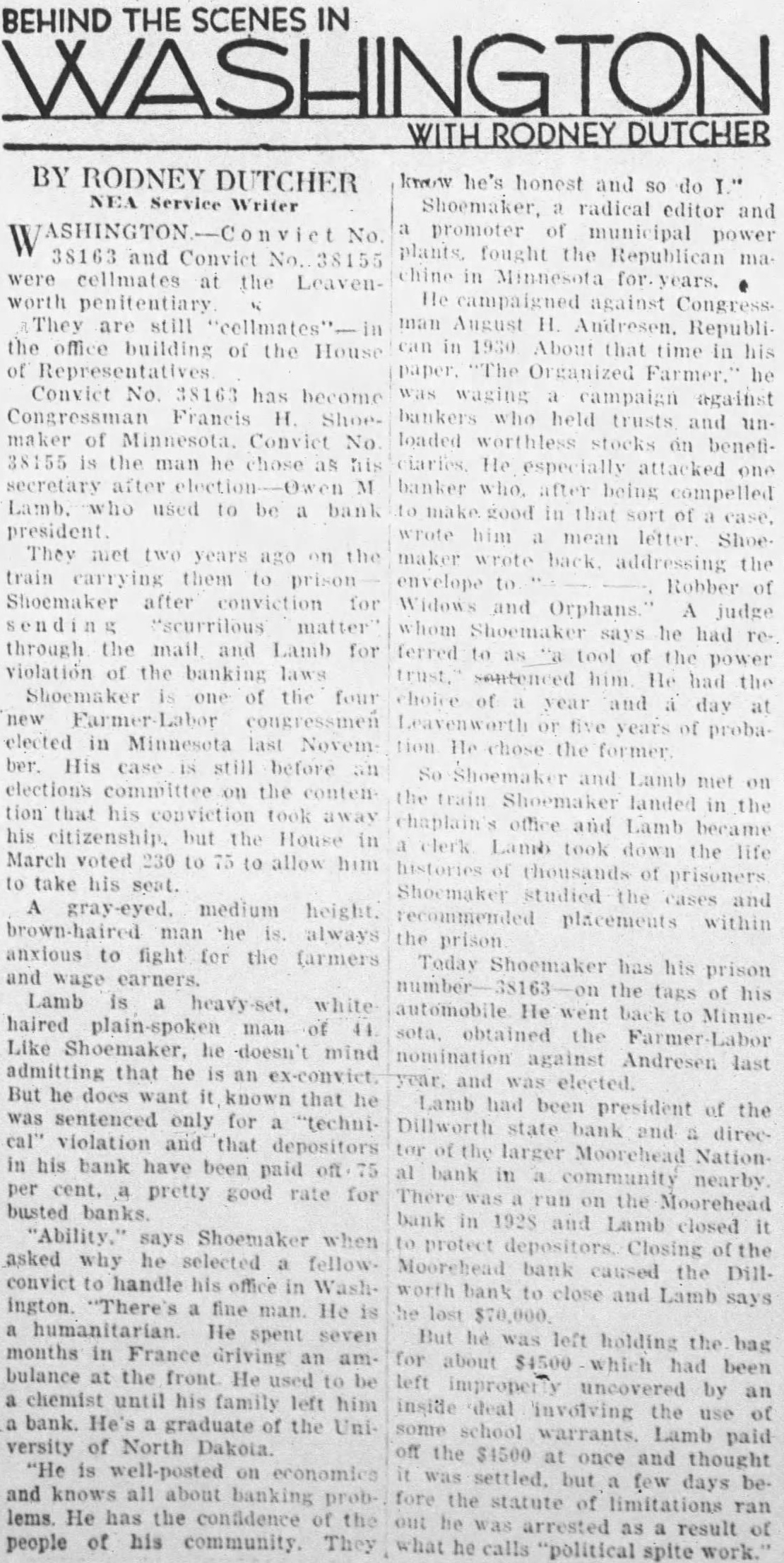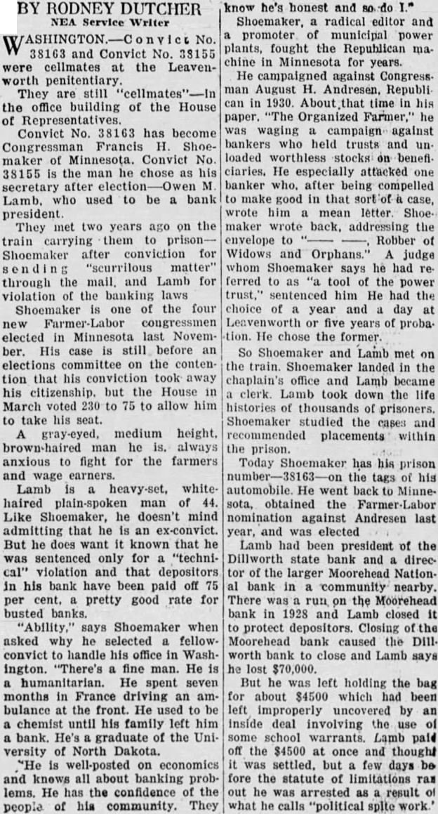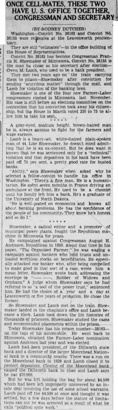 And They're Still Together in the Office Building of National House of Representative: Neither Ashamed to Talk of Lives By RODNEY DUTCHER Apil vict No. 38163 and Convict were cellmates at the Leavenworth penitentiary. They are still the office building of the house of repConvict No. 38163 has become Congressman Francis Shoemaker Minnesota. Convict No. 38155 the man he chose as his secretary after M. Lamb, who used to be bank president. They met two years ago on the train carrying them to Shoemaker after conviction for sending "scurilous" matter through the mail, and Lamb for violation of the banking laws. Shoemaker is of the four new farmer-labor congressmen elected in Minnesota last November. His case is still before an elections committee on the contention that his conviction took away his citizenship, but the house, in March voted. 230 to to allow him to take his seat. Neither Is Ashamed gray-eyed. medium height man he always anxious to fight for the farmers and wage Lamb whitehaired, man of 44. Like Shoemaker, he doesn't mind admitting that he an ex-convict. does sentenced only violation and that depositors in bank have been paid off 75 perpretty good rate for busted banks. says Shoemaker when asked why he selected fellowconvict to handle his office Washington. "There's fine man. He humanitarian. He spent seven months in France driving ambulance at the He used chemist until his family left him bank. He's graduate the University of North Dakota. "He is well posted on economics and knows all about banking problems. He has the confidence the people of his community. They know honest and Tangled With Banker gressive views and takes an eager interest in the national banking sitShoemaker is an inflationist and favors calling in government bonds and paying them off with new currency, which he says would eliminate an interest charge of about billion dollars year and force present holders of tax-exempt curities to pay billion year in taxes. He amused by the house beer bill which barred ex-convicts from selling beer. "First they voted by huge majority to let me sit in congress," he says, "and then they passed law prohibiting me from tending bar running saloon." Shoemaker, radical editor and promoter of municipal power plants, fought the republican machine in Minnesota for years. He campaigned against Congressman August H. Andresen, republican, in 1930. About that time his paper, "The Organized Farmer,' he was waging campaign against bankers who held trusts and loaded worthless stocks on beneficlaries He especially attacked one banker who, after being compelled to make good in that sort of case, wrote him mean letter. Shoemaker wrote back. addressing the envelope to Robber Widows and Orphans. judge whom Shoemaker says he had ferred to as "tool of the power sentenced him. He had the choice of year and day Leavenworth five years of probation. He chose the former. So Shoemaker and Lamb met on the train. landed the chaplain's office and Lamb became clerk. Lamb took down the life histories of thousands of prisoners. Shoemaker studied the cases and recommended placements within the prison. Prison Number on Car Today Shoemaker has his prison the tags of his automobile. He went back to Minnesota, obtained the nomination against Andresen last year, and was elected. Lamb had been president of the Dillworth State bank and director of the larger Moorehead Nationbank in community nearby. There was run on the Moorehead bank in 1928 and Lamb closed protect Closing the Moorehead bank caused the Dillworth bank to close and Lambs says he lost $70,000 But he was left holding the bag for about $4500 which had been improperly uncovered by inside deal involving the use of some school warrants. Lamb paid off the $4500 once and thought but few days before the statute of limitations ran out he arrested as result of what he calls "political spitework." After leaving Leavenworth he turned to Minnesota and he helped Shoemaker in the 1932 campaign. Share Progressive Views Lamb shares Shoemaker's pro-