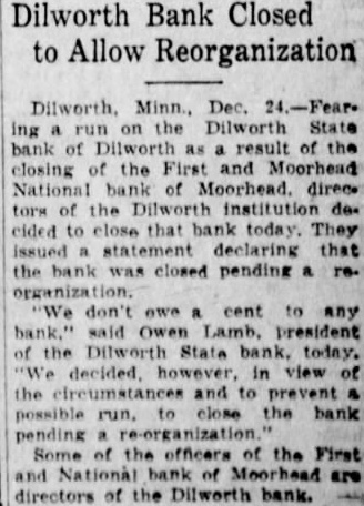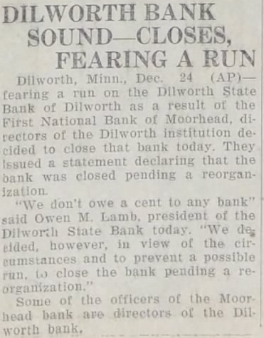 DILWORTH BANK CLOSES DOORS, FEARING RUN Dilworth, Minn., Dec. 24.-(AP) run on the Dilworth State Bank of Dilworth as result of the of the First and Moorhead National Bank of Moorhead directors of the Dilworth indecided to close that bank statement that the bank closed don't owe cent to any Owen M president of the Dilworth State Bank day of the circumstances and prevent possible to close the bank pending Some of the officers of the First and Moorhead National of Moorhead are directors of the Dilworth Re-Opening Plans Talked. for reorganization of the First National bank of closed Saturday by order of the board of are to be taken up immediately. it announced today by bank officials. The bank was closed pending reorganization, due to continued Leavy withdrawais of deposits resulting from "widespread false and vicious rumors,' according to officials The statement of the bank, issued Oct. 3. showed the bank had more than a quarter of million dollars, in quick consisting of Other bonds and securities and cash This statement showed capital surplus and profits with surplus and $1,954.14 in divided Since that time the undivided profits item had to $20 000 and Christmas greeting card published few days before the undivided profits of Bank officers maintain that the bank was and is in good condition. that there has been considerable liquidation this fall of their out standing loans and that the closing was decided upon solely to protect depositors and allow and reopening H. Wray has been placed receiver by Irwin charge Wright, chief bank examiner for this pending re-organization.