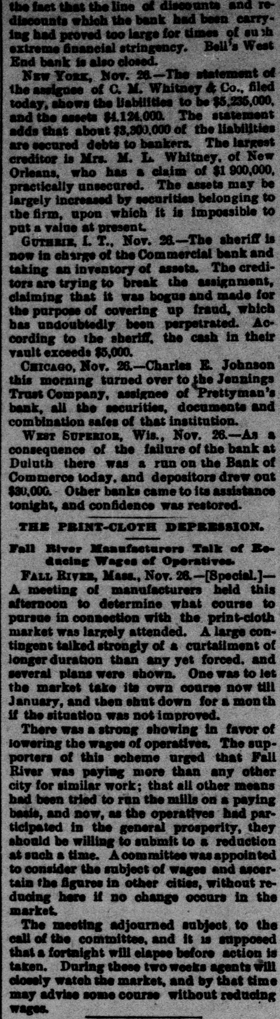 the fact that the line of discounts and rediscounts which the bank had been carrying had proved too large for times of su ch extreme financial stringency. Bell's West End bank is also closed. NEW YORK, Nov. 26-The statement of the assignee of C. M. Whitney & Co., filed today, shows the liabilities to be $5,235,000, and the assets $4,124,000. The statement adds that about $3,300,000 of the liabilities are secured debts to bankers. The largest creditor is Mrs. M. L Whitney. of New Orleans, who has a claim of $1 900,000, practically unsecured. The assets may be largely increased by securities belonging to the firm, upon which it is impossible to put a value at present. GUTHRIE, 1. T., Nov. 26-The sheriff is now in charge of the Commercial bank and taking an inventory of assets. The creditors are trying to break the assignment, claiming that it was bogus and made for the purpose of covering up fraud, which has undoubtedly been perpetrated. According to the sheriff, the cash in their vault exceeds $5,000. CHICAGO, Nov. 26.-Charles E. Johnson this morning turned over to the Jennings Trust Company, assignee of Prettyman's bank, all the securities, documents and combination safes of that institution. WEST SUPERIOR, Wis., Nov. 26.-As a consequence of the failure of the bank at Duluth there was a run on the Bank of Commerce today. and depositors drew out $30,000. Other banks came to its assistance tonight, and confidence was restored. THE PRINT-CLOTH DEPRESSION. Fall River Manufacturers Talk of Reducing Wages of Operatives. FALL RIVER, Mass., Nov. 26.-[Special.]A meeting of manufacturers held this afternoon to determine what course to pursue in connection with the print-cloth market was largely attended. A large contingent talked strongly of a curtailment of longer duration than any yet forced. and several plans were shown. One was to let the market take its own course now till January, and then shut down for a mon th if the situation was not improved. There was a strong showing in favor of lowering the wages of operatives. The supporters of this scheme urged that Fall River was paying more than any other city for similar work; that all other means had been tried to run the mills on a paying basis, and now, as the operatives had participated in the general prosperity, they should be willing to submit to a reduction at such a time. committee was appointed to consider the subject of wages and ascertain the figures in other cities, without reducing here if no change occurs in the market. The meeting adjourned subject to the call of the committee, and it is supposed that a fortnight will elapse before action is taken. During these two weeks agents will closely watch the market, and by that time may advise some course without reducing wages.