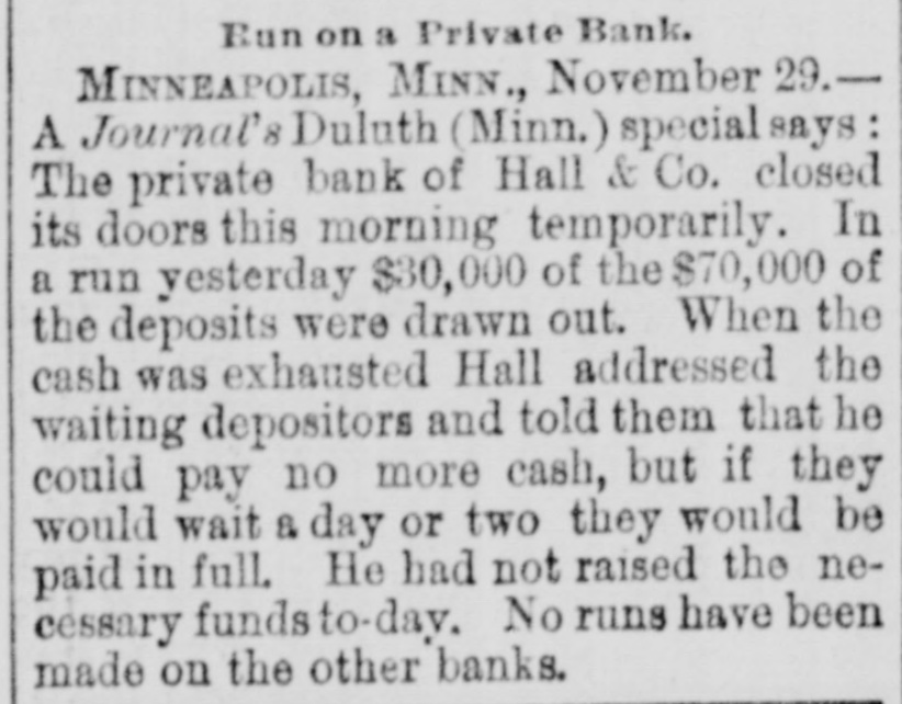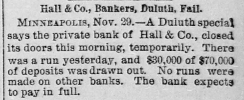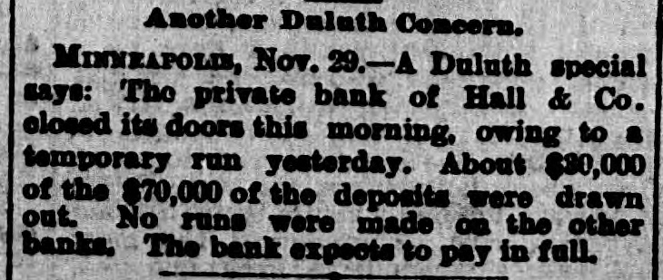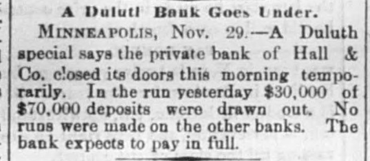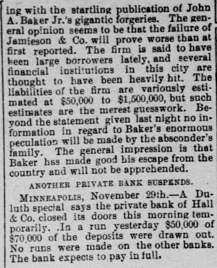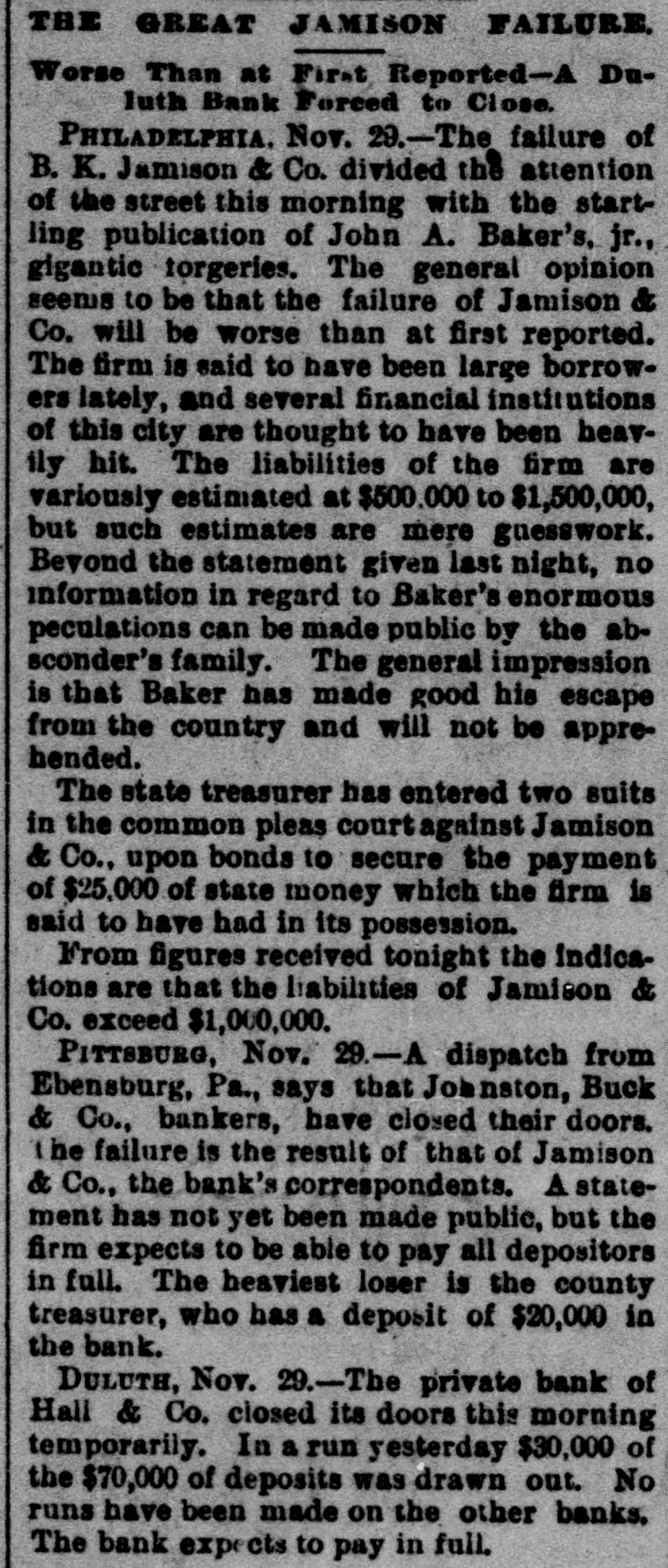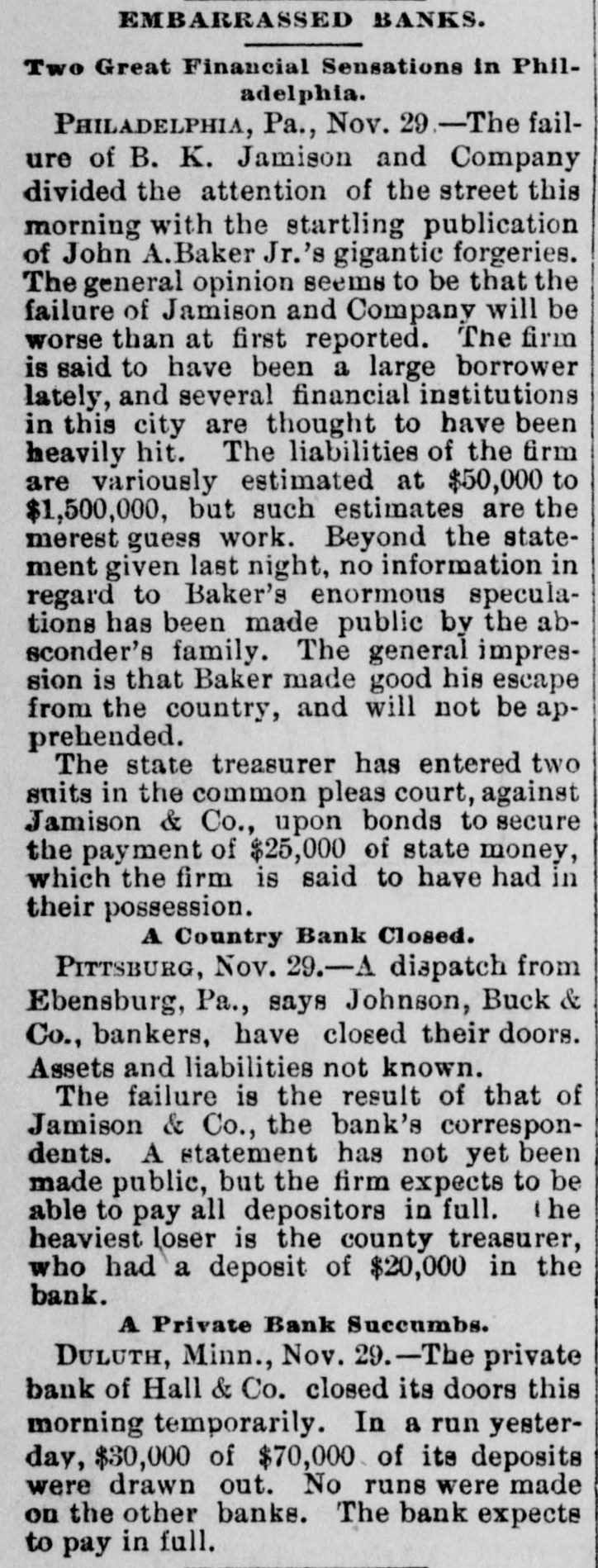 EMBARRASSED BANKS. Two Great Financial Sensations in Philadelphia. PAILADELPHIA, Pa., Nov. 29 - -The failure of B. K. Jamison and Company divided the attention of the street this morning with the startling publication of John A. Baker Jr.'s gigantic forgeries. The general opinion seems to be that the failure of Jamison and Company will be worse than at first reported. The firm is said to have been a large borrower lately, and several financial institutions in this city are thought to have been heavily hit. The liabilities of the firm are variously estimated at $50,000 to $1,500,000, but such estimates are the merest guess work. Beyond the statement given last night, no information in regard to Baker's enormous speculations has been made public by the absconder's family. The general impression is that Baker made good his escape from the country, and will not be apprehended. The state treasurer has entered two suits in the common pleas court, against Jamison & Co., upon bonds to secure the payment of $25,000 of state money, which the firm is said to have had in their possession. A Country Bank Closed. PITTSBURG, Nov. 29.-A dispatch from Ebensburg, Pa., says Johnson, Buck & Co., bankers, have closed their doors. Assets and liabilities not known. The failure is the result of that of Jamison & Co., the bank's correspondents. A statement has not yet been made public, but the firm expects to be able to pay all depositors in full. the heaviest loser is the county treasurer, who had a deposit of $20,000 in the bank. A Private Bank Succumbs. DULUTH, Minn., Nov. 29.-The private bank of Hall & Co. closed its doors this morning temporarily. In a run yesterday, $30,000 of $70,000 of its deposits were drawn out. No runs were made on the other banks. The bank expects to pay in full.