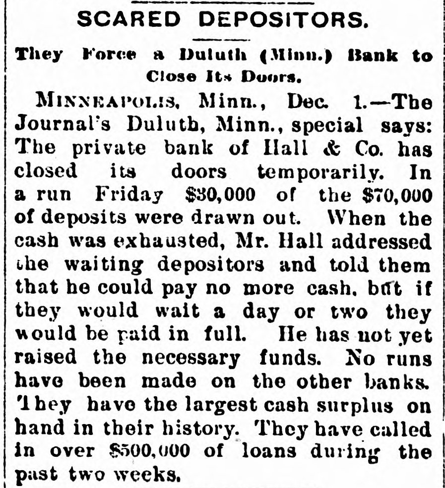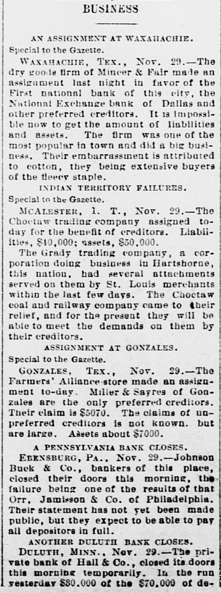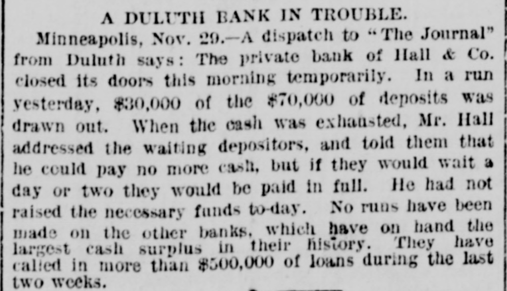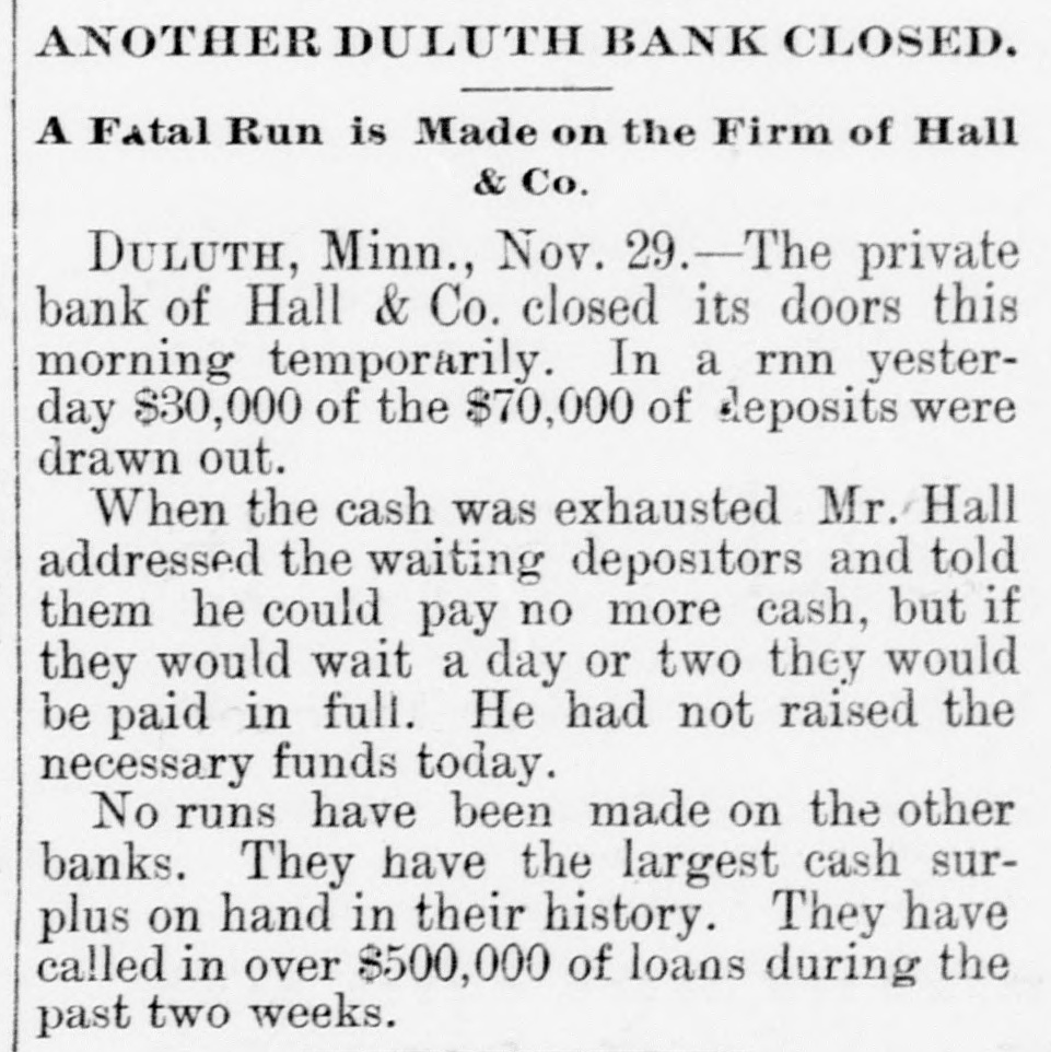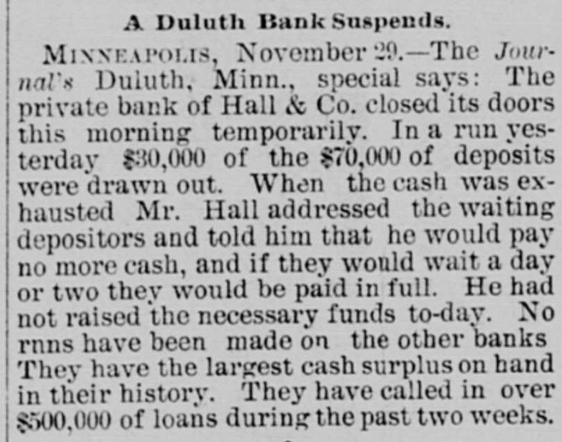 EMBARRASSED BANKS. Two Great Financial Sensations in Philadelphia. PAILADELPHIA, Pa., Nov. 29 - -The failure of B. K. Jamison and Company divided the attention of the street this morning with the startling publication of John A. Baker Jr.'s gigantic forgeries. The general opinion seems to be that the failure of Jamison and Company will be worse than at first reported. The firm is said to have been a large borrower lately, and several financial institutions in this city are thought to have been heavily hit. The liabilities of the firm are variously estimated at $50,000 to $1,500,000, but such estimates are the merest guess work. Beyond the statement given last night, no information in regard to Baker's enormous speculations has been made public by the absconder's family. The general impression is that Baker made good his escape from the country, and will not be apprehended. The state treasurer has entered two suits in the common pleas court, against Jamison & Co., upon bonds to secure the payment of $25,000 of state money, which the firm is said to have had in their possession. A Country Bank Closed. PITTSBURG, Nov. 29.-A dispatch from Ebensburg, Pa., says Johnson, Buck & Co., bankers, have closed their doors. Assets and liabilities not known. The failure is the result of that of Jamison & Co., the bank's correspondents. A statement has not yet been made public, but the firm expects to be able to pay all depositors in full. the heaviest loser is the county treasurer, who had a deposit of $20,000 in the bank. A Private Bank Succumbs. DULUTH, Minn., Nov. 29.-The private bank of Hall & Co. closed its doors this morning temporarily. In a run yesterday, $30,000 of $70,000 of its deposits were drawn out. No runs were made on the other banks. The bank expects to pay in full.