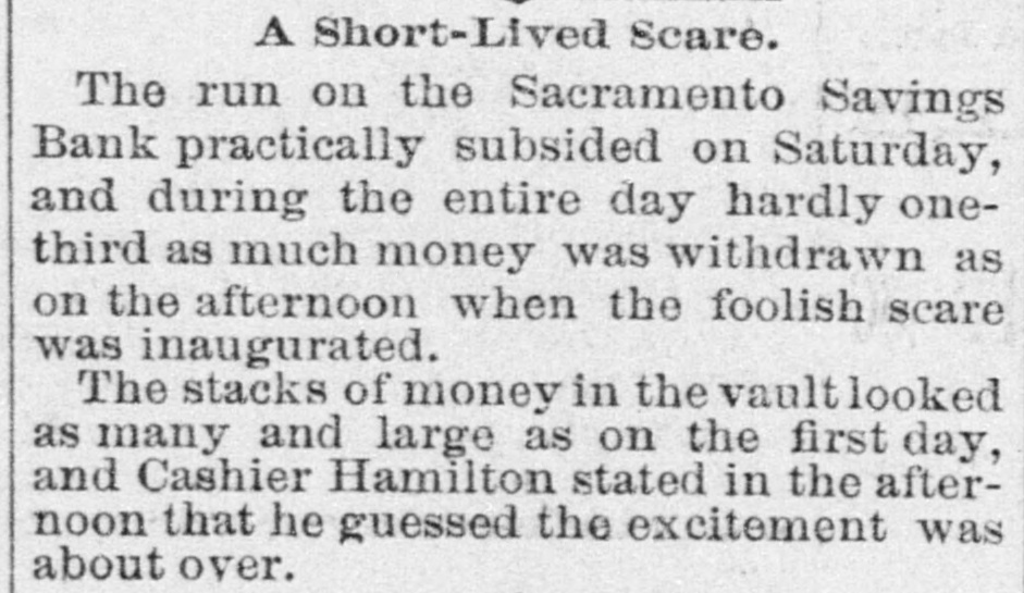 A Short-Lived Scare. The run on the Sacramento Savings Bank practically subsided on Saturday, and during the entire day hardly onethird as much money was withdrawn as on the afternoon when the foolish scare was inaugurated. The stacks of money in the vaultlooked as many and large as on the first day, and Cashier Hamilton stated in the afternoon that he guessed the excitement was about over.