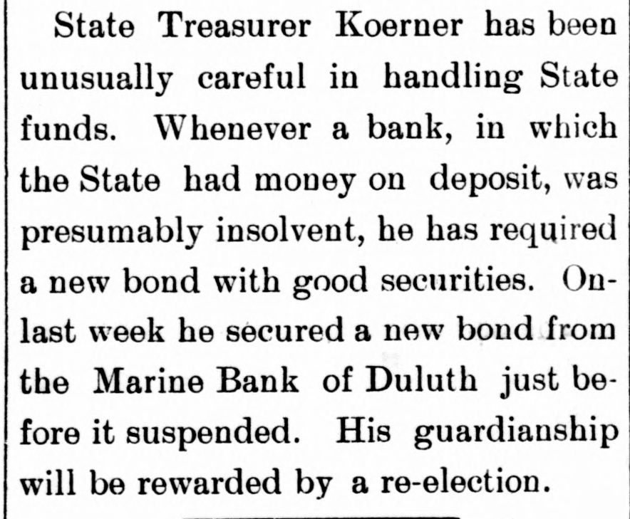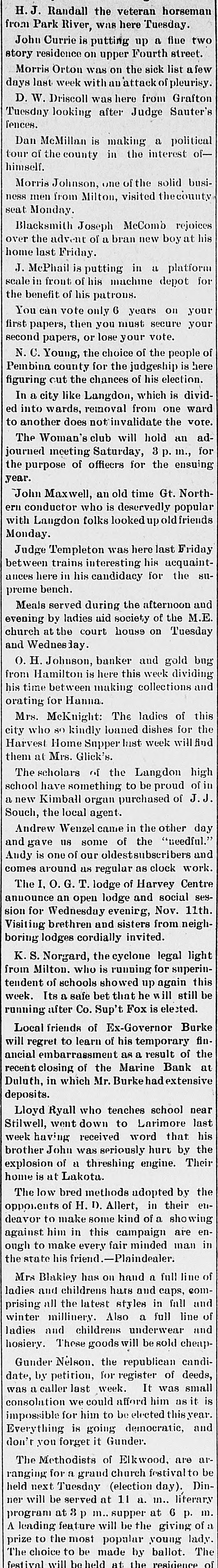 seat Monday. Blacksmith Joseph McComb rejoices over the advent of a bran new boy at his home last Friday. J. McPhail is putting in a platform scale in front of his machine depot for the benefit of his patrons. You can vote only 6 years on your first papers, then you must secure your second papers, or lose your vote. N. C. Young, the choice of the people of Pembina county for the judgeship is here figuring cut the chances of his election. In a city like Langdon, which is divided into wards, removal from one ward to another does not invalidate the vote. The Woman's club will hold an adjourned meeting Saturday, 3 p. m., for the purpose of offiecrs for the ensuing year. John Maxwell, an old time Gt. Northern conductor who is deservedly popular with Langdon folks looked up old friends Monday. Judge Templeton was here last Friday between trains interesting his acquaintances here in his candidacy for the supreme bench. Meals served during the afternoon and evening by ladies aid society of the M.E. church at the court house on Tuesday and Wednesday. O. H. Johnson, banker and gold bug from Hamilton is here this week dividing his time between making collections and orating for Hanna. Mrs. McKnight: The ladies of this city who 80 kindly loaned dishes for the Harvest Home Supper last week will find them at Mrs. Glick's. The scholars of the Langdon high school have something to be proud of in a new Kimball organ purchased of J.J. Souch, the local agent. Andrew Wenzel came in the other day and gave us some of the "needful." Andy is one of our oldestsubscribers and comes around as regular as clock work. The I, O. G. T. lodge of Harvey Centre announce an open lodge and social session for Wednesday evening, Nov. 11th. Visiting brethren and sisters from neighboring lodges cordially invited. K. S. Norgard, the cyclone legal light from Milton. who is running for superintendent of schools showed up again this week. Its a safe bet that he will still be running after Co. Sup't Fox is elected. Local friends of Ex-Governor Burke will regret to learn of his temporary financial embarrassment as a result of the recent closing of the Marine Bank at Duluth, in which Mr. Burkehad extensive deposits. Lloyd Ryall who teaches school near Stilwell, went down to Larimore last week having received word that his brother John was seriously huru by the explosion of a threshing engine. Their home is at Lakota. The low bred methods adopted by the opponents of H. D. Allert, in their endeavor to make some kind of a showing against him in this campaign are enough to make every fair minded man in the state his friend.-Plaindealer. Mrs Blakley has on hand a full line of ladies and childrens hars and caps, comprising all the latest styles in fall and winter millinery. Also a full line of ladies and childrens underwear and hosiery. These goods will be sold cheapGunder Nelson. the republican candi-