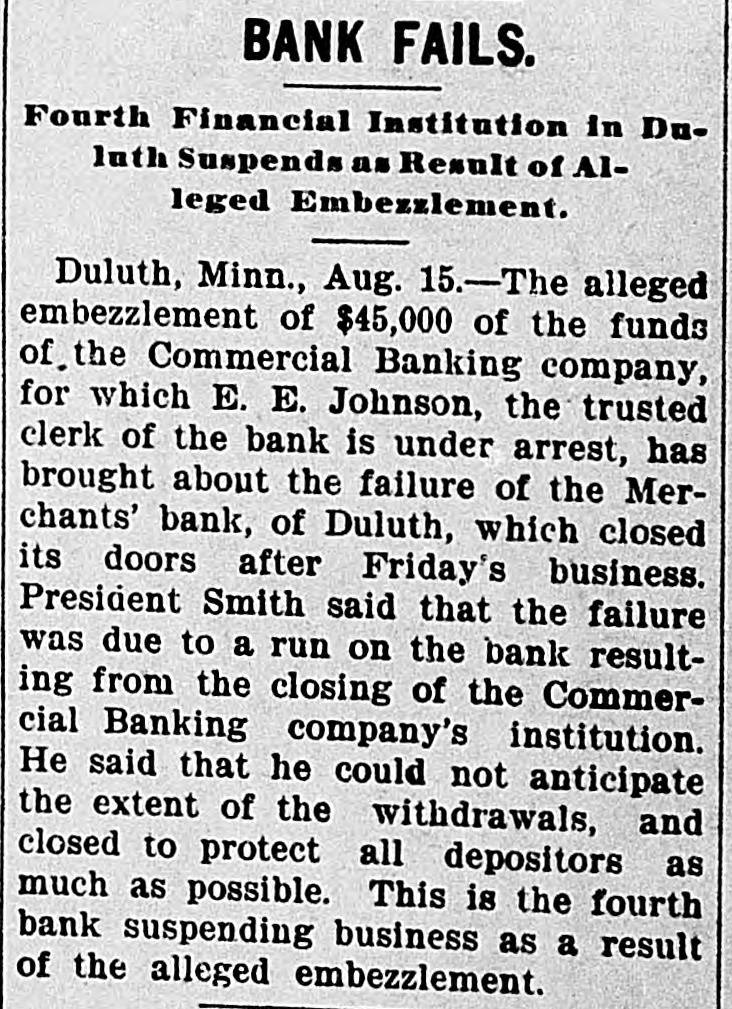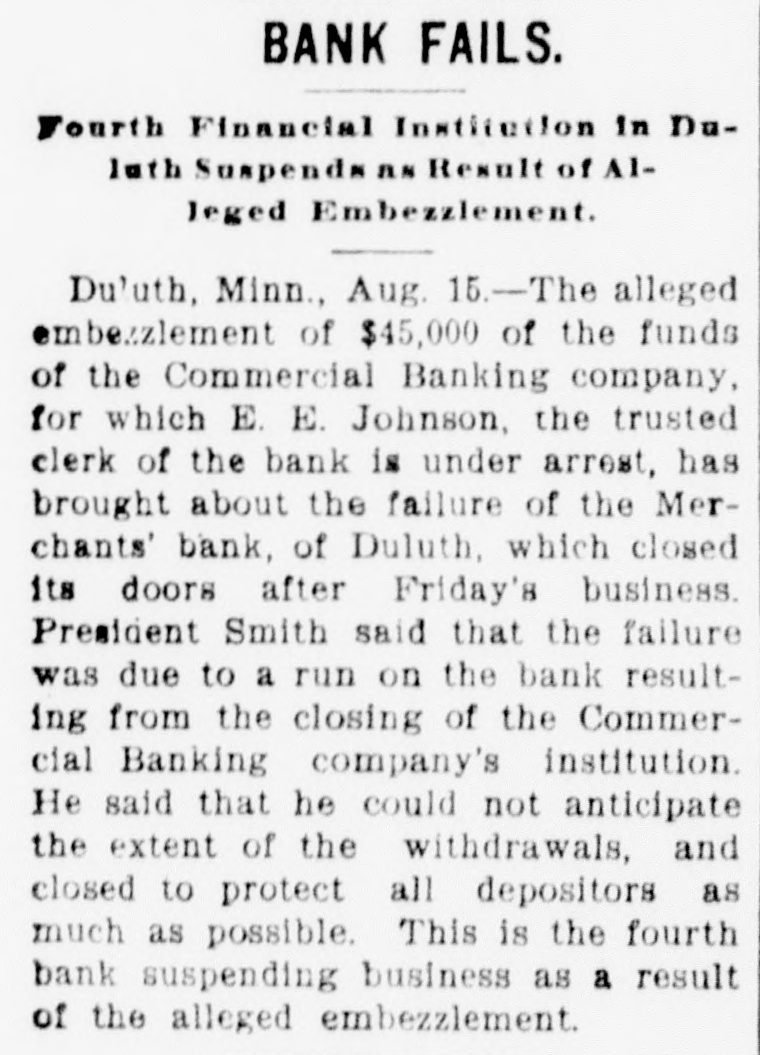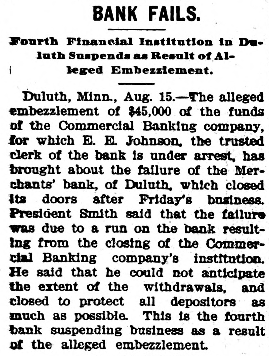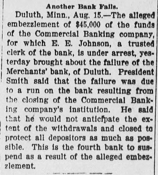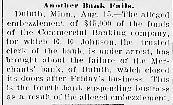 BANK FAILS. Fourth Financial Institution in Duluth Suspends as Result of Alleged Embezzlement. Duluth, Minn., Aug. 15.-The alleged embezzlement of $45,000 of the funds of the Commercial Banking company, for which E. E. Johnson, the trusted clerk of the bank is under arrest, has brought about the failure of the Merchants' bank, of Duluth, which closed its doors after Friday's business. President Smith said that the failure was due to a run on the bank resulting from the closing of the Commercial Banking company's institution. He said that he could not anticipate the extent of the withdrawals, and closed to protect all depositors as much as possible. This is the fourth bank suspending business as a result of the alleged embezzlement.