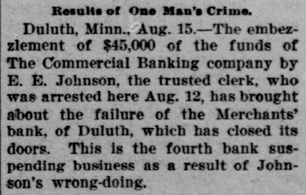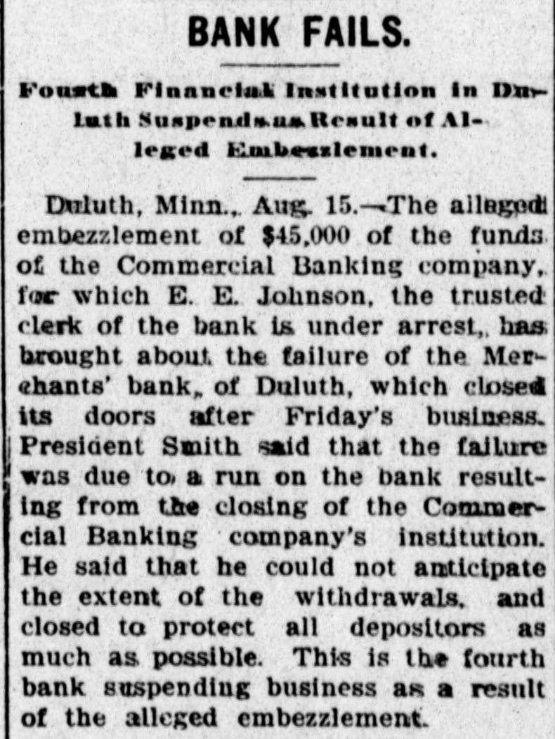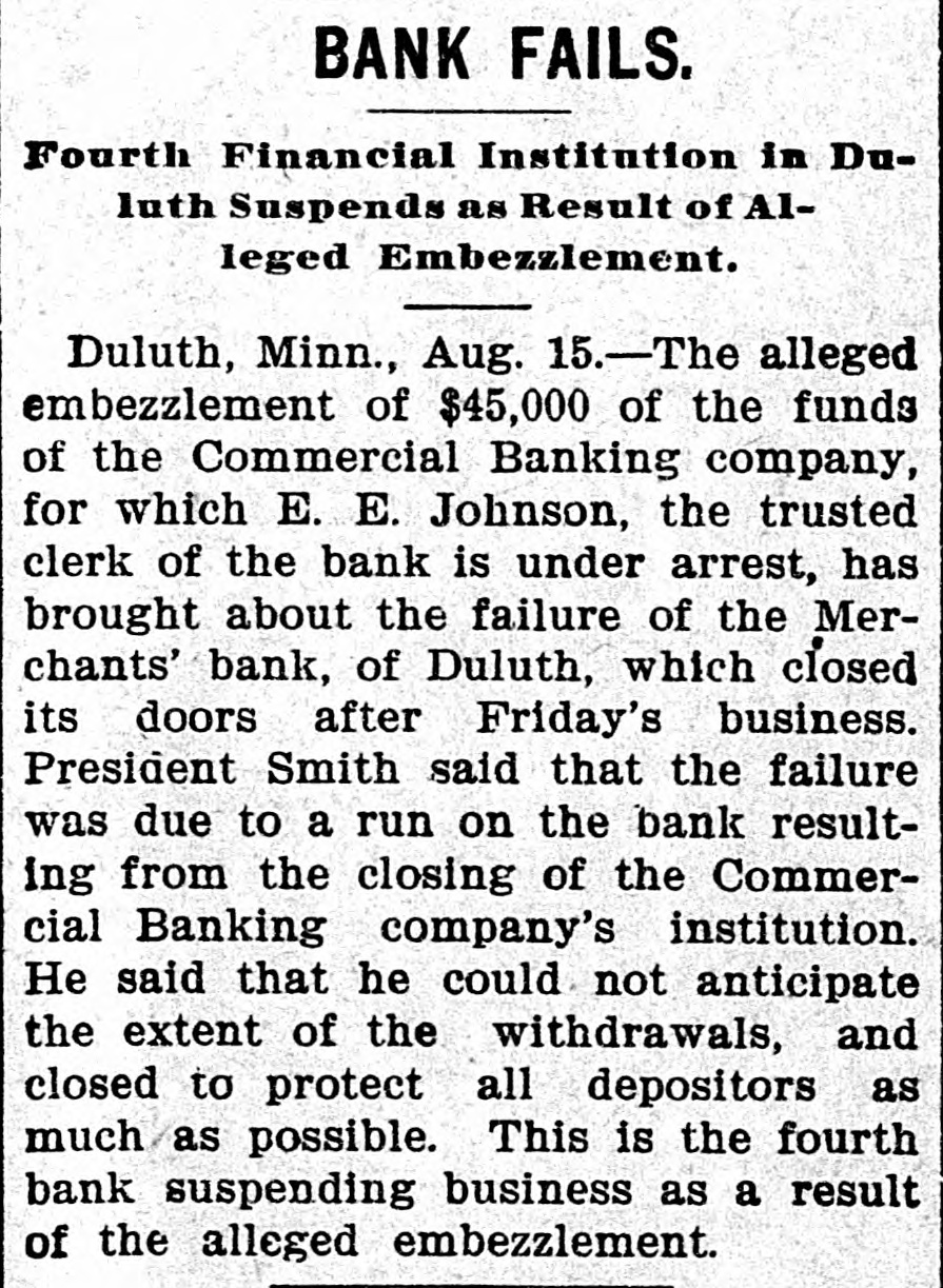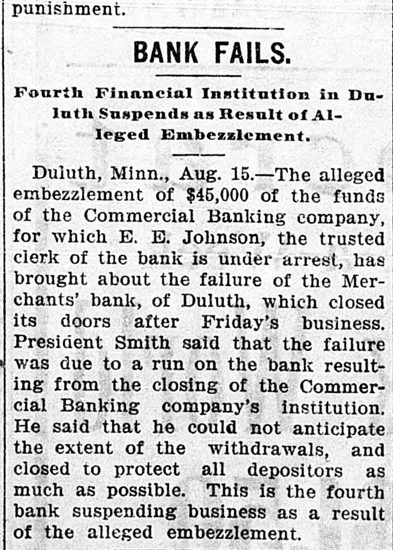 BANK FAILS. Fourth Financial Institution in Duluth Suspends as Result of Alleged Embezzlement. Duluth, Minn., Aug. 15.-The alleged embezzlement of $45,000 of the funds of the Commercial Banking company, for which E. E. Johnson, the trusted clerk of the bank is under arrest, has brought about the failure of the Merchants' bank, of Duluth, which closed its doors after Friday's business. President Smith said that the failure was due to a run on the bank resulting from the closing of the Commercial Banking company's institution. He said that he could not anticipate the extent of the withdrawals, and closed to protect all depositors as much as possible. This is the fourth bank suspending business as a result of the alleged embezzlement.