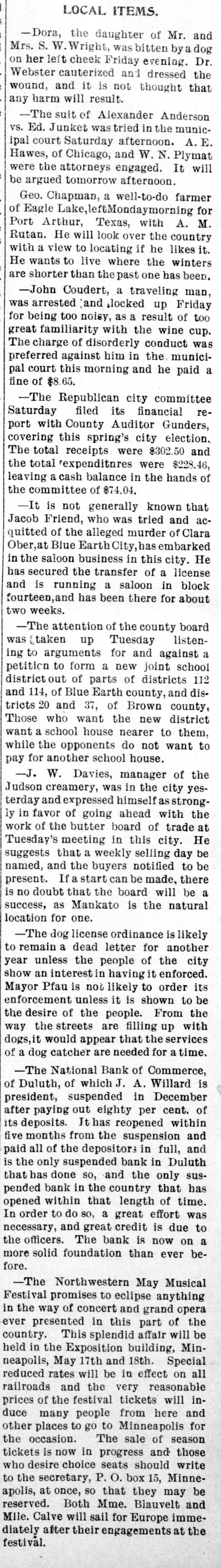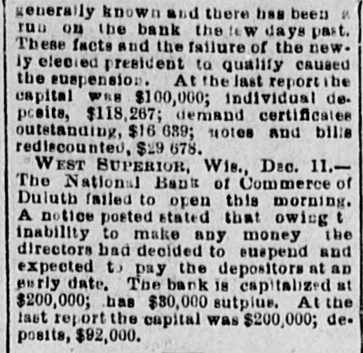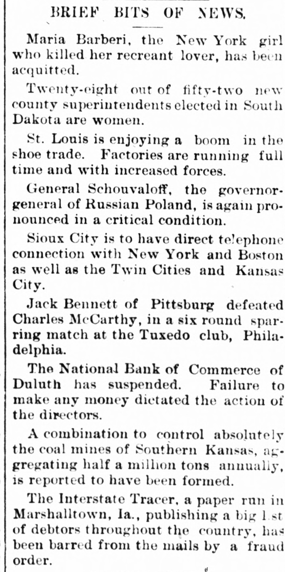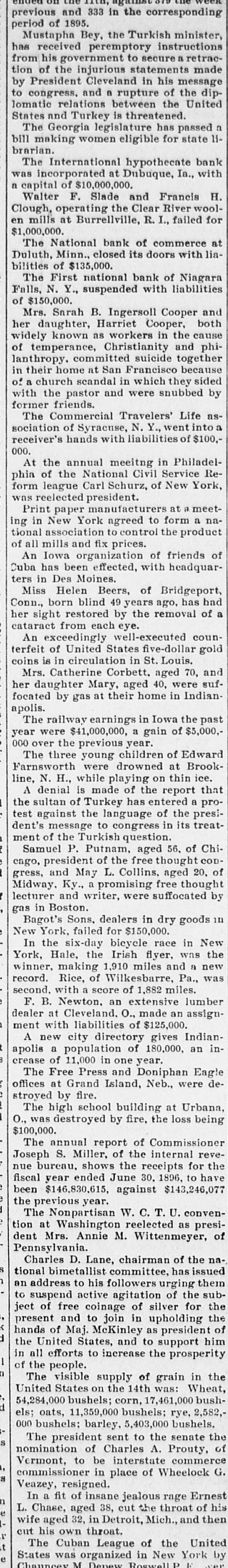 ended on the 11th, against one week previous and 333 in the corresponding period of 1895. Mustapha Bey, the Turkish minister, has received peremptory instructions from his government to secure a retraction of the injurious statements made by President Cleveland in his message to congress. and a rupture of the diplomatic relations between the United States and Turkey is threatened. The Georgia legislature has passed a bill making women eligible for state librarian. The International hypothecate bank was incorporated at Dubuque, Ia., with a capital of $10,000,000. Walter F. Slade and Francis H. Clough, operating the Clear River woolen mills at Burrellville, R. I., failed for $1,000,000. The National bank of commerce at Duluth, Minn.. closed its doors with liabilities of $135,000. The First national bank of Niagara Falls, N. Y., suspended with liabilities of $150,000. Mrs. Sarah B. Ingersoll Cooper and her daughter, Harriet Cooper, both widely known as workers in the cause of temperance, Christianity and philanthropy. committed suicide together their home at San Francisco because of in a church scandal in which they sided with the pastor and were snubbed by former friends. The Commercial Travelers' Life association of Syracuse, N. Y., went into receiver's hands with liabilities of $100,000. At the annual meeiting in Philadel- Reof the National Civil Service phia form league Carl Schurz, of New York, was reelected president. Print paper manufacturers at a meetin New York agreed to form a naing tional association to control the product of all mills and fix prices. An Iowa organization of friends of Cuba has been effected, with headquarters in Des Moines. Miss Helen Beers, of Bridgeport, Conn., born blind 49 years ago, has had her sight restored by the removal of a cataract from each eye. An exceedingly well-executed counterfeit of United States five-dollar gold coins is in circulation in St. Louis. Mrs. Catherine Corbett, aged 70, and daughter Mary, aged 40, were sufher focated by gas at their home in Indianapolis. The railway earnings in Iowa the past year were $41,000,000, a gain of $5,000,000 over the previous year. The three young children of Edward were drowned at BrookH., while playing on is made of the that line, Farnsworth A denial N. report thin ice. the sultan of Turkey has entered a protest against the language of the presi- treatdent's message to congress in its ment of the Turkish question. Samuel P. Putnam, aged 56. of Chipresident of the free thought con of gress, cago, and May L. Collins. aged 20, Midway. Ky., a promising free thought by lecturer and writer, were suffocated gas in Boston. Bagot's Sons. dealers in dry goods in New York, failed for $150,000. In the six-day bicycle race in New the York, Hale, the Irish flyer, was winner, making 1,910 miles and a new was record. Rice, of Wilkesbarre, Pa., second. with a score of 1,882 miles. F. B. Newton. an extensive lumber dealer at Cleveland. O., made an assignment with liabilities of $125,000. A new city directory gives Indian- inapolis a population of 180,000, an crease of 11,000 in one year. The Free Press and Doniphan Eagle deoffices at Grand Island, Neb., were stroyed by fire. The high school building at Urbana, O., was destroyed by fire, the loss being $100,000. The annual report of Commissioner S. Miller, of the internal reve- the Joseph bureau, shows the receipts for nue fiscal year ended June 30. 1896, to have been $146,830,615. against $143,246,077 the previous year. The Nonpartisan W. C. T. U. convenat Washington reelected as presi- of tion dent Mrs. Annie M. Wittenmeyer, S Pennsylvania. Charles D. Lane, chairman of the nah bimetallist committee, has issued to his followers an active agitation tional suspend address silver urging of the for them sub- the ject to of free coinage of the k present and to join in upholding d hands of Maj. McKinley as president him of the United States, and to support I in all efforts to increase the prosperity 0 of The the people. visible supply of grain in the United States on the 14th was: Wheat, bushd 54,284,000 bushels: corn, 17,461,000 2,582,els; oats, 11,359,000 bushels; rye, 000 bushels: barley. 5,403,000 bushels. is The president sent to the senate the of nomination of Charles A. Prouty, , to be interstate commerce G. a commissioner Vermont, in place of Wheelock Veazey, resigned. n In fit of insane jealous rage Ernest his e Chase, a aged 38, cut the throat of then wife L. aged 32, in Detroit, Mich., and 1 cut his own throat. it The Cuban League of the United e was organized in New York by M Chauncev States Denew Roswell