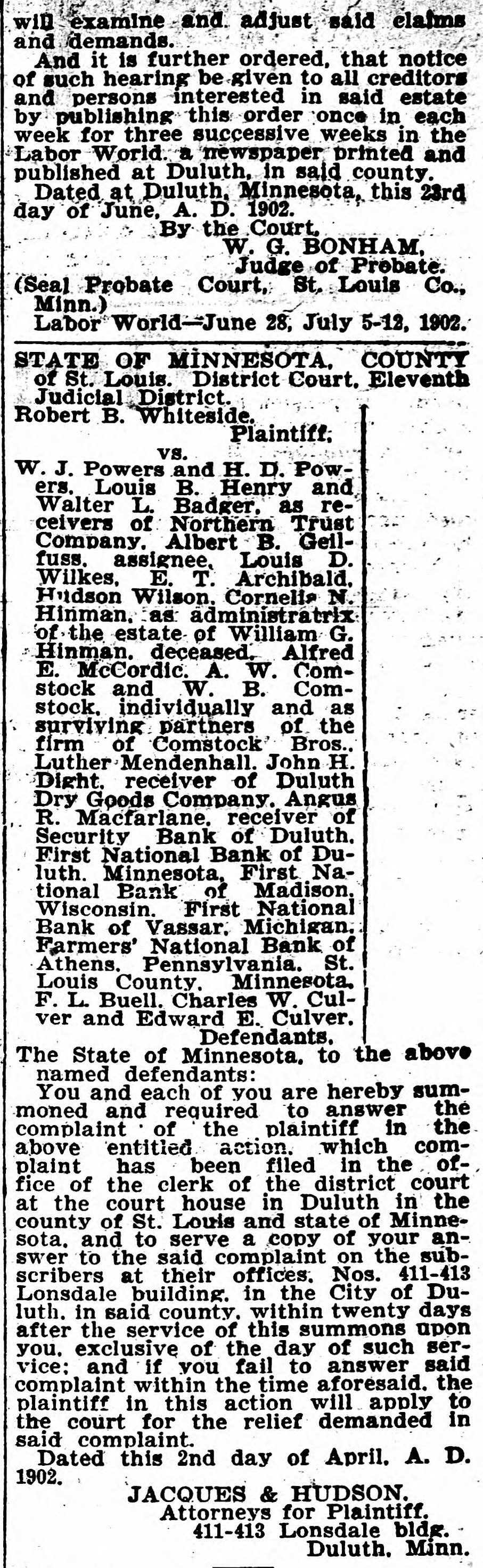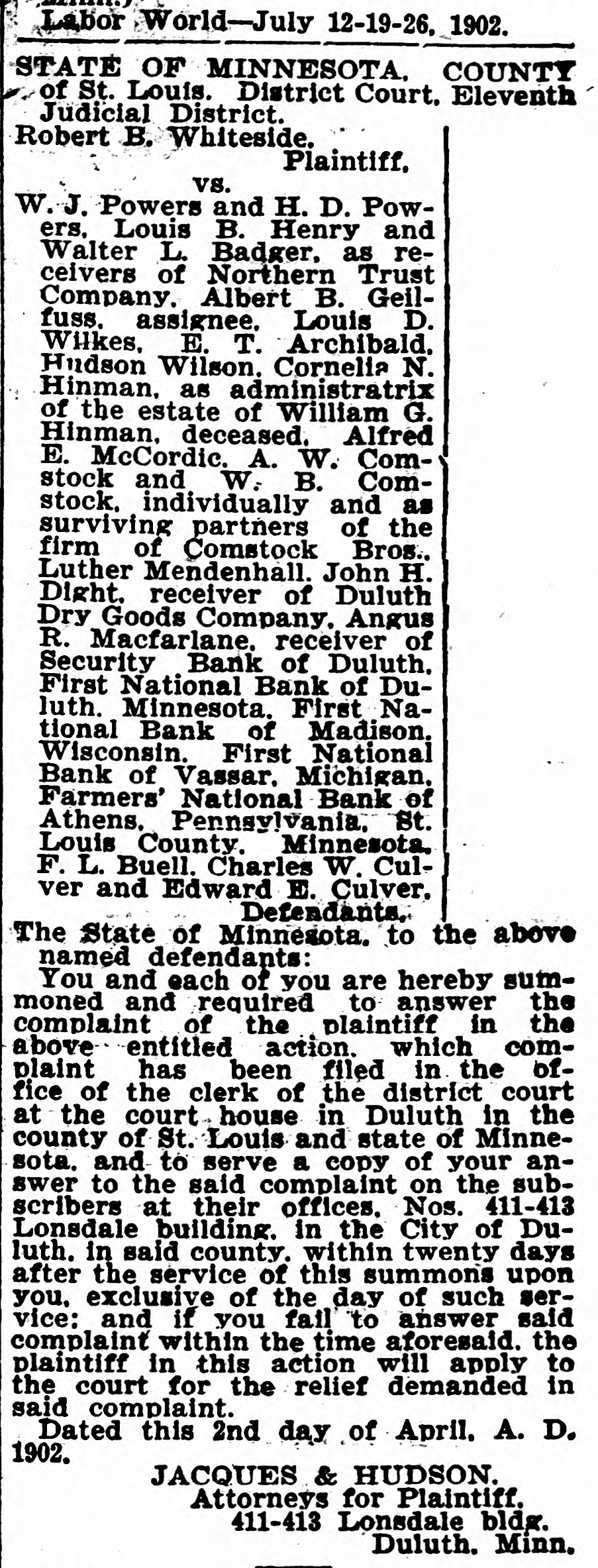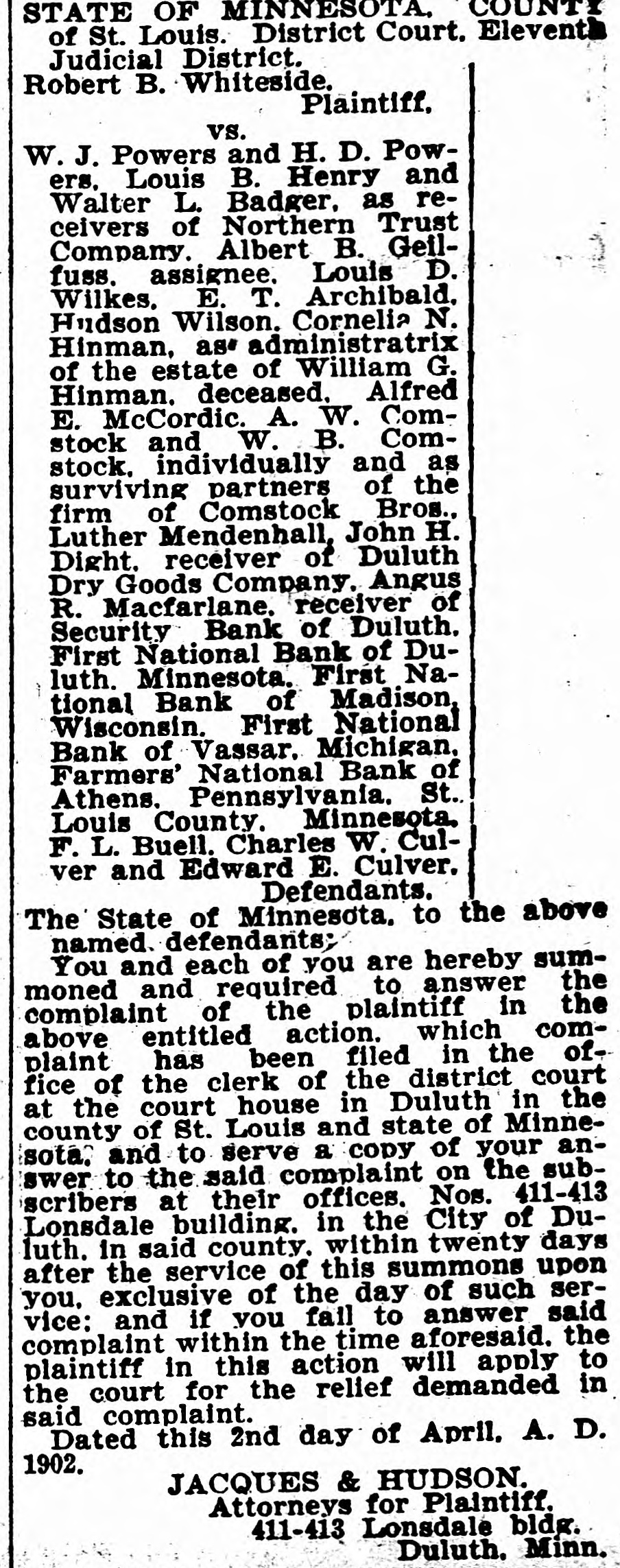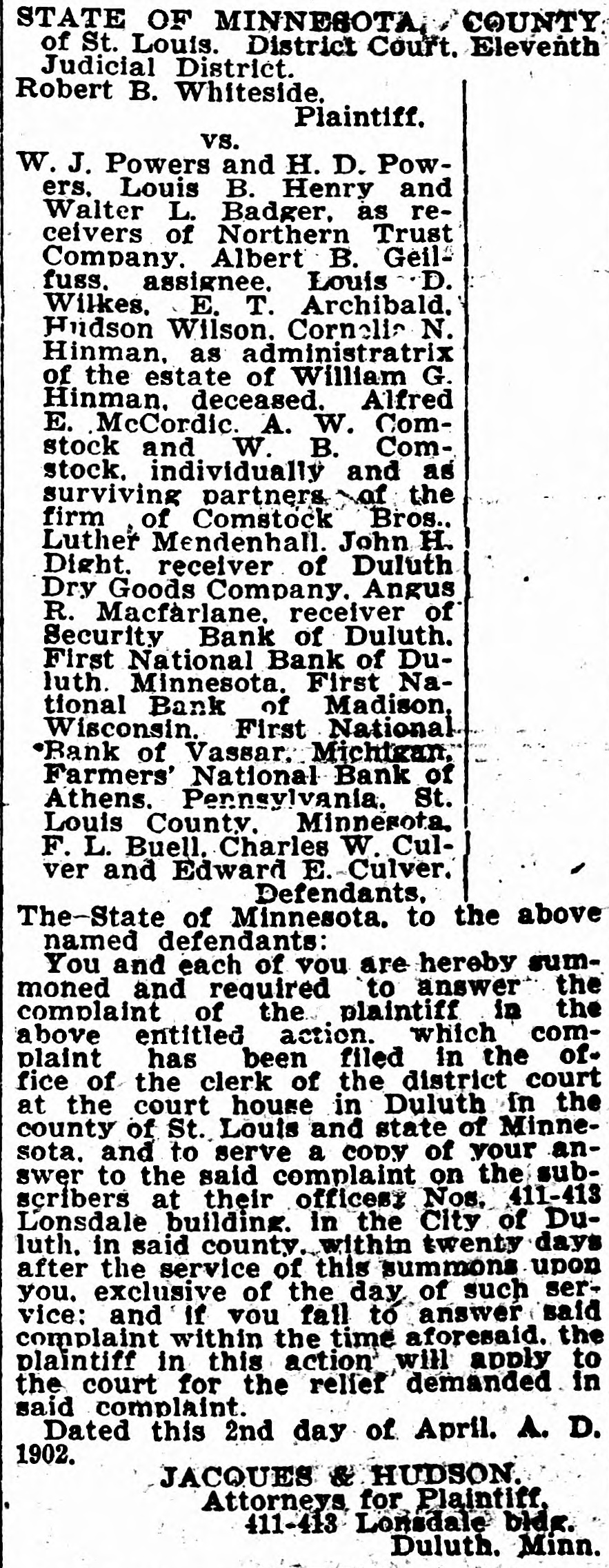 STATE OF MINNESOTA. COUNTI of St. Louis. District Court. Elevent Judicial District. Robert B. Whiteside. Plaintiff. vs. W. J. Powers and H. D. Powers, Louis B. Henry and Walter L. Badger, as receivers of Northern Trust Company. Albert B. Geilfuss. assignee. Louis D. Wilkes, E. T. Archibald. Hudson Wilson. Cornelia N. Hinman, as administratrix of the estate of William G. Hinman. deceased. Alfred E. McCordic. A. W. Comstock and W. B. Comstock. individually and as surviving partners of the firm of Comstock Bros., Luther Mendenhall, John H. Dight. receiver of Duluth Dry Goods Company. Angus R. Macfarlane. receiver of Security Bank of Duluth. First National Bank of Duluth. Minnesota. First National Bank of Madison, Wisconsin. First National Bank of Vassar. Michigan. Farmers' National Bank of Athens. Pennsylvania. St.. Louis County. Minnesota. F. L. Buell. Charles W. Culver and Edward E. Culver. Defendants. The State of Minnesota. to the above named. defendants: You and each of you are hereby summoned and required to answer the complaint of the plaintiff in the above entitled action. which complaint has been filed in the office of the clerk of the district court at the court house in Duluth in the county of St. Louis and state of Minnesota. and to serve a copy of your answer to the said complaint on the subscribers at their offices. Nos. 411-413 Lonsdale building. in the City of Duluth. in said county. within twenty days after the service of this summons upon you, exclusive of the day of such service: and if you fail to answer said complaint within the time aforesaid. the plaintiff in this action will apply to the court for the relief demanded in said complaint. Dated this 2nd day of April. A. D. 1902. JACQUES & HUDSON. Attorneys for Plaintiff. 411-413 Lonsdale bldg. Duluth. Minn.