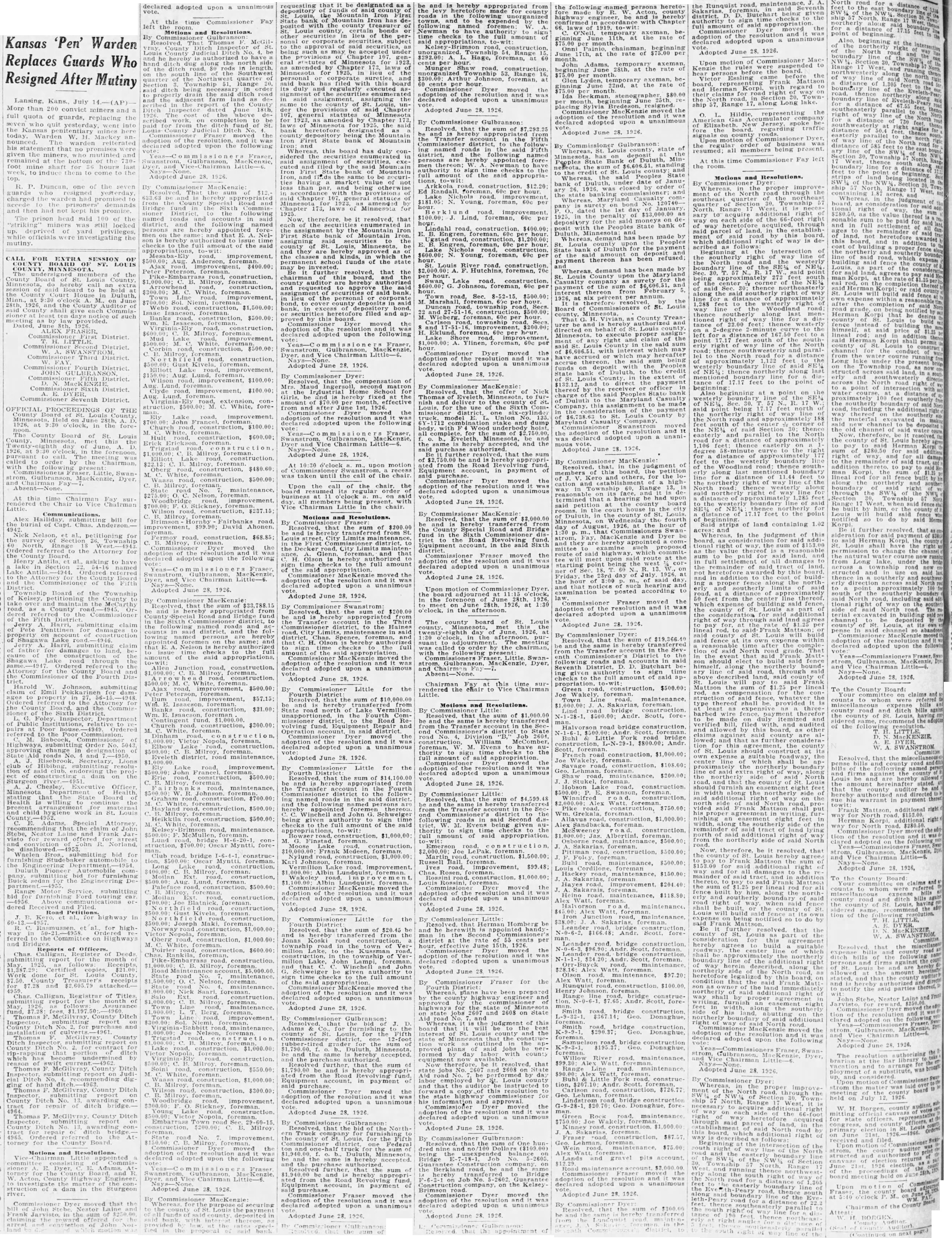 Kansas 'Pen' Warden Replaces Guards Who Resigned After Mutiny Lansing, Kans., July More than convict miners and full quota of guards, replacing the quit yesterday into the Kansas penitentiary today, Warden W. H. nounced. warden his statement that no given the miners, mutinied remained bottom last to to come the Duncan, of the seven guards charged then his prison head said of the locked up. the mutiny CALL FOR EXTRA SESSION OF of the County Louis hereby Board be M., 28th, the such meeting provided. June ALEX District. District. Third District. Fourth District. JOHN Fifth District. Sixth District. Seventh District. OFFICIAL PROCEEDINGS OF THE County June 1926. at in the foreCounty Board of St. Louis 1926. the The called to order by the Chairman, the SwanMacKenzie, Dyer, At this time Chair to Vice Little. bill for the of Chas. Nick Nelson, al., for the survey Range the Attorney for the Board. Henry al., asking to have lake in Section named Ordered the of the Fifth Township Board of the Township Kelsey the and the the the Fifth submitting claim Pete damages property on account Shagawa Harri, submitting claim for Shagawa Lake road through Ordered the Attorney for Board of Fourth Harold Johnson, submitting claim Emil for ages and Sixth District Public Poor house Poor Highways, Order change roads the Sturgeon Officer Minnesota Health State Health willing in St. Adams, Special that Stebe, R. submitting bid for Automobile sedan Motor submitting bid Ford dered Road Petitions R. et for high the Committee on Highways Reports of Officers. Chas Deeds report month copies, Louis County receipts Chas Calligan, Registrar Titles month follows Thomas F. Ditch County Ditch Thomas County County ditch which reason Ditch dig ging McGilvray County Ditch County tract for of ditch Thomas F. McGilyray. County Ditch County ditch Ordered torney for County Motions and Resolutions. sioner torney for struction dam in the Sturgeon Dyer that John Frank in the sum declared adopted upon unanimous this time Commissioner Fay left Motions and Resolutions. By Commissioner Gulbranson: That Ditch of County Louis County Ditch and he to side hand dug along the of 80 rods the the quarter Range ditch being order drain the County Ditch June 18th, 1926. depaid St. Fraser moved the adoption and adopted upon the following Fraser, and Little-6. Adopted June 28. 1926. By MacKenzie: Road fund in Commisfollowing named roads and accounts district, the following appointed the that Nelissue time amount of the said Aug. Anderson, Ajax $400.00; foreman. construction, Milroy, foreman. White, foreman. road, improvement, $1,500.00; construction, B. Milroy, Mud Lake improvement, road, Gust Kivela. Elliott improvement, $100.00 Aug. Clyde road, improvement, foreman. road, construction, White, foreman. Lake road. improvement, Erick foreman. Trigstad Milroy, Elliott construction, B. foreman. construction, M. improvement, Milroy, Fairbanks road, $99.90; David Ahonen, construction, $68.85; C. Dyer moved the adoption declared adopted upon the following Fraser, and Vice Chairman Little-6. Adopted June 28, 1926. By MacKenzie: that sum of $33,788.15 be and from Road and Bridge fund Sixth district, named roads and counts in district. the on the Nelson time amount of said appropriations, Junction road, construction, B. foreman. road, $500.00 improvement, $57.15; $1,000.00. Church $300.00 M. Nopola, Elbow construction, district, road maintenance, $1 John road, maintenance, $700 M construction, $500.00 Kelsey road. Myntti. foreman. C. Aug. foreman. $700.00 road, M. $600.00 road. construction. Road Nelson. foreman. Town Line maintenance. Berg. Milroy $1,000.00 Milroy M. construction, Milroy Young road. Nopola, Milroy foreman. moved the upon the following Fraser Chairman Adopted June 28. 1926. MacKenzie the deposited bank requesting that it be designated depository the bank Mountain has dewith the county treasurer Louis county, certain bonds other securities in lieu the corporat of said being may be the provisions Chapter genstatutes of Minnesota for amended Chapter Minnesota for 1925, lieu of the personal bank has filed with this board its regularly executed asassigning the county Louis, Chapter 107. general statutes Minnesota for Minnesota bank heretofore county depository being the Mountain Iron First State of Mountain Whereas, this board has duly the in cuted and filed by the said Mountain First Mountain the same be securihaving than and being accordance amended Chapter 173, of Now, therefore, be it resolved, that of the enumerated the by the Mountain bank Mountain Iron. said to the county St. Louis, Minnesota, be approved the classes the funds of the invested. further resolved, that board, are hereby of said bank, of the personal or corporate bond, deposits bank, bond, or filed and ap. this board. moved the adoption of the upon the following Fraser, Gulbranson, and Chairman Little-6. Adopted June 28. 1926. By Commissioner that of second Home Girls, be hereby fixed the amount of per effective from after June 1st, 1926. the the resolution declared adopted upon following Dyer and Vice Chairman Little-6. Adopted June 28, 1926. At 6'clock upon motion taken until the call the chair. Upon the call of the the order business o'clock on being with Chairman Little chair. Motions and Resolutions. By that the of be and is transfer St. Limits First district, to the road, City Limits Glenn. foreman, and that to the amount of moved the the resolution and declared adopted upon unanimous Adopted June 28. 1926. By Commissioner Swanstrom: that and the in the Third district, to the Haines road. in H. authorized amount of the the and adopted upon unanimous Adopted June 28, 1926. By Little for the District: that the sum of and hereby from road north Lake Vermilion. the missioner the Road Revolving fund. Repair in said district the adoption the and was upon unanimous Adopted June 28. 1926. By Little for the that the sum of and from Transfer in the Fourth district the followdistrict. t