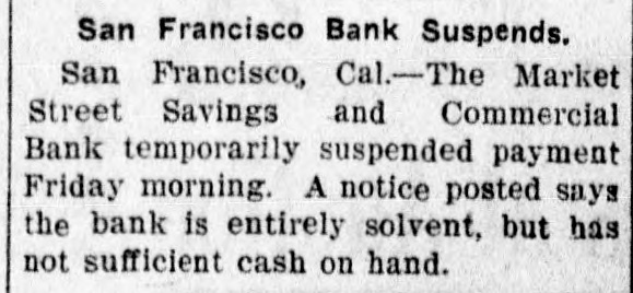 into temporary hospital, the harbor hospital being unable to accommodate all the injured who were brought there. About 100 patients were stretched on the dock at one time. Thursday evening tugs conveyed them to Goat island, where they were lodged in the hospital. The docks from Howard street to Folsom street have been saved, and the fire at this point was not permitted to creep farther east than Main street. To add to the horrors of the situation and the general alarm explosions of sewer gas shook many streets. A Vesuvius in minature was created by such an upheaval at Bryant and eighth streets. Cobblestones were burled 20 feet upward and dirt blew out of the ground. The only bank in the huge ruined district that escaped destruction was the Market Street bank, at the corner of Seventh and Market streets. It is in the gutted Grand building, but the firemen saved the ground floor. It will pay out money just as soon as it hears from the Clearing house officials. A corner of the city near the Pacific mail wharves at Second and Brannan streets, was not ruined, and the sailors' home is intact. The Postal Telegraph company has restored its cable connection with the orient by establishing a station at Ocean Beach, but there is no service yet for delivering messages there. Many Killed by Crazed Cattle. A series of fatalities took place Thursday as the result of the stampeding of a herd of cattle at Sixth and Folsom streets. Thre hundred of the panic-stricken animals ran when they saw and felt the flames and charged wildly down the street, trampling under foot all who were in the way. One man was gored through and through by a maddened bull. At least a dozen persons, it is said, were killed. Shock Empties Wells. A feature of San Francisco was the many wells and cisterns upon which thousands of residents depended for water for drinking and cooking. Every earthquake has affected these cisterns and wells. Water in many of them disappeared and did not return for months. The earthquake of Wednesday had the same effect, and this accounts, in part at least, for the scarcity of water after the shocks. While the city pipe system suplied a large Continued on page 5.