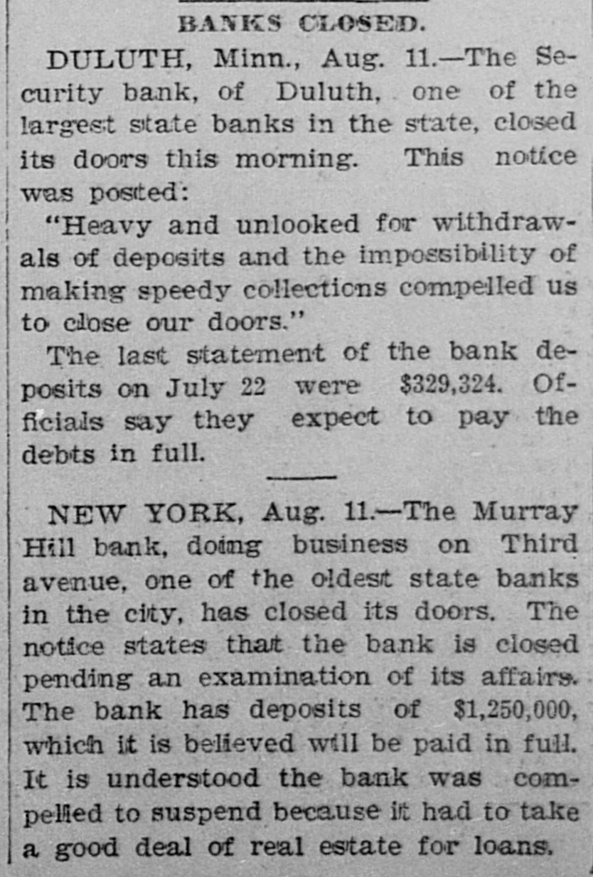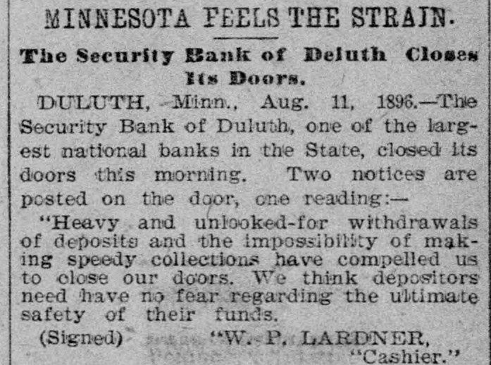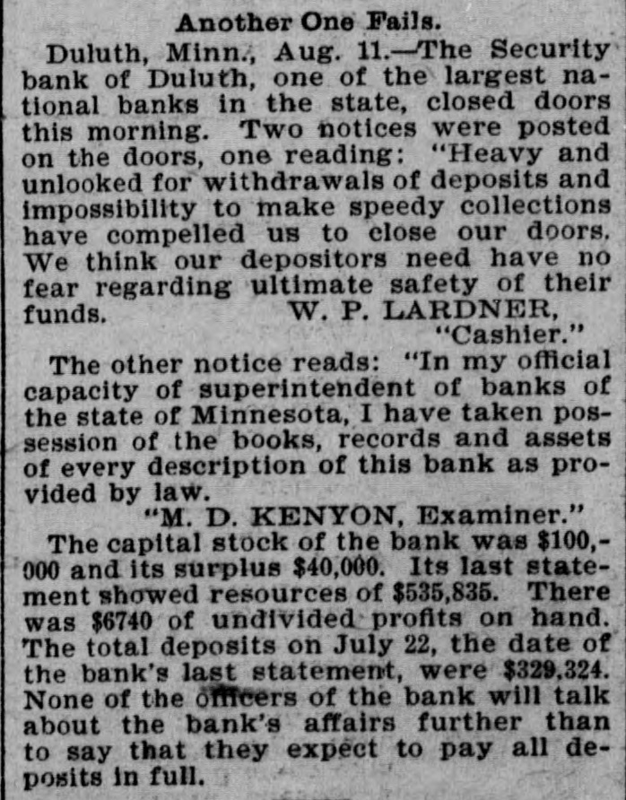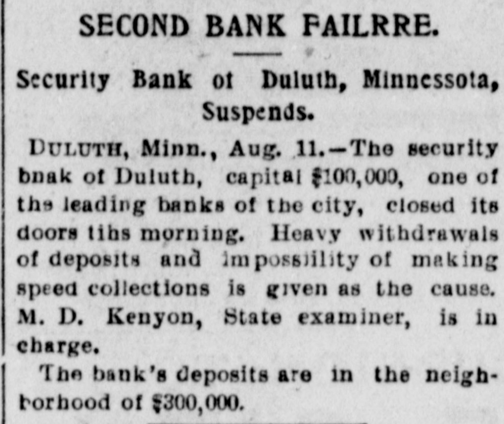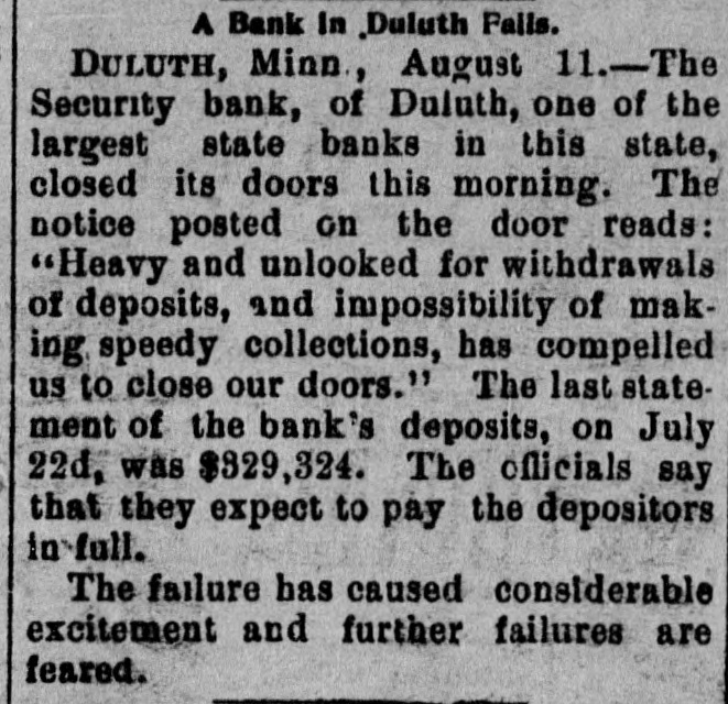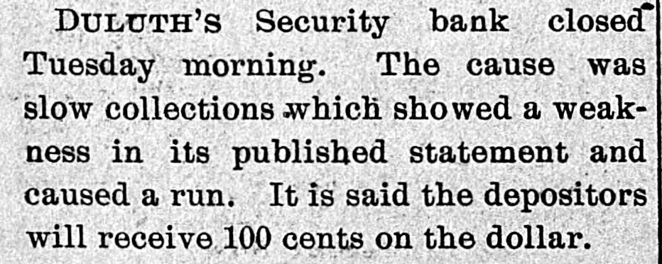 The Security Bank of Duluth ... closed its doors this morning. A notice posted on the door reads: 'Heavy and unlooked for withdrawals of deposits, and impossibility of making speedy collections, has compelled us to close our doors.'