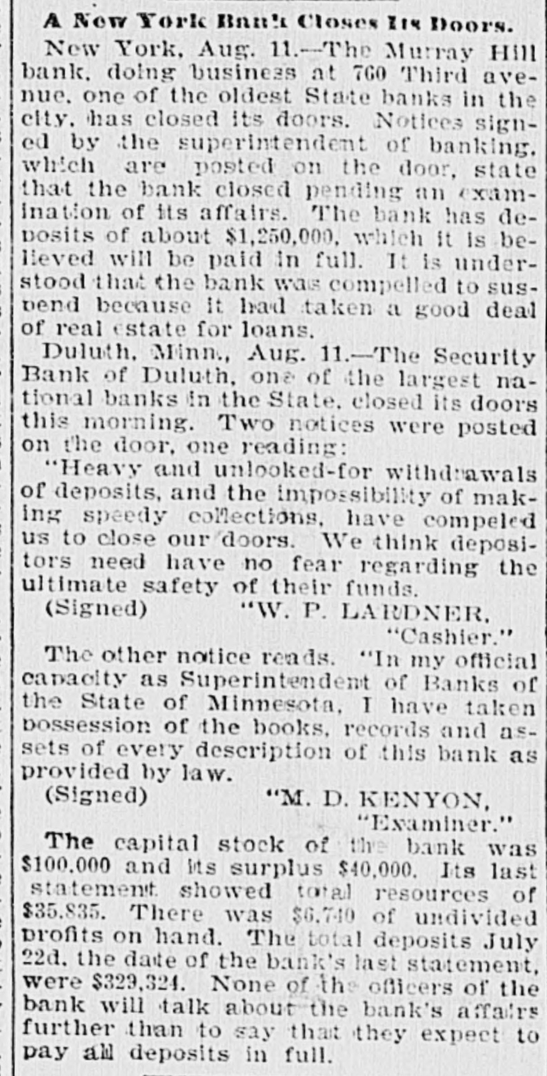 A New York Bank Closes I14 Doors. New York, Aug. 11.-The Murray Hill bank. doing business at 760 Third avenue, one of the oldest State banks in the city. has closed its doors. Notices signed by the superintendent of banking. which are posted on the door, state that the bank closed pending an examination of its affairs. The bank has deposits of about $1,250,000. which it Is beHeved will be paid in full. It is understood that the bank was compelled to suspend because it had taken a good deal of real estate for loans. Duluth. Minn., Aug. 11.-The Security Bank of Duluth, one of the largest national banks in the State. closed its doors this morning. Two notices were posted on the door. one reading: "Heavy and unlooked-for withdrawals of deposits, and the impossibility of making speedy collections, have compeled us to close our doors. We think depositors need have no fear regarding the ultimate safety of their funds. (Signed) "W. P. LARDNER, "Cashier." The other notice reads. "In my official capacity as Superintendent of Banks of the State of Minnesota, I have taken possession of the books. records and assets of every description of this bank as provided by law. (Signed) "M. D. KENYON, "Examiner." The capital stock of the bank was $100,000 and its surplus $40,000. Its last statement showed total resources of $35.835. There was $6.740 of undivided profits on hand. The total deposits July 22d. the date of the bank's last statement, were $329,324. None of the officers of the bank will talk about the bank's affairs further than to say that they expect to pay all deposits in full.