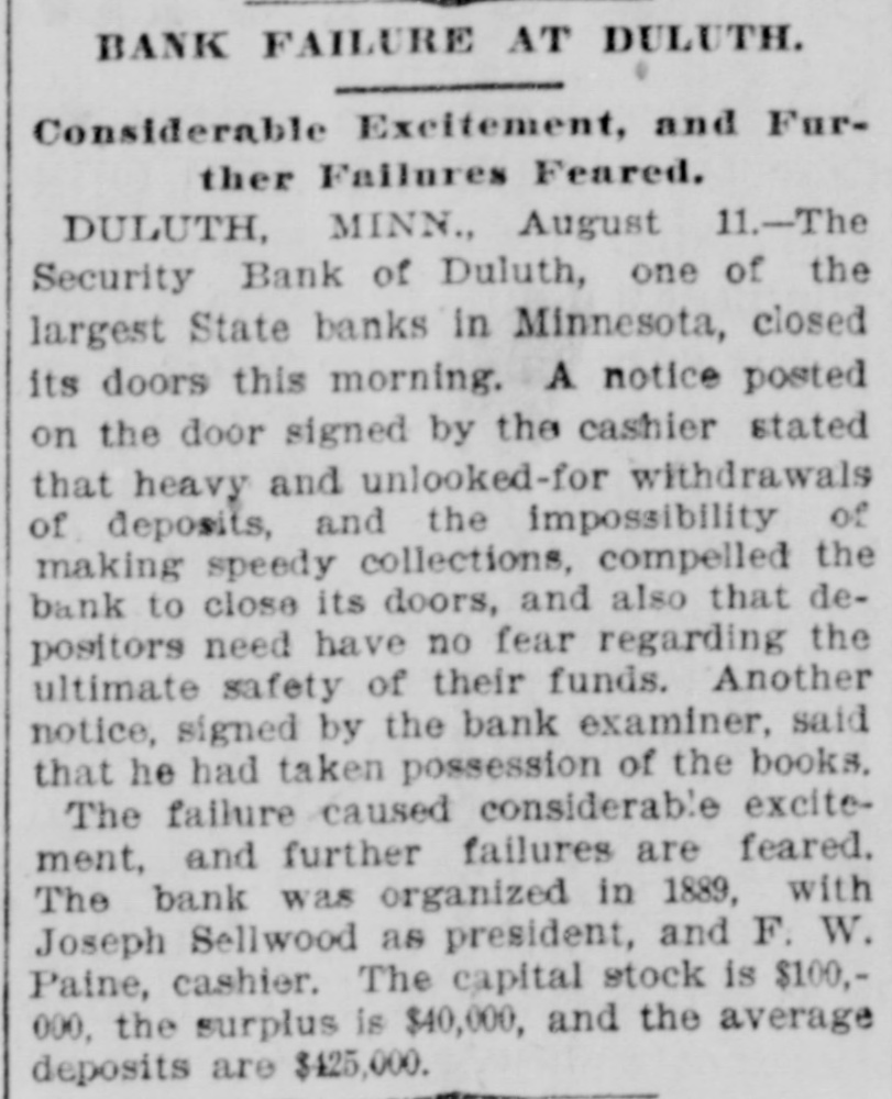 BANK FAILURE AT DULUTH. Considerable Excitement, and Further Failures Feared. DULUTH, MINN., August 11.-The Security Bank of Duluth, one of the largest State banks in Minnesota, closed its doors this morning. A notice posted on the door signed by the cashier stated that heavy and unlooked-for withdrawals of deposits, and the impossibility of making speedy collections, compelled the bank to close its doors, and also that depositors need have no fear regarding the ultimate safety of their funds. Another notice, signed by the bank examiner, said that he had taken possession of the books. The failure caused considerable excitement, and further failures are feared. The bank was organized in 1889, with Joseph Sellwood as president, and F. W. Paine, cashier. The capital stock is $100,000, the surplus is $40,000, and the average deposits are $425,000.
