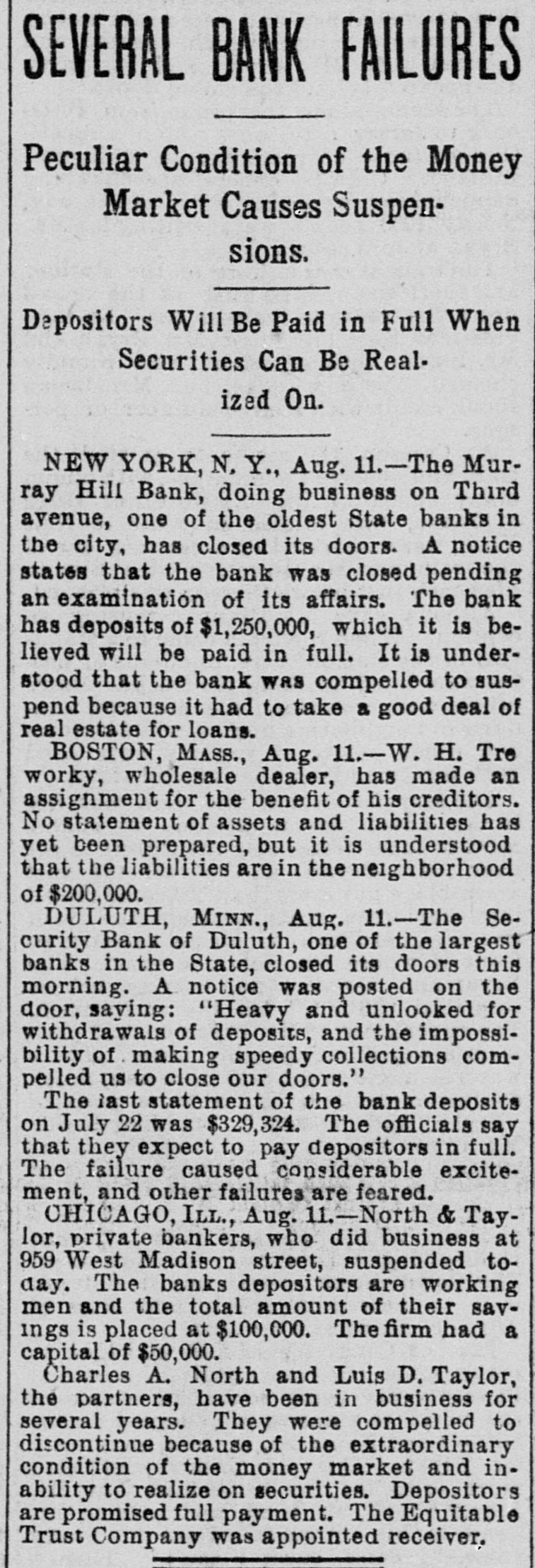 SEVERAL BANK FAILURES Peculiar Condition of the Money Market Causes Suspensions. Depositors Will Be Paid in Full When Securities Can Be Realized On. NEW YORK, N. Y., Aug. 11.-The Murray Hill Bank, doing business on Third avenue, one of the oldest State banks in the city, has closed its doors. A notice states that the bank was closed pending an examination of its affairs. The bank has deposits of $1,250,000, which it is believed will be paid in full. It is understood that the bank WAS compelled to suspend because it had to take a good deal of real estate for loans. BOSTON, Mass., Aug. 11.-W. H. Tre worky, wholesale dealer, has made an assignment for the benefit of his creditors. No statement of assets and liabilities has yet been prepared, but it is understood that the liabilities are in the neighborhood of $200,000. DULUTH, MINN., Aug. 11.-The Security Bank of Duluth, one of the largest banks in the State, closed its doors this morning. A notice was posted on the door, saying: "Heavy and unlooked for withdrawais of deposits, and the impossibility of making speedy collections compelled us to close our doors." The last statement of the bank deposits on July 22 was $329,324. The officials say that they expect to pay depositors in full. The failure caused considerable excitement, and other failures are feared. CHICAGO, ILL., Aug. 11.-North & Taylor, private bankers, who did business at 959 West Madison street, suspended today. The banks depositors are working men and the total amount of their savings is placed at $100,000. The firm had a capital of $50,000. Charles A. North and Luis D. Taylor, the partners, have been in business for several years. They were compelled to discontinue because of the extraordinary condition of the money market and inability to realize on securities. Depositors are promised full payment. The Equitable Trust Company was appointed receiver.