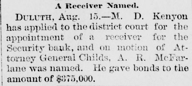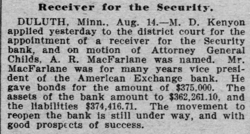 Receiver for the Security. DULUTH, Minn., Aug. 14.-M. D. Kenyon applied yesterday to the district court for the appointment of a receiver for the Security bank, and on motion of Attorney General Childs, A. R. MacFarlane was named. Mr. MacFarlane was for many years vice president of the American Exchange bank. He gave bonds for the amount of $375,000. The assets of the bank amount to $362,261.10, and the liabilities $374,416.71. The movement to reopen the bank is still under way, and with good prospects of success.