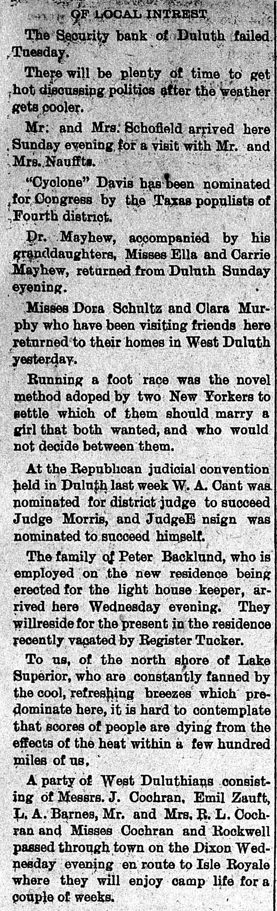 OF LOCAL INTREST The Security bank of Duluth failed Tuesday. There will be plenty of time to get hot discussing politics after the weather gets cooler. Mr: and Mrs. Schofield arrived here Sunday evening for a visit with Mr. and Mrs. Nauffts. "Cyclone" Davis has been nominated for Congress by the Taxas populists of Fourth district. Dr. Mayhew, accompanied by his granddaughters, Misses Ella and Carrie Mayhew, returned from Duluth Sunday eyening. Misses Dora Schultz and Clara Murphy who have been visiting friends here returned to their homes in West Duluth yesterday. Running a foot race was the novel method adoped by two New Yorkers to settle which of them should marry a girl that both wanted, and who would not decide between them. At the Republican judicial convention held in Duluth last week W. A. Cant was nominated for district judge to succeed Judge Morris, and JudgeE nsign was nominated to succeed himself. The family of Peter Backlund, who is employed on the new residence being erected for the light house keeper, arrived here Wednesday evening. They willreside for the present in the residence recently vacated by Register Tucker. To us, of the north shore of Lake Superior, who are constantly fanned by the cool, refreshing breezes which predominate here, it is hard to contemplate that scores of people are dying from the effects of the heat within a few hundred miles of us, A party of West Duluthians consisting of Messrs. J. Cochran, Emil Zauft, L. A. Barnes, Mr. and Mrs. R. L. Cochran and Misses Cochran and Rockwell passed through town on the Dixon Wednesday evening en route to Isle Royale where they will enjoy camp life for a couple of weeks.
