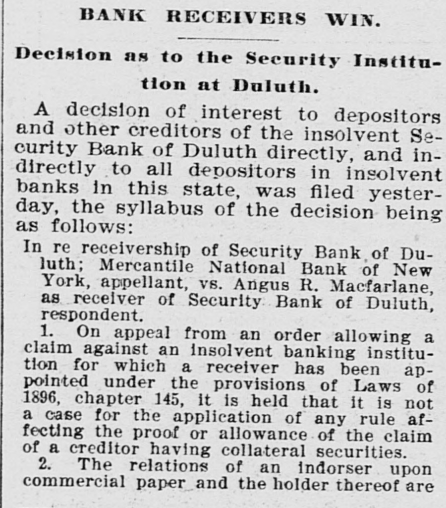 "He published in the Minneapolis papers a card, over his own signature, stating that the Bank of Minneapolis, of which the present governor, Clough, was president, was not affected by the Scheig defalcation to a greater amount than the defaulter's bond would cover-say about $20,000. The defalcation was over $100,000. Ask the stockholders if the bank was 'affected.' He didn't discover that the Citizens' bank had been robbed by its president, in way of excessive loans and over-issue of stock. He didn't discover that Kortgaard, of the State bank, robbed that bank of about four times its capital stock by irregular loans. He didn't discover that Haugan started a bank on 'wind' and sunk the city's money in it. He didn't discover that the Commercial bank, of St. Paul was rotten to the core. He didn't discover that the Allemania was in the same condition, or the Savings Bank of Minnesota, with loans to Tom, Dick and the devil, illegal and unauthorized. He didn't discover that the Farmers' Exchange bank was an empty shell, and after they had closed up, Minneapolis bankers heard he was going to allow it to reopen, and in a letter protested against it, as the institution was absolutely decayed. But he promptly allowed it to reopen, to further gull the public, and it as promptly closed up again. He didn't discover that the Security bank, of Duluth, was hopelessly insolvent until after it had closed. All these things escaped his notice in his intense devotion to public business, and not until John Lind was nominated to run as governor did this unfortunate public political appointee discover that at one time, somewhere, somehow, an irregular loan had been made by the Brown County bank, of which John Lind was a director. Stupendous! Prodigious! It required the nomination of John Lind, director of the Brown County bank, against W. H. Eustis, director of the Guaranty Loan company, to develop this wonderful astuteness in this faithful public official. Prodigious! Stupendous! Wonders will never cease; but insasmuch as our state bank examiner finally has got onto one single thing that he has the courage to openly criticise in his jurisdiction, the people of Minnesota can thank God, from full hearts, that good has come out of the wretched political situation. It is worth all it costs. Many there were who were ready to swear that no power in earth, heaven or hell could induce State Bank Examiner Kenyon to report an irregularity. But they were wrong. He caught it at once when the campaign opened, and John Lind, not of his own party, was running for governor. Do men gather figs from thistles? You bet they do in case some political ass of the other party don't first eat the thistles and get them out of the way."