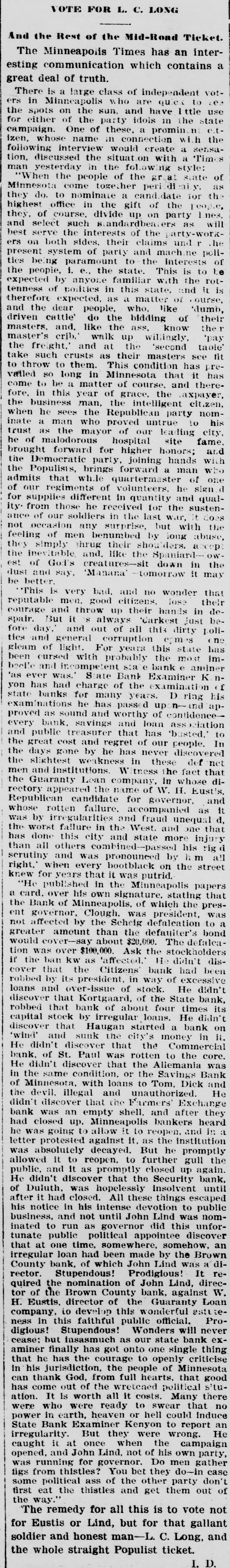 "When the people of the great state of Minnesota come together periodically, as they do, to nominate a candidate for the highest office in the gift of the people, they, of course, divide up on party lines, and select such standardbearers as will best serve the interests of the party-workers on both sides, their claims under the present system of party and machine politics being paramount to the interests of the people, i. e., the state. This is to be expected by anyone familiar with the rottenness of politics in this state, and it is therefore expected, as a matter of course, and the dear people, who, like 'dumb, driven cattle' do the bidding of their masters, and, like the ass, know their master's crib,' walk up willingly, 'pay the freight,' and at the 'second table' take such crusts as their masters see fit to throw to them. This condition has prevailed so long in Minnesota that it has come to be a matter of course, and therefore, in this year of grace, the taxpayer, the business man, the intelligent citizen, when he sees the Republican party nominate a man who proved untrue to his trust as the mayor of our leading city, he of malodorous hospital site fame, brought forward for higher honors; and the Democratic party, joining hands with the Populists, brings forward a man who admits that while quartermaster of one of our regiments of volunteers, he signed for supplies different in quantity and quality from those he received for the sustenance of our soldiers in the last war, it does not occasion any surprise, but with the feeling of men benumbed by long abuse, they simply shrug their shoulders, accept the inevitable, and, like the Spaniard-lowest of God's creatures-sit down in the dust and say, 'Manana' tomorrow it may be better.