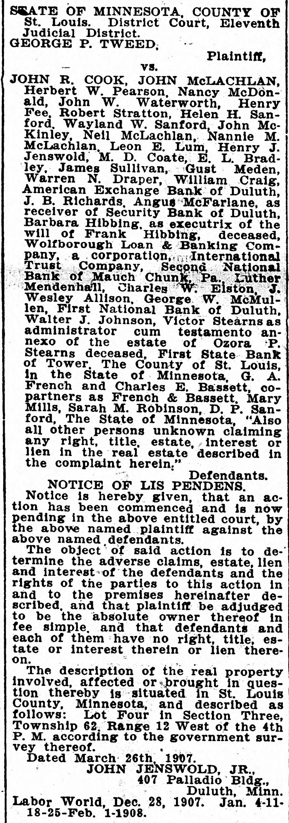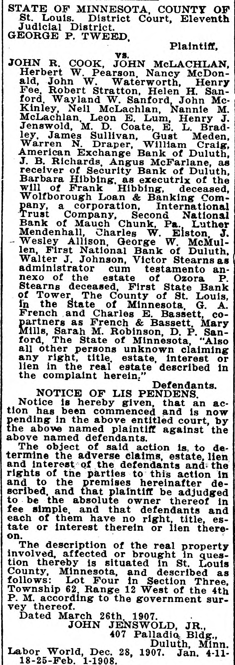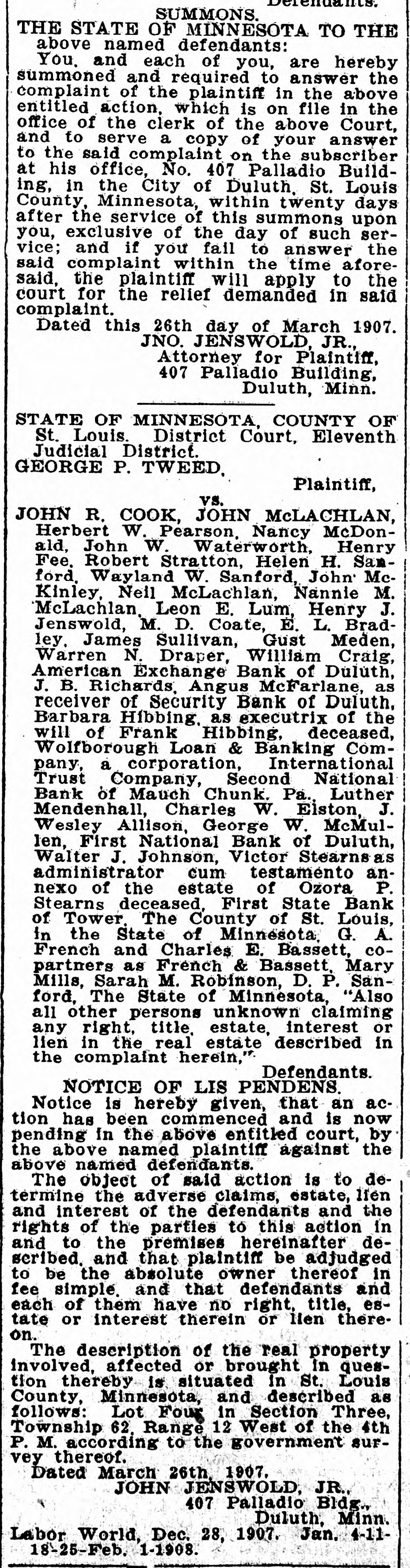 SUMMONS. THE STATE OF MINNESOTA TO THE above named defendants: You. and each of you, are hereby summoned and required to answer the complaint of the plaintiff in the above entitled action, which is on file in the office of the clerk of the above Court, and to serve a copy of your answer to the said complaint on the subscriber at his office, No. 407 Palladio Building, in the City of Duluth, St. Louis County, Minnesota, within twenty days after the service of this summons upon you, exclusive of the day of such service; and if you fail to answer the said complaint within the time aforesaid, the plaintiff will apply to the court for the relief demanded in said complaint. Dated this 26th day of March 1907. JNO. JENSWOLD, JR., Attorney for Plaintiff, 407 Palladio Building, Duluth, Minn. STATE OF MINNESOTA, COUNTY OF St. Louis. District Court, Eleventh Judicial District. GEORGE P. TWEED Plaintiff, vs. JOHN R. COOK, JOHN McLACHLAN, Herbert W. Pearson, Nancy McDonald, John W. Waterworth, Henry Fee. Robert Stratton, Helen H. Sanford. Wayland W. Sanford, John McKinley, Neil McLachlan, Nannie M. McLachlan Leon E. Lum, Henry J. Jenswold, M. D. Coate, E. L. Bradley. James Sullivan, Gust Meden, Warren N. Draper, William Craig, American Exchange Bank of Duluth, J. B. Richards Angus McFarlane, as receiver of Security Bank of Duluth, Barbara Hibbing. as executrix of the will of Frank Hibbing, deceased, Wolfborough Loan & Banking Company, a corporation, International Trust Company, Second National Bank of Mauch Chunk. Pa. Luther Mendenhall, Charles W. Elston, J. Wesley Allison, George W. McMullen, First National Bank of Duluth, Walter J. Johnson, Victor Stearns as administrator cum testamento annexo of the estate of Ozora P. Stearns deceased, First State Bank of Tower The County of St. Louis, in the State of Minnesota G. A. French and Charles E. Bassett, copartners as French & Bassett, Mary Mills, Sarah M. Robinson, D. P. Sanford, The State of Minnesota, "Also all other persons unknown claiming any right, title. estate, interest or lien in the real estate described in the complaint herein," Defendants. NOTICE OF LIS PENDENS. Notice is hereby given, that an action has been commenced and is now pending in the above entitled court, by the above named plaintiff against the above named defendants. The object of said action is to determine the adverse claims, estate, lien and interest of the defendants and the rights of the parties to this action in and to the premises hereinafter described. and that plaintiff be adjudged to be the absolute owner thereof in fee simple. and that defendants and each of them have no right, title, estate or interest therein or lien thereon. The description of the real property involved, affected or brought in question thereby is situated in St. Louis County, Minnesota, and described as follows: Lot Four in Section Three, Township 62. Range 12 West of the 4th P. M. according to the government survey thereof. Dated March 26th. 1907. JOHN JENSWOLD, JR., 407 Palladio Bldg., Duluth, Minn. Labor World, Dec. 28, 1907. Jan. 4-1118-25-Feb. 1-1908.