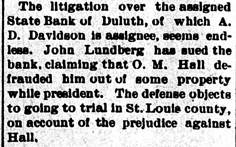 The litigation over the assigned State Bank of Duluth, of which A. D. Davidson is assignee, seems endless. John Lundberg has sued the bank. claiming that O. M. Hall defrauded him out of some property while president. The defense objects to going to trial in St. Louis county, on account of the prejudice against Hall.