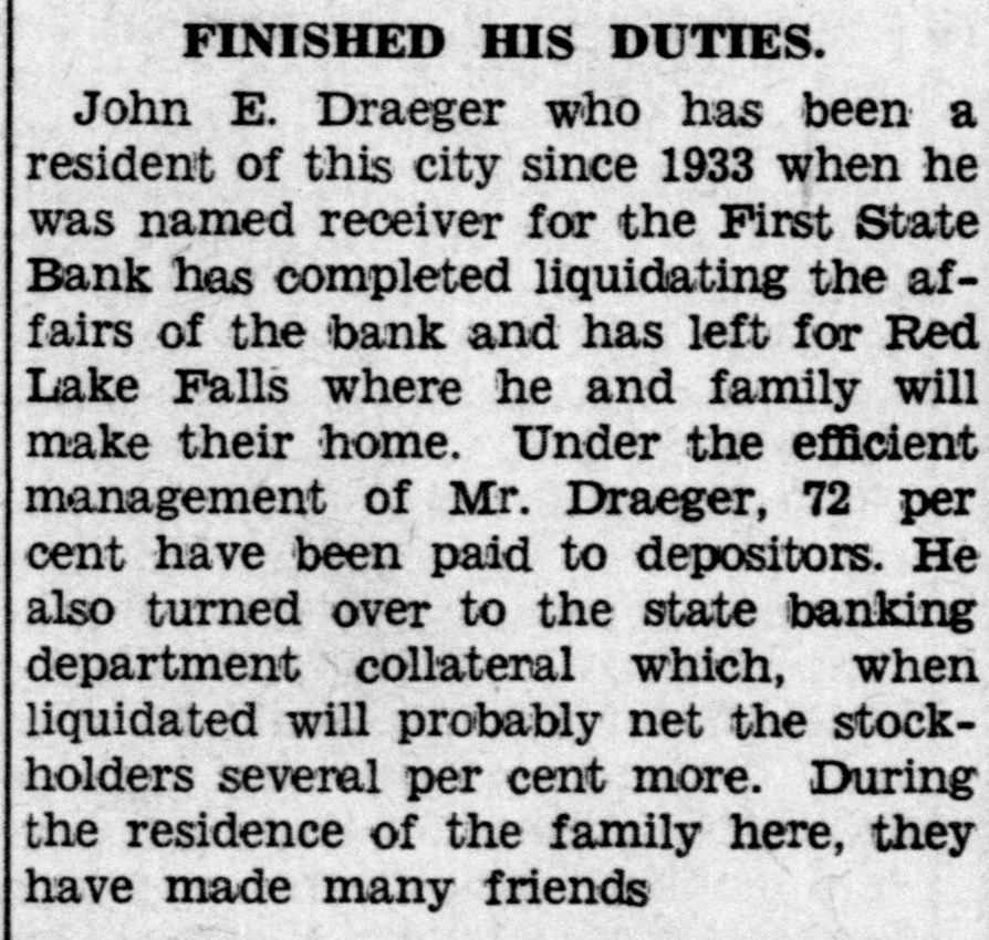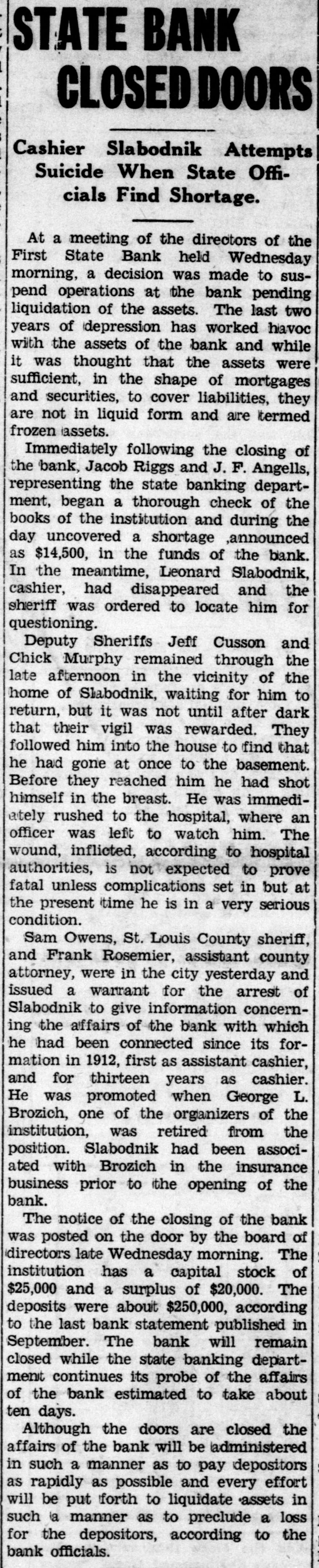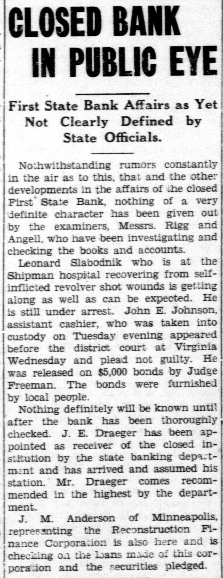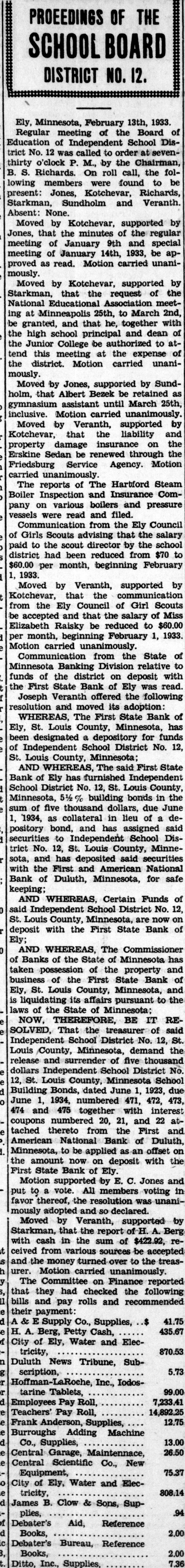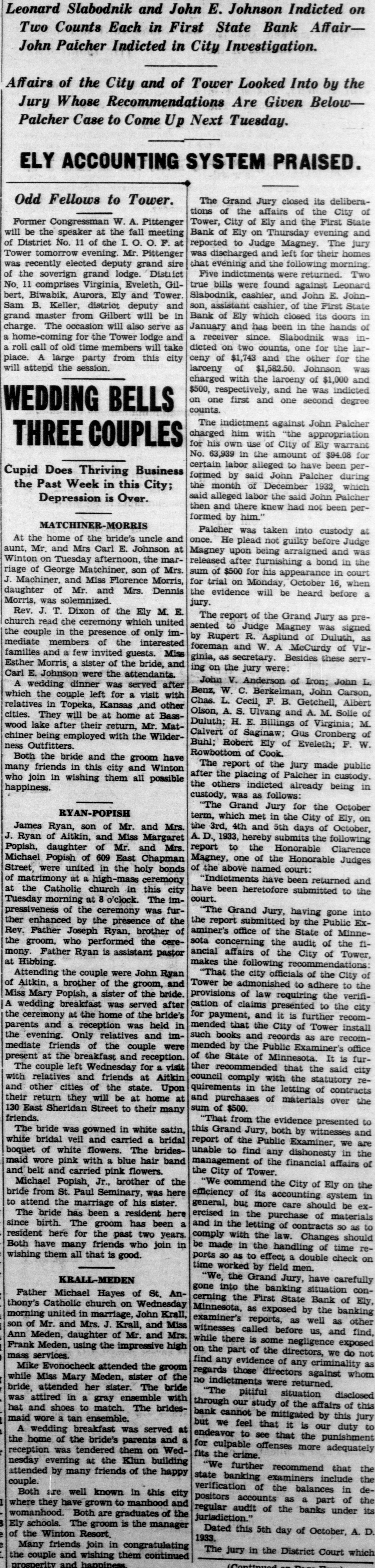 Leonard Slabodnik and John E. Johnson Indicted on Two Counts Each in First State Bank AffairJohn Paicher Indicted in City Investigation. Affairs of the City and of Tower Looked Into by the Jury Whose Recommendations Are Given BelowPalcher Case to Come Up Next Tuesday. ELY ACCOUNTING SYSTEM PRAISED. Odd Fellows to Tower. The Grand Jury closed its deliberations of the affairs of the City of Tower, City of Ely and the First State Former Congressman W. A. Pittenger will be the speaker at the fall meeting Bank of Ely on Thursday evening and of District No. 11 of the I. O. O. F. at reported to Judge Magney. The jury was discharged and left for their homes Tower tomorrow evening. Mr. Pittenger was recently elected deputy grand sire that evening and the following morning. Five indictments were returned. Two of the soverign grand lodge. District No. 11 comprises Virginia, Eveleth, Giltrue bills were found against Leonard bert, Biwabik, Aurora, Ely and Tower. Slabodnik, cashier, and John E. Johnson, assistant cashier, of the First State Sam B. Keller, district deputy and grand master from Gilbert will be in Bank of Ely which closed its doors in charge. The occasion will also serve as January and has been in the hands of a receiver since. Slabodnik was ina home-coming for the Tower lodge and a roll call of old time members will take dicted on two counts, one for the larceny of $1,743 and the other for the place. A large party from this city will attend the session. larceny of $1,582.50. Johnson was charged with the larceny of $1,000 and $500, respectively, and he was indicted on one first and one second degree WEDDING BELLS counts. The indictment against John Palcher charged him with "the appropriation THREE COUPLES for his own use of City of Ely warrant No. 63,939 in the amount of $94.08 for certain labor alleged to have been perCupid Does Thriving Business formed by said John Palcher during the Past Week in this City; the month of December 1932, which said alleged labor the said John Palcher Depression is Over. then and there knew had not been performed by him." MATCHINER-MORRIS Palcher was taken into custody at At the home of the bride's uncle and once. He plead not guilty before Judge aunt, Mr. and Mrs Carl E. Johnson at Magney upon being arraigned and was Winton on Tuesday afternoon, the marreleased after furnishing a bond in the riage of George Matchiner, son of Mrs. sum of $500 for his appearance in court J. Machiner, and Miss Florence Morris, for trial on Monday, October 16, when daughter of Mr. and Mrs. Dennis the evidence will be heard before a Morris, was solemnized. jury. Rev. J. T. Dixon of the Ely M. E. The report of the Grand Jury as prechurch read the ceremony which united sented to Judge Magney was signed the couple in the presence of only imby Rupert R. Asplund of Duluth, as mediate members of the interested foreman and W. A McCurdy of Virfamilies and a few invited guests. Miss ginia, as secretary. Besides these servEsther Morris. a sister of the bride, and ing on the jury were: Carl E. Johnson were the attendants. John V. Anderson of Iron; John L. A wedding dinner was served after Benz, W. C. Berkelman, John Carson, which the couple left for a visit with Chas. L. Cecil, F. B. Getchell, Albert relatives in Topeka, Kansas and other Olson, A. S. Ulvang and A. M. Solie of cities. They will be at home at BassDuluth; H. E. Billings of Virginia; M. wood lake after their return, Mr. MatCalvert of Saginaw; Gus Cronberg of chiner being employed with the WilderBuhl; Robert Ely of Eveleth; F. W. ness Outfitters. Rowbottom of Cook. Both the bride and the groom have The report of the jury made public many friends in this city and Winton after the placing of Palcher in custody. who join in wishing them all possible the others indicted already being in happiness. custody, was as follows: "The Grand Jury for the October RYAN-POPISH term, which met in the City of Ely, on James Ryan, son of Mr. and Mrs. the 3rd, 4th and 5th days of October, J. Ryan of Aitkin, and Miss Margaret A.D., 1933, hereby submits the following Popish, daughter of Mr. and Mrs. report to the Honorable Clarence Michael Popish of 609 East Chapman Magney, one of the Honorable Judges of the above named court: Street, were united in the holy bonds "Indictments have been returned and of matrimony at a high-mass ceremony at the Catholic church in this city have been heretofore submitted to the court. Tuesday morning at 8 o'clock. The impressiveness of the ceremony was fur"The Grand Jury, having gone into ther enhanced by the presence of the the report submitted by the Public ExRev. Father Joseph Ryan, brother of aminer's office of the State of Minnethe groom, who performed the ceresota concerning the audit of the fimony. Father Ryan is assistant paster ancial affairs of the City of Tower, at Hibbing. makes the following recommendations: Attending the couple were John Ryan "That the city officials of the City of of Aitkin, a brother of the groom, and Tower be admonished to adhere to the Miss Mary Popish, a sister of the bride. provisions of law requiring the verifiA wedding breakfast was served after cation of claims presented to the city the ceremony at the home of the bride's for payment, and it is further recomparents and a reception was held in mended that the City of Tower install the evening. Only relatives and imsuch books and records as are recommediate friends of the couple were mended by the Public Examiner's office present at the breakfast and reception. of the State of Minnesota. It is furThe couple left Wednesday for a visit ther recommended that the said city with relatives and friends at Aitkin council comply with the statutory reand other cities of the state. Upon quirements in the letting of contracts their return they will be at home at and purchases of materials over the sum of $500. 130 East Sheridan Street to their many friends. "That from the evidence presented to The bride was gowned in white satin, this Grand J