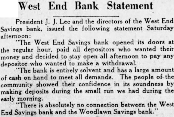West End Bank Statement President Lee and the directors of the West End Savings bank, issued the following statement Saturday afternoon: West End Savings bank opened its doors at the regular hour, paid all depositors who wanted their money and decided to stay open all afternoon to pay any depositor who wanted to make withdrawal. bank entirely and has large amount hand to meet all demands. The people of the of cash on showed their confidence in its soundness by community making deposits during the small run we had during the early morning. absolutely connection between the West End Savings bank and the Woodlawn Savings bank.