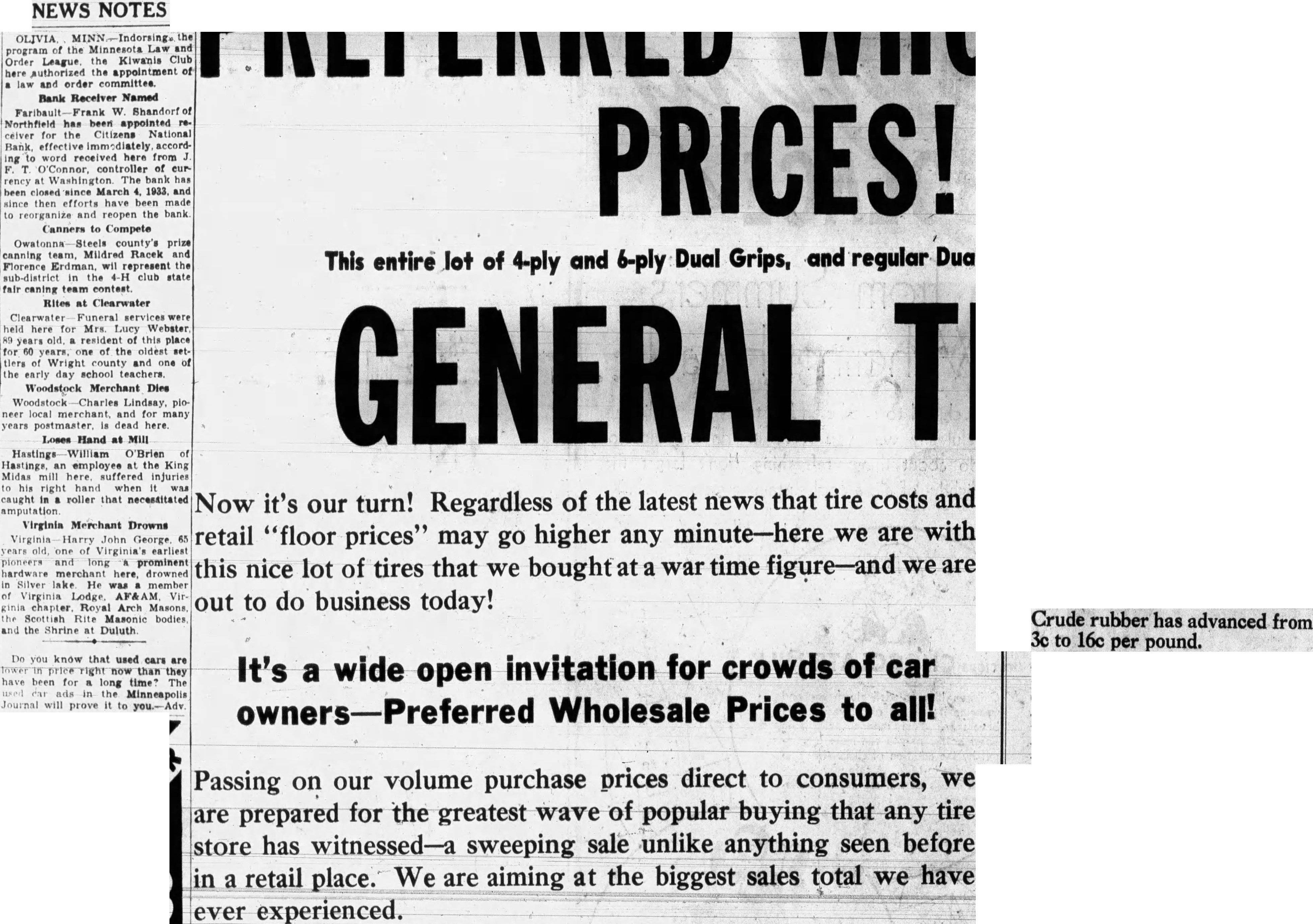 NEWS NOTES program of the Minnesota Law and Order League. the Kiwanis Club here authorized the appointment of law and order committee. Bank Receiver Named Faribault- Frank W. Shandorf of Northfield has been appointed receiver for the Citizens National Bank, effective immodiately according to word received here from J. F. T. O'Connor, controller of currency at Washington The bank has been closed since March 4. 1933. and since then efforts have been made to reorganize and reopen the bank Canners to Compete Owatonna- Steels county's prize canning team, Mildred Racek and Florence Erdman. will represent the sub-district in the 4-H club state fair caning team contest Rites at Clearwater Clearwater Funeral services were held here for Mrs. Lucy Webster 89 years old. resident of this place for 60 years. one of the oldest settiers of Wright county and one of the early day school teachers. Woodstock Merchant Dies Woodstock Charles Lindsay. pioneer local merchant, and for many years postmaster. is dead here. Loses Hand at Mill Hastings William O'Brien of Hastings, an employee at the King Midas mill here. suffered injuries to his right hand when was caught in roller that necessitated Virginia Merchant Drowns Virginia Harry John George 65 years old, one of Virginia's earliest pioneers and long prominent hardware merchant here, drowned in Silver lake He was member ginia chapter Royal Arch Masons the Scottish Rite Masonic bodies and the Shrine at Duluth Do you know that used cars are lower in price right now than they have been for long time The car ads in the Minneapolis Journal will prove it to you-Adv. Passing on our volume purchase prices direct to consumers, we are prepared for the greatest wave of popular buying that any tire store has witnessed-a sweeping sale unlike anything seen before in a retail place. We are aiming at the biggest sales total we have ever experienced. Crude rubber has advanced from 3c to 16c per pound.