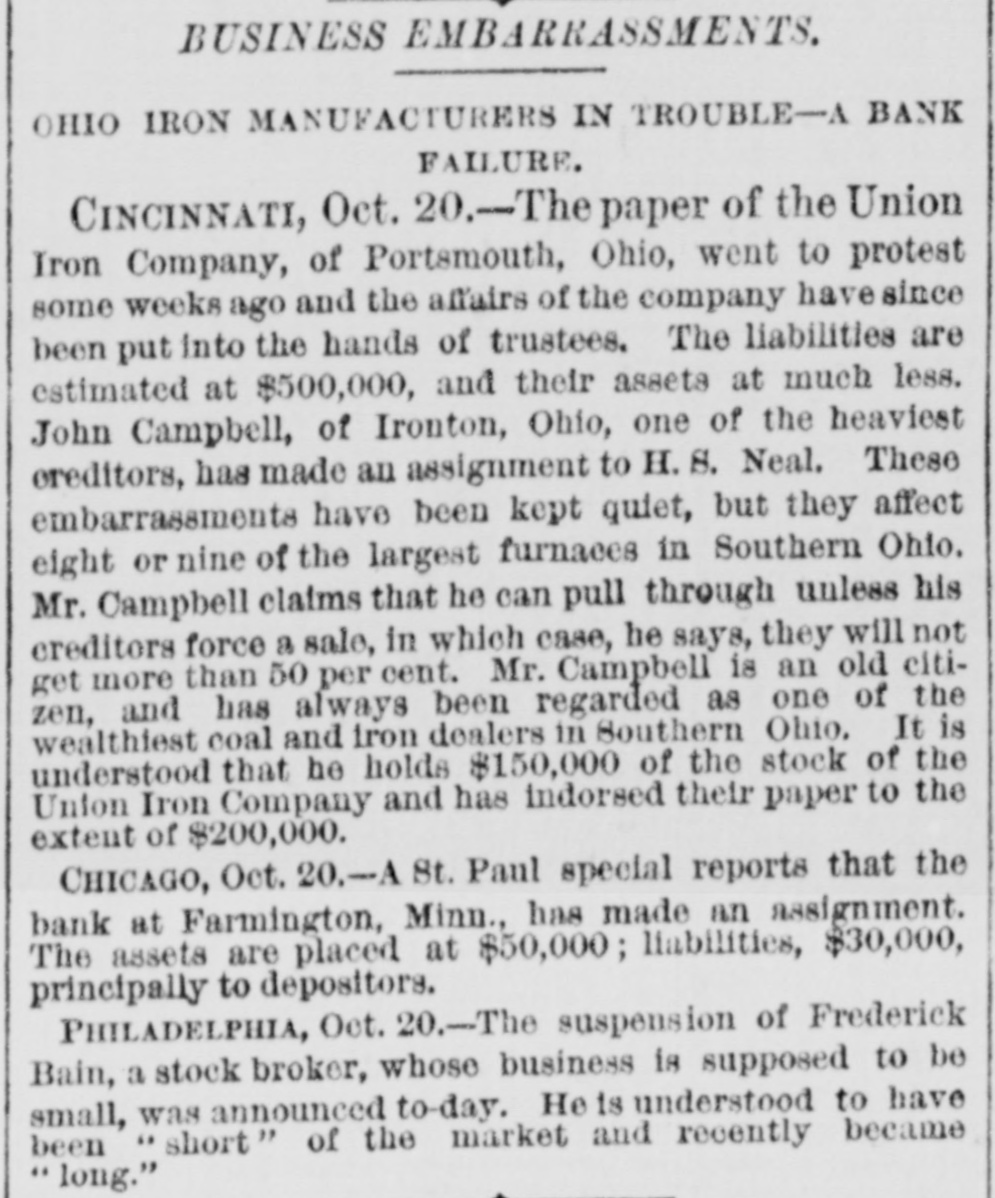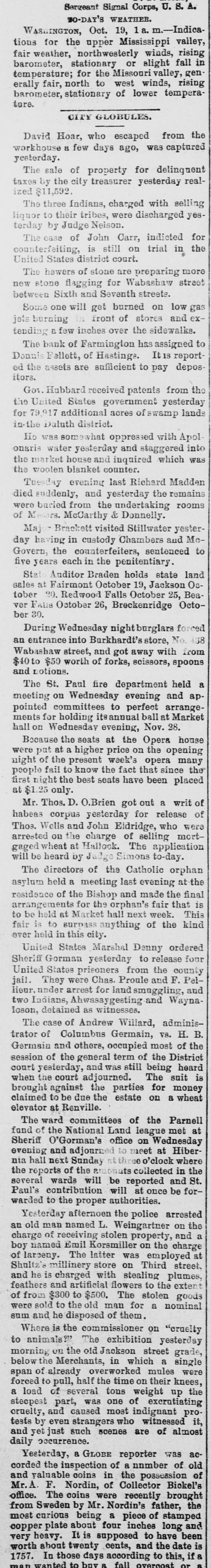Sergeant Signal Corps, U. S. A. WO-DAY'S WEATHER. WASHINGTON, Oct. 19, 1a. m.-Indications for the upper Mississippi valley, fair weather, northwesterly winds, rising barometer, stationary or slight fall in temperature; for the Missouri valley, generally fair, north to west winds, rising barometer, stationary of lower temperature. CITY GLOBULES. David Hoar, who escaped from the workhouse a few days ago, was captured yesterday. The sale of property for delinquent taxes by the city treasurer yesterday realized $11,592. The three Indians, charged with selling liquor to their tribes, were discharged yesterday by Judge Nelson. The case of John Carr, indicted for counterfeiting, is still on trial in the United States district court. The hewers of stone are preparing more new stone flagging for Wabashaw street between Sixth and Seventh streets. Some one will get burned on low gas jets burning in front of stores and extending a few inches over the sidewalks. The bank of Farmington has assigned to Dennis Fellett, of Hastings. It IS reported the assets are sufficient to pay depositors. Gov. Hubbard received patents from the the United States government yesterday for 79,917 additional acres of swamp lands in-the Daluth district. Ho was somewhat oppressed with Apolonaris water yesterday and staggered into the market house and inquired which was the woolen blanket counter. Tuesday evening last Richard Madden died suddenly, and yesterday the remains were baried from the undertaking rooms of Mesors. McCarthy & Donnelly. Maj Brackett visited Stillwater yesterday having in custody Chambers and McGovern, the counterfeiters, sentenced to five years each in the penitentiary. Stat Auditor Braden holds state land sales at Fairmont October 19, Jackson October 20. Redwood Falls October 25, Beavor FALLS October 26, Breckenridge October 30. During Wednesday nightburglars forced an entrance into Burkhardt's store, No. 138 Wabashaw street, and got away with from $40 to $50 worth of forks, scissors, spoons and notions. The St. Paul fire department held a meeting on Wednesday evening and appointed committees to perfect arrangements for holding itsannual ball at Market hall on Wednesday evening, Nov. 28. Because the seats at the Opera house were put at a higher price on the opening night of the present week's opera many people fail to know the fact that since the first night the best seats have been placed at $1.25 only. Mr. Thos. D. O.Brien got out a writ of habeas corpus yesterday for release of Thos. Wells and John Eidridge, who were arrested on the charge of selling mortgaged wheat at Hallock. The application will be heard by Judge Simons to-day. The directors of the Catholic orphan asylum held a meeting last evening at the residence of the Bishop and made the final arrangements for the orphan's fair that is to be held at Market hall next week. This fair is to surpass anything of the kind ever held in this city. United States Marshal Denny ordered Sheriff Gorman yesterday to release four United States prisoners from the county jail. They were Chas. Proule and F. Pellieur. under arrest for land smuggling, and two Indians, Ahwasaygesting and Waynaloson, detained as witnesses. The case of Andrew Willard, administrator of Columbus Germain, VS. H. B. Germain and others, occupied most of the session of the general term of the District court yesterday, and was still being heard when the court adjourned. The suit is brought against the parties for money claimed to be due the estate on a wheat elevator at Renville. The ward committees of the Parnell fund of the National Land league met at Sheriff O'Gorman's office on Wednesday evening and adjourned to meet at Hibernia hall next Sunday at three o'clock where the reports of the amounts collected in the several wards will be reported and St. Paul's contribution will at once be forwarded to the proper authorities. Yesterday afternoen the police arrested an old man named L. Weingartner on the charge of receiving stolen property, and a boy named Emil Korsmiller on the charge of larceny. The latter was employed at Shultz's millinery store on Third street. and he is charged with stealing plumes, feathers and artificial flowers to the extent of from $300 to $500. The stolen goods were sold to the old man for a nominal sum and he disposed of them. Where is the commissioner on "cruelty to animals?" The exhibition yesterday morning on the old Jackson street grade, below the Merchants, in which a single span of already overworked mules were forced to pull, half the time on their knees, a load of several tons weight up the steepest part, was one of excrutiating oruelty, and caused most indignant protests by even strangers who witnessed it, and yet just such scenes are of almost daily occurrence. Yesterday, a GLOBE reporter was accorded the inspection of a nnmber of old and valuable coins in the possession of Mr. A. F. Nordin, of Collector Bickel's office. The coins were recently brought from Sweden by Mr. Nordin's father, the most enrions being piece of stamped