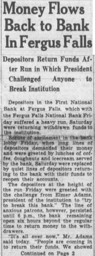 Depositors in the First National Bank at Fergus Falls, which with the Fergus Falls National Bank Friday suffered heavy run, Saturday returning withdrawn funds the institution. Scenes excitement when long lines of depositors demanded their money were by lunches of cofand icecream served the bank, replaced by quiet returning the bank with their funds to reopen their accounts. The depositors at the height of run Friday were greeted with the challenge from Elmer Adams, president the institution to to break this The line persisted until the bank remaining six hours beyond the regular time return money to the withdrawers. "It's all over now," Mr. Adams said today. 'People are coming return their funds. We showed Continued on Page 2