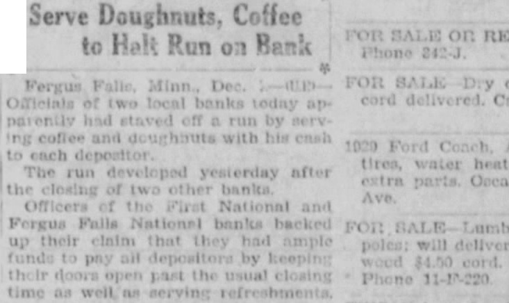 Dec. FOR Dry Fergus cord delivered. Officials local banks today had staved off run by coffee and doughbuts with his eash each The run developed yesterday after the closing of other banks. Ave. Officers of the First National and Forgus Falls National banks backed up their claim that they had ample funds pay all depositors by keeping doors open past the usual closing Phone time as well as serving refreshments.