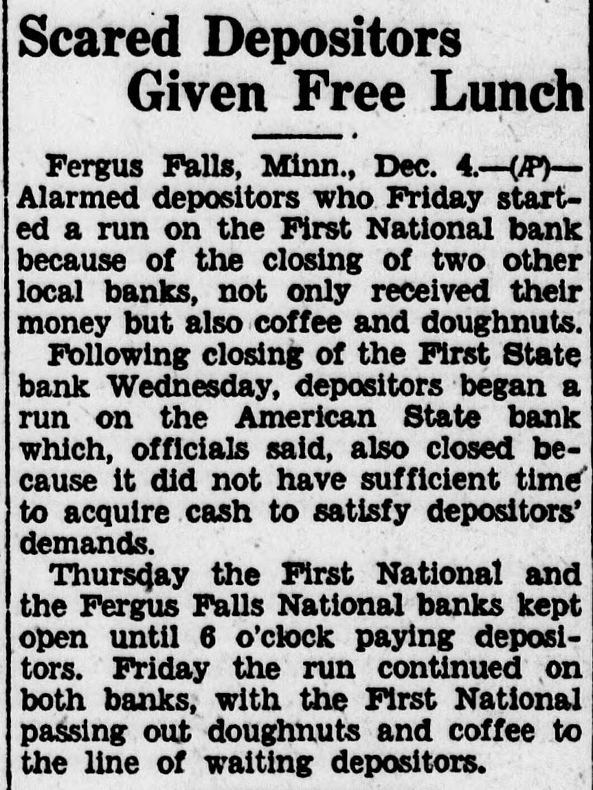 Scared Depositors Given Free Lunch . Fergus Falls, Minn., Dec. 4.-(AP)Alarmed depositors who Friday started a run on the First National bank because of the closing of two other local banks, not only received their money but also coffee and doughnuts. Following closing of the First State bank Wednesday, depositors began a run on the American State bank which, officials said, also closed because it did not have sufficient time to acquire cash to satisfy depositors' demands. Thursday the First National and the Fergus Falls National banks kept open until 6 o'clock paying depositors. Friday the run continued on both banks, with the First National passing out doughnuts and coffee to the line of waiting depositors.