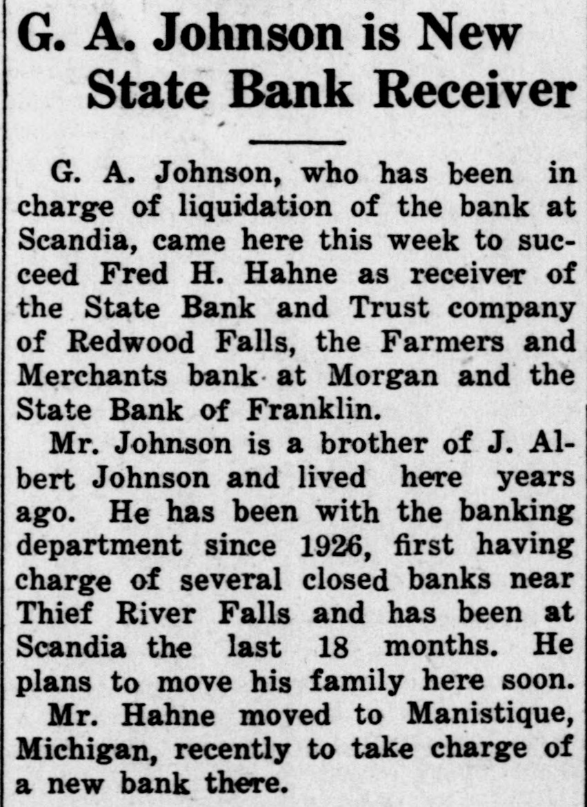 G. A. Johnson is New State Bank Receiver G. A. Johnson, who has been in charge of liquidation of the bank at Scandia, came here this week to succeed Fred H. Hahne as receiver of the State Bank and Trust company of Redwood Falls, the Farmers and Merchants bank at Morgan and the State Bank of Franklin. Mr. Johnson is a brother of J. Albert Johnson and lived here years ago. He has been with the banking department since 1926, first having charge of several closed banks near Thief River Falls and has been at Scandia the last 18 months. He plans to move his family here soon. Mr. Hahne moved to Manistique, Michigan, recently to take charge of a new bank there.