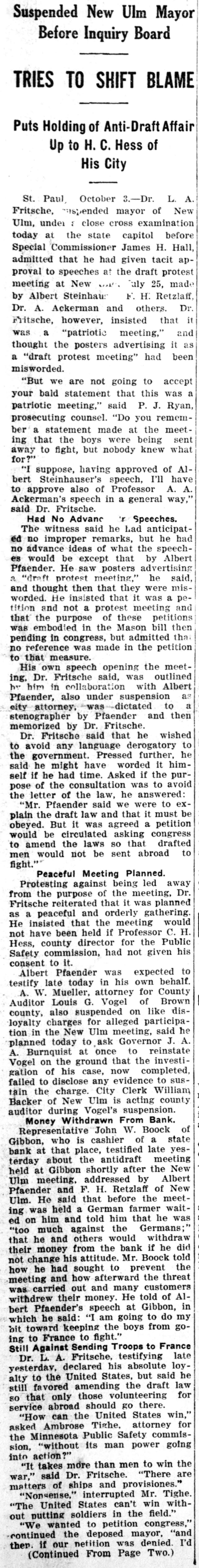 Suspended New Ulm Mayor Before Inquiry Board TRIES TO SHIFT BLAME Puts Holding of Anti-Draft Affair Up to H. C. Hess of His City St. Paul, October 3.-Dr. L. A. Fritsche, suspended mayor of New Ulm, under : close cross examination today at the state capitol before Special Commissioner James H. Hall, admitted that he had given tacit approval to speeches at the draft protest meeting at New . July 25, made by Albert Steinhaus F. H. Retzlaff, Dr. A. Ackerman and others. Dr. Fritsche, however, insisted that it was a "patriotic meeting," and thought the posters advertising it as a "draft protest meeting" had been misworded. "But we are not going to accept your bald statement that this was a patriotic meeting," said P. J. Ryan, prosecuting counsel. "Do you remember a statement made at the meeting that the boys were being sent away to fight, but nobody knew what for?" "I suppose, having approved of Albert Steinhauser's speech, I'll have to approve also of Professor A. A. Ackerman's speech in a general way," said Dr. Fritsche. Had No Advanc 'r Speeches. The witness said he Lad anticipated no improper remarks, but he had no advance ideas of what the speeches would be except that by Albert Pfaender. He saw posters advertising a "draft protest meeting," he said, and thought then that they were misworded. He insisted that it was a petition and not a protest meeting and that the purpose of these petitions was embodied in the Mason bill then pending in congress, but admitted that no reference was made in the petition to that measure. His own speech opening the meeting, Dr. Fritsche said, was outlined by him in collaboration with Albert Pfaender, also under suspension as city attorney, was dictated to a stenographer by Pfaender and then memorized by Dr. Fritsche. Dr. Fritsche said that he wished to avoid any language derogatory to the government. Pressed further, he said he might have worded it himself if he had time. Asked if the purpose of the consultation was to avoid the letter of the law, he answered: "Mr. Pfaender said we were to explain the draft law and that it must be obeyed. But it was agreed a petition would be circulated asking congress to amend the laws SO that drafted men would not be sent abroad to fight." Peaceful Meeting Planned. Protesting against being led away from the purpose of the meeting, Dr. Fritsche reiterated that it was planned as a peaceful and orderly gathering. He insisted that the meeting would not have been held if Professor C. H. Hess, county director for the Public Safety commission, had not given his consent to it. Albert Pfaender was expected to testify late today in his own behalf. A. W. Mueller, attorney for County Auditor Louis G. Vogel of Brown county, also suspended on like disloyalty charges for alleged participation in the New Ulm meeting, said he planned today to ask Governor J. A. A. Burnquist at once to reinstate Vogel on the ground that the investigation of his case, now completed, failed to disclose any evidence to sustain the charge. City Clerk William Backer of New Ulm is acting county auditor during Vogel's suspension. Money Withdrawn From Bank. Representative John W. Boock of Gibbon, who is cashier of a state bank at that place, testified late yesterday about the antidraft meeting held at Gibbon shortly after the New Ulm meeting, addressed by Albert Pfaender and F. H. Retzlaff of New Ulm. He said that before the meeting was held a German farmer waited on him and told him that he was "too much against the Germans;" that he and others would withdraw their money from the bank if he did not change his attitude. Mr. Boock told how he had sought to prevent the meeting and how afterward the threat was carried out and many customers withdrew their money. He told of Albert Pfaender's speech at Gibbon, in which he said: "I am going to do my bit toward keeping the boys from going to France to fight." Still Against Sending Troops to France Dr. L. A. Fritsche, testifying late yesterday, declared his absolute loyalty to the United States, but said he still favored amending the draft law
