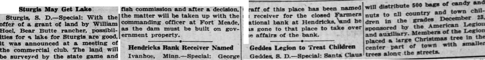Sturgis May Get Lake Sturgis, S. D.-Special: With the offer of grant of land by William Hoel, Bear Butte rancher, possibilities for lake for Sturgis are good, It was announced at a meeting of the commercial club. The land will be surveyed by the state game and fish commission and after a decision, the matter will be taken up with the commanding officer at Fort Meade, as the dam must be built on government property. Hendricks Bank Receiver Named Ivanhoe, Minn George will distribute 500 bags of candy chil- and Graff of this place has been named and town to all country as receiver for the closed Farmers nuts December 23, the grades National bank at Hendricks, and he dren in American Legion by the has gone to that place to take over sponsored and auxiliary. Members of the Legion the affairs of the bank. placed large Christmas with tree smaller in the of town Geddes Legion to Treat Children center part trees alons the streets. -Special: Santa Claus Geddes, S.