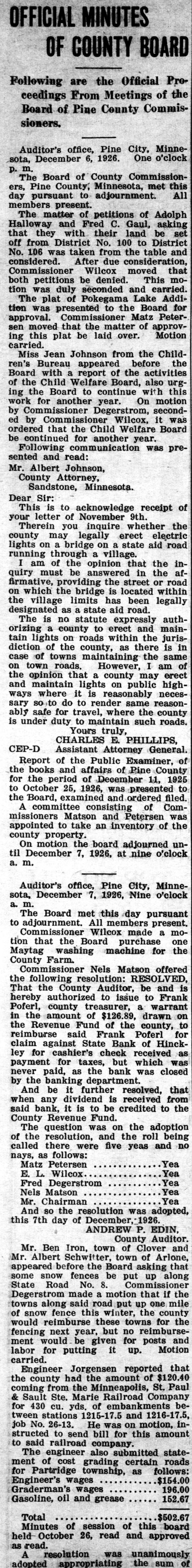 OFFICIAL MINUTES OF COUNTY BOARD Following are the Official Proceedings From Meetings of the Board of Pine County Commissioners. Auditor's office, Pine City, Minnesota, December 6, 1926. One o'clock m. p. The Board of County Commissioners, Pine County, Minnesota, met this day pursuant to adjournment. All members present. The matter of petitions of Adolph Halloway and Fred C. Gaul, asking that they with their land be set off from District No. 100 to District No. 106 was taken from the table and considered. After due consideration, Commissioner Wilcox moved that both petitions be denied. This motion was duly seconded and carried. The plat of Pokegama Lake Addition was presented to the Board for approval. Commissioner Matz Petersen moved that the matter of approving this plat be laid over. Motion carried. Miss Jean Johnson from the Children's Bureau appeared before the Board with a report of the activities of the Child Welfare Board, also urging the Board to continue with this work for another year. On motion by Commissioner Degerstrom, seconded by Commissioner Wilcox, it was ordered that the Child Welfare Board be continued for another year. Following communication was presented and read: Mr. Albert Johnson, County Attorney, Sandstone, Minnesota. Dear Sir: This is to acknowledge receipt of your letter of November 9th. Therein you inquire whether the county may legally erect electric lights on a bridge on a state aid road running through a village. I am of the opinion that the inquiry must be answered in the affirmative, providing the street or road on which the bridge is located within the village limits has been legally designated as a state aid road, The is no statute expressly authorizing a county to erect and maintain lights on roads within the jurisdiction of the county, as there is in case of towns maintaining the same on town roads. However, I am of the opinion that a county may erect and maintain lights on public highways where it is reasonably necessary so to do to render same reasonably safe for travel, where the county is under duty to maintain such roads. Yours truly, CHARLES E. PHILLIPS, CEP-D Assistant Attorney General. Report of the Public Examiner, of the books and affairs of Pine County for the period of December 11, 1925 to October 25, 1926, was presented to the Board, examined and ordered filed. A committee consisting of Commissioners Matson and Petersen was appointed to take an inventory of the county property. On motion the board adjourned until December 7, 1926, at nine o'clock a. m. Auditor's office, Pine City, Minnesota, December 7, 1926, Nine o'clock a. m. The Board met this day pursuant to adjournment. All members present. Commissioner Wilcox made a motion that the Board purchase one Maytag washing machine for the County Farm. Commissioner Nels Matson offered the following resolution: RESOLVED, That the County Auditor, be and is hereby authorized to issue to Frank Poferl, county treasurer, a warrant in the amount of $126.89, drawn on the Revenue Fund of the county, to reimburse said Frank Poferl for claim against State Bank of Hinckley for cashier's check received as payment for taxes, but which was never paid, as the bank was closed by the banking department. And be it further resolved, that when any dividend is received from said bank, it is to be credited to the County Revenue Fund. The question was on the adoption of the resolution, and the roll being called there were five yeas and no nays, as follows: Yea Matz Petersen Yea E. L. Wilcox Yea Fred Degerstrom Yea Nels Matson Yea Mr. Chairman And so the resolution was adopted, this 7th day of December 1926. ANDREW P. EDIN, County Auditor. Mr. Ben Iron, town of Clover and Mr. Albert Schwitter. town of Arlone, appeared before the Board asking that some snow fences be put up along State Road No. 8. Commissioner Degerstrom made a motion that if the towns along said road put up one mile of snow fence this winter, the county would reimburse these towns for the fencing next year, but no reimbursement would be given for posts and labor for putting it up. Motion carried. Engineer Jorgensen reported that the county had the amount of $120.40 coming from the Minneapolis, St. Paul & Sault Ste. Marie Railroad Company for 430 cu. yds. of embankments between stations 1215-17.5 and 1216-17.5, job No. 26-13. He was on motion, instructed to send bill for this amount to said railroad company. The engineer also submitted statement of cost grading certain roads for Partridge township, as follows: $154.00 Engineer's wages Graderman's wages 196.00 152.67 Gasoline, oil and grease Total $502.67 Minutes of session of this board held October 26, read and approved as read. A resolution was unanimously adopted appropriating the sum of