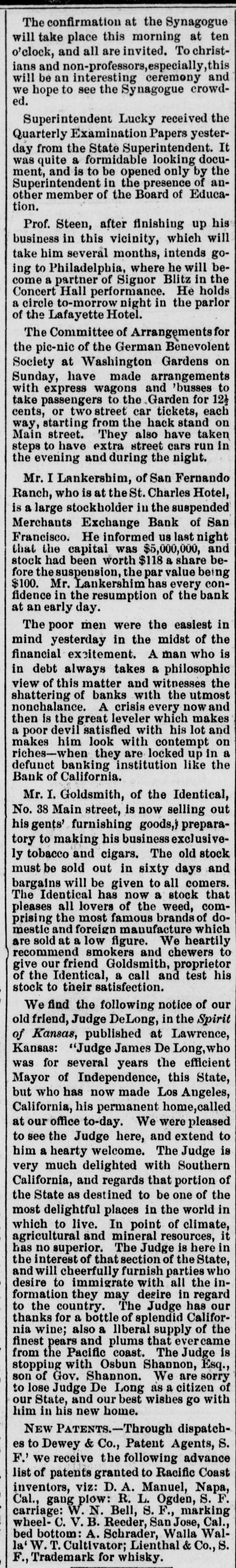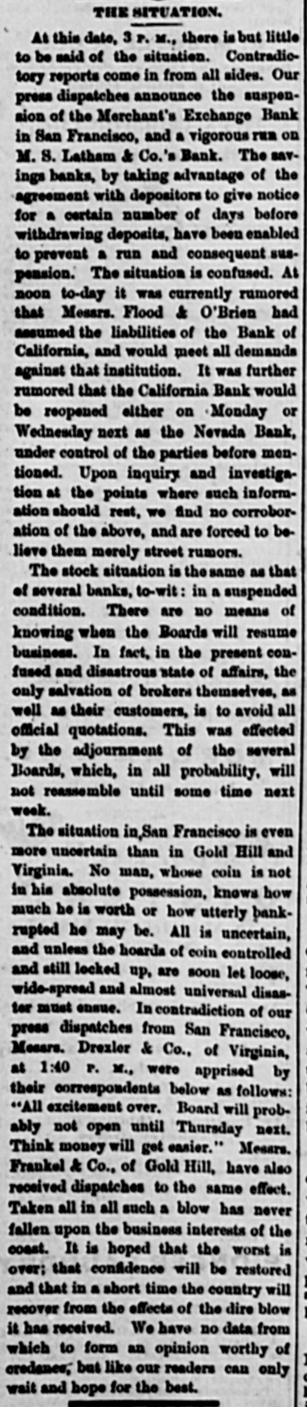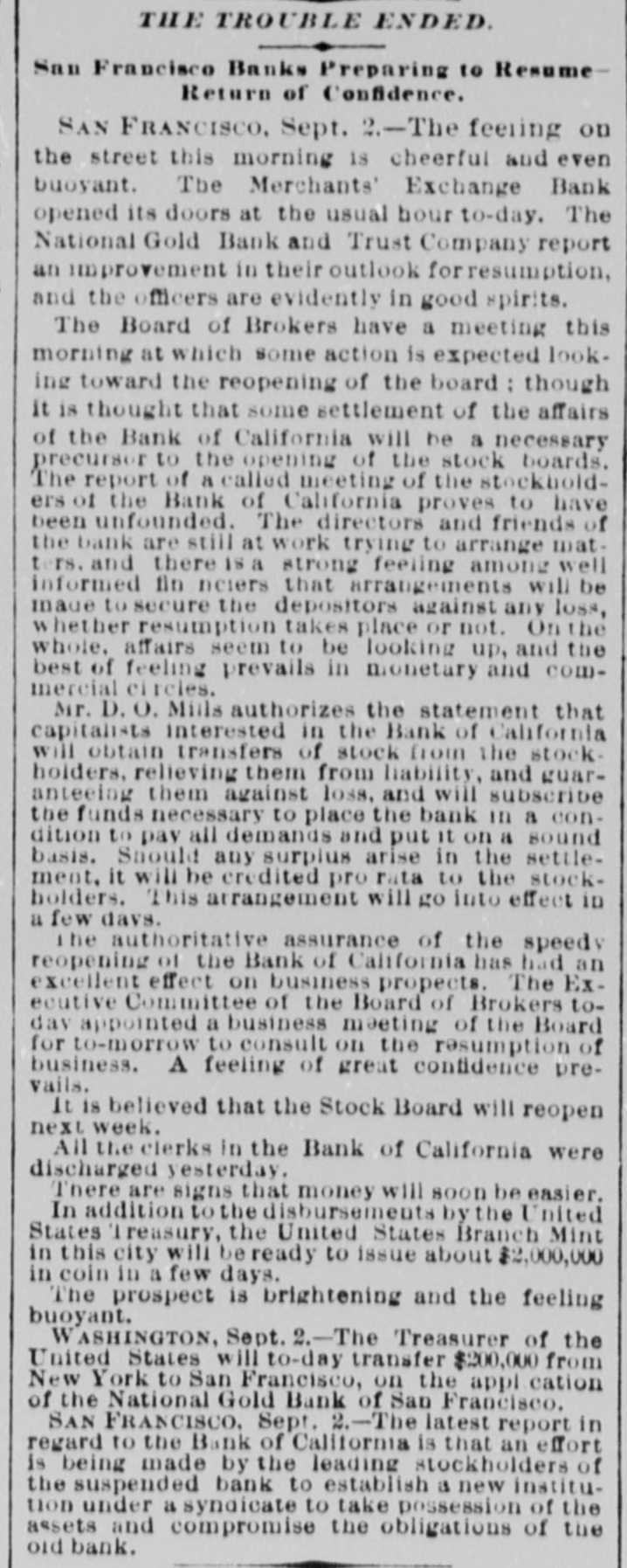 From the Maine State Press of Sept. 2, 1875. History of Seven Days. The News for the week ending Wednesday Night, Sept. I. THE NATONAL CAPIT The Attorney General having ven an ad. verse decision on the points presented to him in the Chorpenning case, that persistent claimant has gone to the court of claims for relief on mail contracts amounting to $463,000. The European and North American Railway will get a lift by the payment of the Maine and Massachusetts claim of $678,000, which was made September. The Secretary of the Treasury declines to reverse the recent order relating to ex portation at Portland. There was an unprecedented rain-fall in Washington Sunday, flooding houses and causing a great destruction of property. The Secretary of the Treasury has directed the destruction of $509, of legal tenders,being 80 per cent of the national bank notes issued in August. The Secretary of the Treasury has decided that hewn pine timber, commercially known as square or side, is subject to duty at the rate of cent per cubic foot and not 20 per cent advalorem as heretofore held be the department. J. M. Thatcher Commissioner of Patents has resigned. Ex-Congressman Duell will be appointed to fill the vacancy. Nearly a year ago the jury in the safe bur_ glary case of Harrington and others failed to agree. There will be another trial, important evidence having been discovered during the last three weeks. BUSINESS FAILURES. The failure of three important business houses are noted this week Bank of California, Stirling, Abrens & Co., sugar importers of Baltimore, and the publishing heuse of Lee & Shepard of Boston and the branch house of Lee, Shepard & Dillingham in New York. The Bank of California was bank of deposit simply, not of issue, and was started in 1865 by William C. Ralston, with capital of 000, 000, which was subsequently increased to $5,000.000. It was unusually prosperous, and its President, Mr. Ralston, had made himself one of the wealthiest men in California. His industry was untiring and his bank became intimately connected with many of the industries of the state. With Senator Sharon he undertook to build the Palace Hotel in San Francisco, which will cost $5,000,000 and be the most splendid hotel on the continent. A short time before the failure of his bank he transferred his interest in the hotel to Mr. Sharon, 80 that the latter is now sole owner. The failure of his bank is attributed to various causes, of which bad luck in mining specula tion, and the antagonism of a rival concern, the Bank of Nevada, are the principal ones The liabilities of the institution are estimated at $14,000,000, while the assets will reach $7,000,000. The depositors will probably recieve about 80 per cent. of their deposits, but the stockholders will meet with a heavy loss. The effect of the disaster was felt allover the United States but on the Pacific coast the excitement was intense. A run was commenced on the National Gold Bank and the Merchants Exchange Bank of San Francisco, both of which were compelled to temporarily close their doors, though they are perfectly solvent. Later in the day the excitement was increased by the announcement that President Ralston had committed suicide. He was walking on the sea shore when he suddenly fell back dead, and the inference was that he had taken his own life. Subsequently, however, it was shown that his death was from apoplexy. Later reports from San Francisco show better feeling and a partial restoration of confidence The effect of the failure will probably not be so bad as was at first anticipated, and when the wreck is cleared away and the present excitement subsides the state of California will sail along as prosperously as ever. The failure of the Baltimore sugar importing firm is also a notable one. The concern was the largest house of its kind in the country. its annual business footing up $40,000,000. The liabilities of the firm are estimated at $2,000,000, while its assets, if judiciously managed, may pay the entire indebtedness. De pression in business is assigned as its cause. The failure of Lee & Shepard took the general public by surprise though those intimate with the affairs of the concern were prepared for it. The firm lost very heavily by the great fire in Boston and subsequently by the Sudbury street fire, and have experienced long term of business depression. Their liabilities are estimated at $650,000, while their assets are not known, though it is expected that they will pay 50 cents on a dollar. Lee, Shepard & Dillingham's liabilities are $150,000, and with proper management it is thought they can pay their debts in full. The mercantile agency of Dunn, Barstow & Co., in the preface to the new September book, refers to the business prospect as follows: "Whether the expectations which have been entertained of an improved condition of trade for the present year are to be realized or not, the next 90 days will determine. With the exception of a few important localities the agricultural productions have been unusually large and the favorable prices that prevail for several leading products ought to stimulate an early realization. The mo vement of crops is the old fashioned and legitimate manner by which to get money into circulation and thus increasing the purchasing and debt paying power of the people, especially in agricu tural localities, This will be a vital step towards improvement in trade. and a few weeks will determine whether this will be the effect of an immense increase in the wealth of a vast producing class. There exists now a very uncertain and feverish condition of things. Later.-It is officially announced that the bank of California will pay all liabilities and resume business. A guarantee fund of $5,000,000 has been subscribed by D. E. Mills. James R. Keyne, Michael Rosse, Wm. Sharon and others. HOME MATTERS. Politics are getting lively in this state, and everything promises the usual Republican success. A few weeks since the De