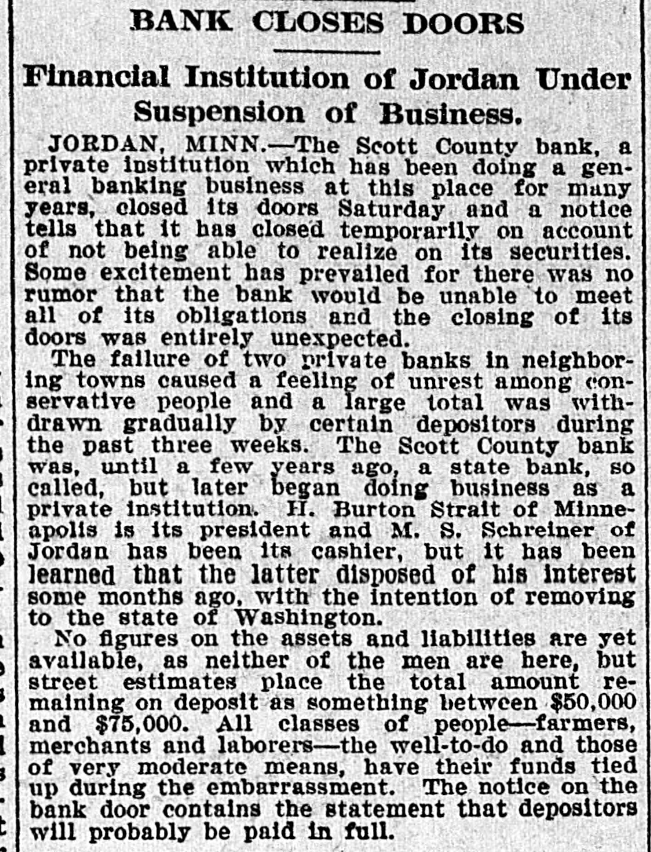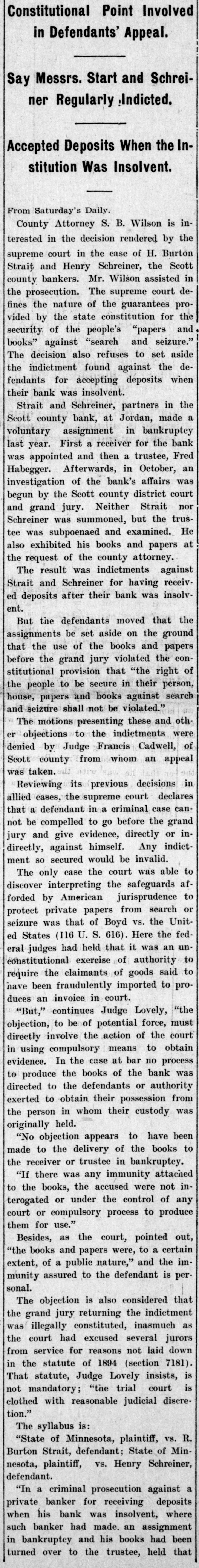 Constitutional Point Involved in Defendants' Appeal. Say Messrs. Start and Schreiner Regularly Indicted. Accepted Deposits When the Institution Was Insolvent. From Saturday's Daily. County Attorney S. B. Wilson is interested in the decision rendered by the supreme court in the case of H. Burton Strait and Henry Schreiner, the Scott county bankers. Mr. Wilson assisted in the prosecution. The supreme court defines the nature of the guarantees provided by the state constitution for the security of the people's "papers and books" against "search and seizure." The decision also refuses to set aside the indictment found against the defendants for accepting deposits when their bank was insolvent. Strait and Schreiner, partners in the Scott county bank, at Jordan, made a voluntary assignment in bankruptcy last year. First a receiver for the bank was appointed and then a trustee, Fred Habegger. Afterwards, in October, an investigation of the bank's affairs was begun by the Scott county district court and grand jury. Neither Strait nor Schreiner was summoned, but the trustee was subpoenaed and examined. He also exhibited his books and papers at the request of the county attorney. The result was indictments against Strait and Schreiner for having received deposits after their bank was insolvent. But the defendants moved that the assignments be set aside on the ground that the use of the books and papers before the grand jury violated the constitutional provision that "the right of the people to be secure in their person, house, papers and books against search and seizure shall not be violated." The motions presenting these and other objections to the indictments were denied by Judge Francis Cadwell, of Scott county from whom an appeal was taken. Reviewing its previous decisions in allied cases, the supreme court declares that a defendant in a criminal case cannot be compelled to go before the grand jury and give evidence, directly or indirectly, against himself. Any indictment so secured would be invalid. The only case the court was able to discover interpreting the safeguards afforded by American jurisprudence to protect private papers from search or seizure was that of Boyd vs. the United States (116 U. S. 616). Here the federal judges had held that it was an unconstitutional exercise of authority to require the claimants of goods said to have been fraudulently imported to produces an invoice in court. "But," continues Judge Lovely, "the objection, to be of potential force, must directly involve the action of the court in using compulsory means to obtain evidence. In the case at bar no process to produce the books of the bank was directed to the defendants or authority exerted to obtain their possession from the person in whom their custody was originally held. "No objection appears to have been made to the delivery of the books to the receiver or trustee in bankruptcy. "If there was any immunity attached to the books, the accused were not interogated or under the control of any court or compulsory process to produce them for use." Besides, as the court, pointed out, "the books and papers were, to a certain extent, of a public nature," and the immunity assured to the defendant is personal. The objection is also considered that the grand jury returning the indictment was illegally constituted, inasmuch as the court had excused several jurors from service for reasons not laid down in the statute of 1894 (section 7181). That statute, Judge Lovely insists, is not mandatory; "the trial court is clothed with reasonable judicial discretion." The syllabus is: "State of Minnesota, plaintiff, VS. R. Burton Strait defendant State of Min.