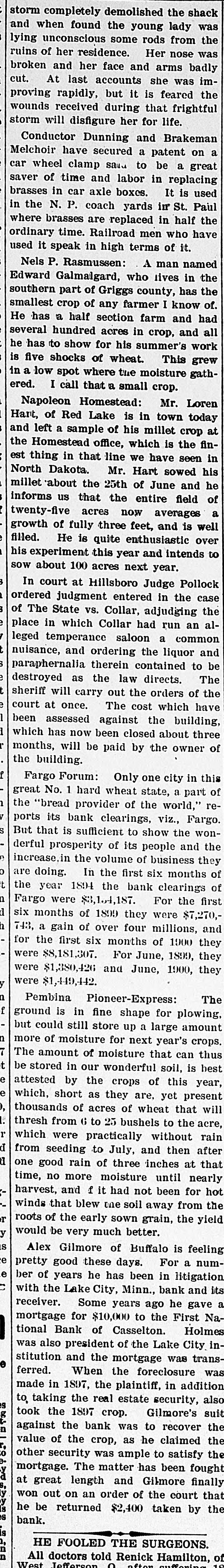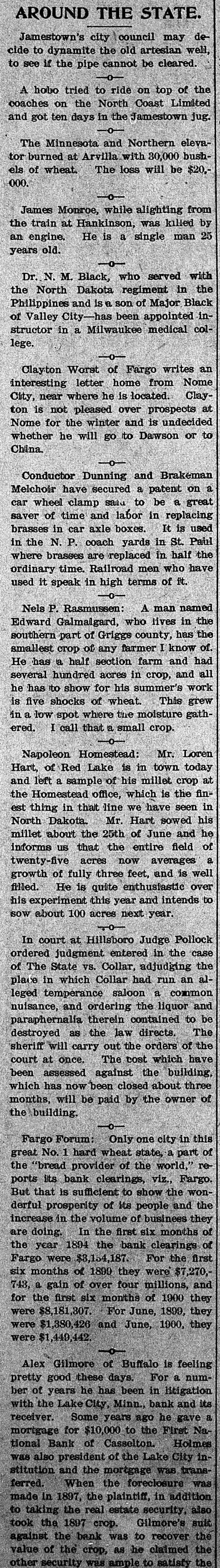 AROUND THE STATE. Jamestown's city council may decide to dynamite the old artesian well, to see if the pipe cannot be cleared. A hobo tried to ride on top of the coaches on the North Coast Limited and got ten days in the Jamestown jug. The Minnesota and Northern elevator burned at Arvilla with 30,000 bushels of wheat. The loss will be $20,000. James Monroe, while alighting from the train at Hankinson, was killed by an engine. He is a single man 25 years old. Dr. N. M. Black, who served with the North Dakota regiment in the Philippines and is a son of Major Black of Valley City-has been appointed instructor in a Milwaukee medical college. Clayton Worst of Fargo writes an interesting letter home from Nome City, near where he is located. Clayton is not pleased over prospects at Nome for the winter and is undecided whether he will go to Dawson or to China. Conductor Dunning and Brakeman Melchoir have secured a patent on a car wheel clamp said to be a great saver of time and labor in replacing brasses in car axle boxes. It is used in the N. P. coach yards in St. Paul where brasses are replaced in half the ordinary time. Railroad men who have used it speak in high terms of it. Nels P. Rasmussen: A man named Edward Galmalgard, who lives in the southern part of Griggs county, has the smallest crop of any farmer I know of. He has a half section farm and had several hundred acres in crop, and all he has to show for his summer's work is five shocks of wheat. This grew in a low spot where the moisture gathered. I call that a small crop. Napoleon Homestead: Mr. Loren Hart, of Red Lake is in town today and left a sample of his millet crop at the Homestead office, which is the finest thing in that line we have seen in North Dakota. Mr. Hart sowed his millet about the 25th of June and he informs us that the entire field of twenty-five acres now averages a growth of fully three feet, and is well filled. He is quite enthusiastic over his experiment this year and intends to sow about 100 acres next year. In court at Hillsboro Judge Pollock ordered judgment entered in the case of The State vs. Collar, adjudging the place in which Collar had run an alleged temperance saloon a common nuisance, and ordering the liquor and paraphernalia therein contained to be destroyed as the law directs. The sheriff will carry out the orders of the court at once. The cost which have been assessed against the building, which has now been closed about three months, will be paid by the owner of the building. Fargo Forum: Only one city in this great No. 1 hard wheat state, a part of the "bread provider of the world," reports its bank clearings, viz., Fargo. But that is sufficient to show the wonderful prosperity of its people and the increase in the volume of business they are doing. In the first six months of the year 1894 the bank clearings of Fargo were $3,154,187. For the first six months of 1899 they were $7,270,743, a gain of over four millions, and for the first six months of 1900 they were $8,181,307. For June, 1899, they were $1,380,426 and June, 1900, they were $1,449,442. Alex Gilmore of Buffalo is feeling pretty good these days. For a number of years he has been in litigation with the Lake City, Minn., bank and its receiver. Some years ago he gave a mortgage for $10,000 to the First National Bank of Casselton. Holmes was also president of the Lake City institution and the mortgage was transferred. When the foreclosure was made In 1897, the plaintiff, in addition to taking the real estate security, also took the 1897 crop. Gilmore's suit against the bank was to recover the value of the crop, as he claimed the other security was ample to satisfy the