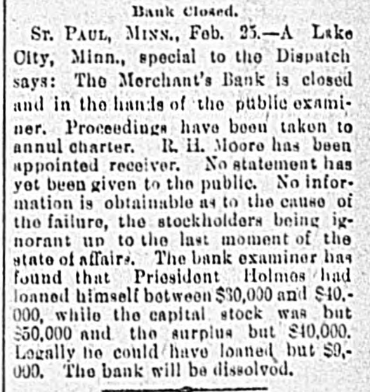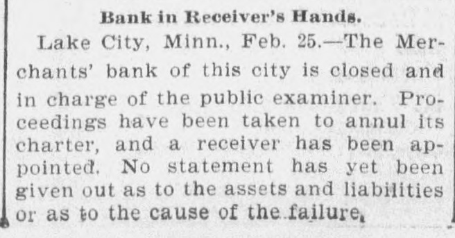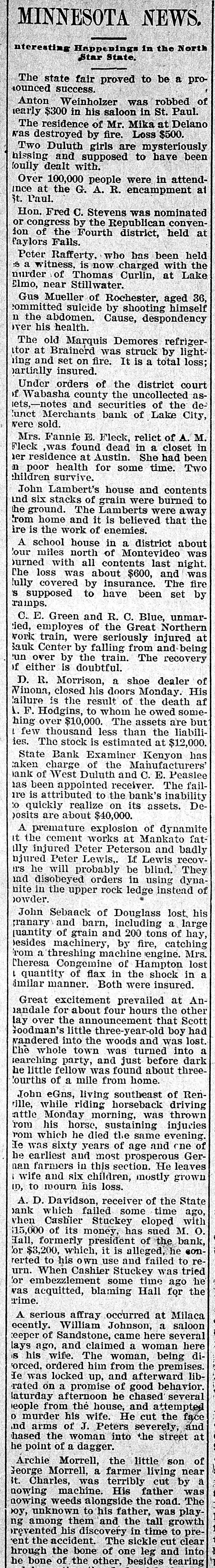 A bonus of $3,000 is being raised at Grantsburg for Iowa parties, who are to erect a large canning factory. An earthquake shock was felt at St. Louis and in other towns in the vicinity. Itlasted about fifteen seconds. Albert Whipple, who wrecked the Crawford, Neb., bank, is found to have had a remarkable criminal career. The bill taking the health board of Detroit out of the hands of the mayor was passed by the Michigan house. Mrs. Bourke Cockran, the wife of the congressman, died suddenly at her home in New York. She was 31 years old. London friends of Count Castellane, who is to marry Miss Anna Gould, state that he is to receive a dot of $3,000,000. Twenty-five of the leaders of the recent black flag riots in Formosa have been beheaded by order of the emperor. General Joseph B. Carr. who was three times elected secretary of state of New York, died at his home in Troy, aged 66. Skeletons of three men and sixteen horses were found in a five-chambered cave on a farm in Sandusky County, Ohio. California's assembly passed a bill to prohibit the wearing of hats or bonnets at theaters or other places of amusement. Icaria, the community established near Corning. Iowa, by French socialists a century ago, has passed into a receiver's hands. Woman suffrage was defeated in the North Dakota house, the vote being 31 to 25. The new divorce bill was also beaten. Recent violent snowstorms have rendered citizens of eastern Colorado destitute and they have appealed for immediate aid. Six hundred French troops were surprised by rebels in Africa. Three hunpred were killed and the survivors surrounded. The bill forbidding a display of foreign flags on public buildings has passed the New York Senate and gone to the Governor. Gen. John A. McCiernand, the veteran soldier, is again confined to bed at Springfield, III., with grip. His case is serious. All the men in the building trades in New York have been ordered to strike to aid the electrical workers to carry their point. A receiver has been appointed for the Merchants' bank of Lake City, Minn. whose president had borrowed $40,000 of its funds. Judge Pugh, of Columbus, O., has decided the various express companies to be corporations and amenable to the excise tax. An eyewitness of Mooshir Pasha's "march of blood" through Armenia says 7,293 lives were sacrificed and many villages burned. C. W. Knapp, of the St. Louis, Republic, was elected president of the American Newspaper Publisher's Association at New York. George W. McBride, ex-Secretary of State, was elected on the thirtieth ballot as United States senator of Oregon to succeed Dolph. London Statist says the high rate of interest asked for United States bonds is due to the belief that further loans will soon be needed. Of ninety-seven republican members o the Kansas legislature ho expressed their presidential preferences forty-nine favored McKinley. George W. Burton, who, helpless from paralysis, was frozen to death in a cabir near Dubuque, Iowa, left a pathetic rec ord of his sufferings. Paris green was discovered in a well a Plano, Ill., used by several families. The alarm was given before any of the pois oned fluid had been used. New York's Legislature, both branch es, has passed the bill submitting to th people a proposition to bond the Stat for $9,000,000 for canal improvement. A contract for 19,000,000 gallons of win and the lease of six of the largest wine ries in the state has been made by the as sociated wine dealers of San Francisco Harold O. Henderson, of Mason, Mich who suffered imprisonment for burglar in preference to bringing dishonor on woman, has been pardoned by the gov ernor.