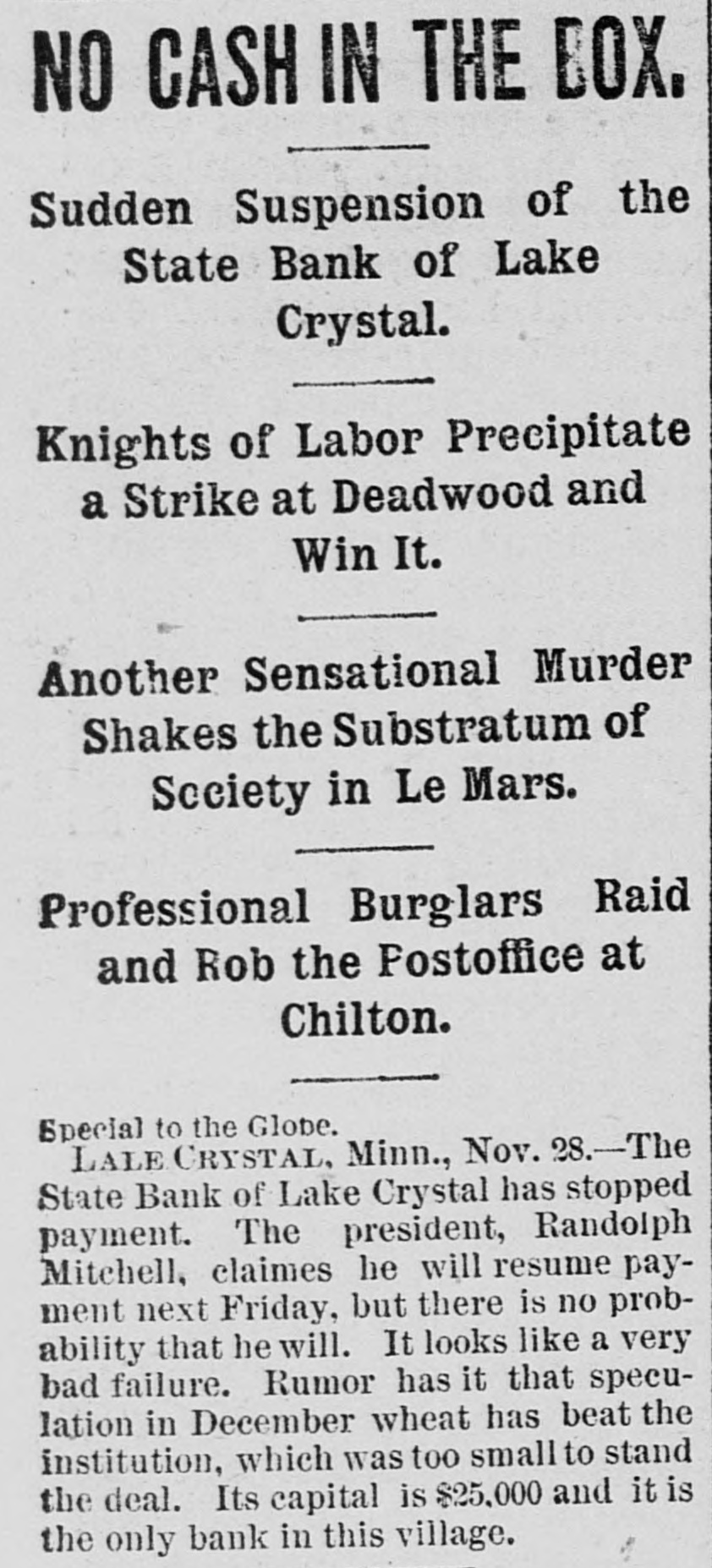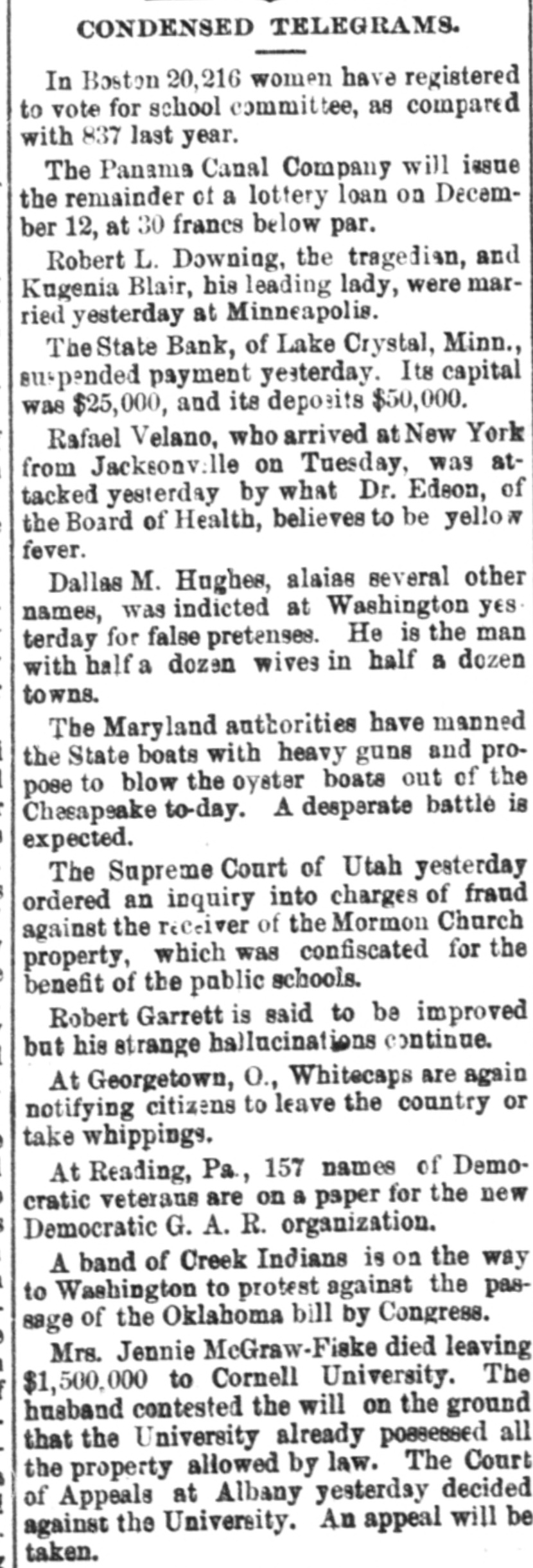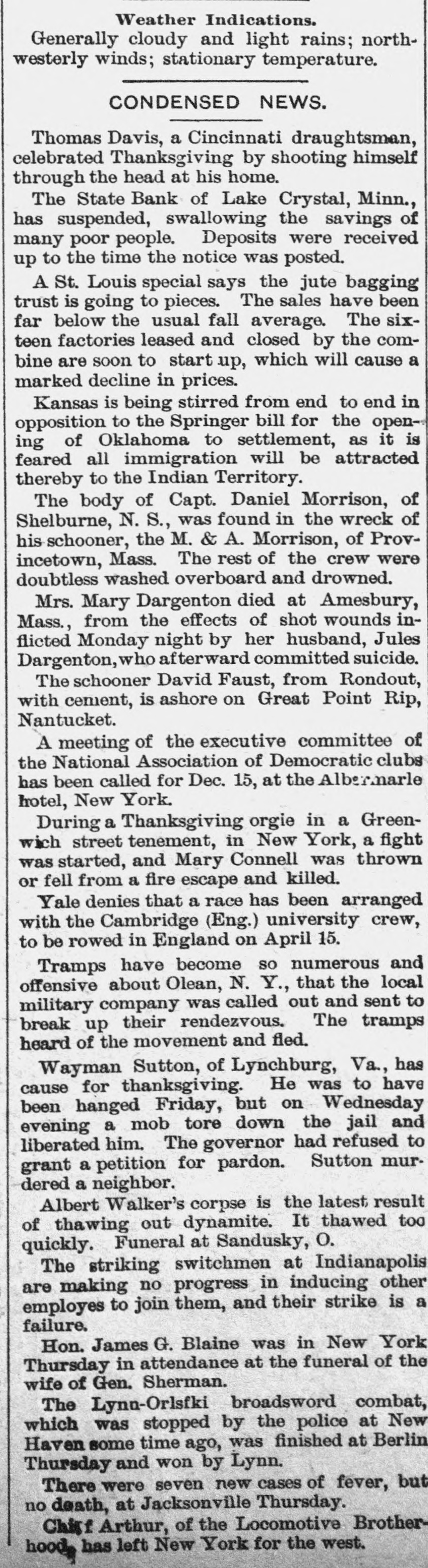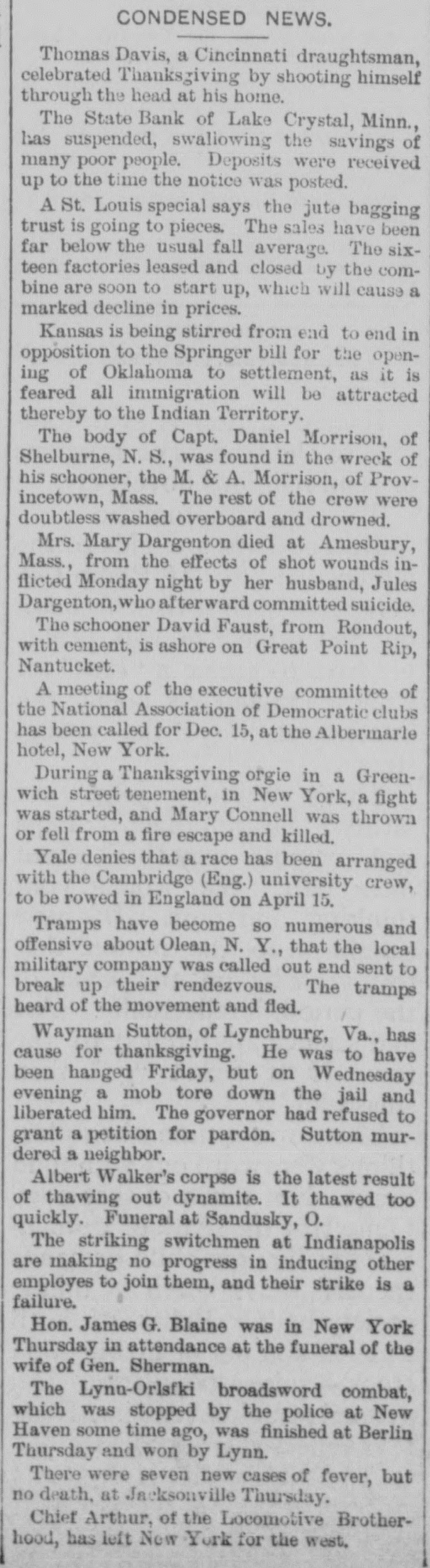CONDENSED NEWS. Thomas Davis, a Cincinnati draughtsman, celebrated Thanksgiving by shooting himself through the head at his home. The State Bank of Lake Crystal, Minn., has suspended, swallowing the savings of many poor people. Deposits were received up to the time the notice was posted. A St. Louis special says the jute bagging trust is going to pieces. The sales have been far below the usual fall average. The sixteen factories leased and closed by the combine are soon to start up, which will cause a marked decline in prices. Kansas is being stirred from end to end in opposition to the Springer bill for the opening of Oklahoma to settlement, as it is feared all immigration will be attracted thereby to the Indian Territory. The body of Capt. Daniel Morrison, of Shelburne, N. S., was found in the wreck of his schooner, the M. & A. Morrison, of Provincetown, Mass. The rest of the crew were doubtless washed overboard and drowned. Mrs. Mary Dargenton died at Amesbury, Mass., from the effects of shot wounds inflicted Monday night by her husband, Jules Dargenton, who afterward committed suicide. The schooner David Faust, from Rondout, with cement, is ashore on Great Point Rip, Nantucket. A meeting of the executive committee of the National Association of Democratic clubs has been called for Dec. 15, at the Albermarle hotel, New York. During a Thanksgiving orgie in a Greenwich street tenement, in New York, a fight was started, and Mary Connell was thrown or fell from a fire escape and killed. Yale denies that a race has been arranged with the Cambridge (Eng.) university crew, to be rowed in England on April 15. Tramps have become so numerous and offensive about Olean, N. Y., that the local military company was called out end sent to break up their rendezvous. The tramps heard of the movement and fled. Wayman Sutton, of Lynchburg, Va., has cause for thanksgiving. He was to have been hanged Friday, but on Wednesday evening a mob tore down the jail and liberated him. The governor had refused to grant a petition for pardon. Sutton murdered a neighbor. Albert Walker's corpse is the latest result of thawing out dynamite. It thawed too quickly. Funeral at Sandusky, O. The striking switchmen at Indianapolis are making no progress in inducing other employes to join them, and their strike is a failure. Hon. James G. Blaine was in New York Thursday in attendance at the funeral of the wife of Gen. Sherman. The Lynn-Orlsfki broadsword combat, which was stopped by the police at New Haven some time ago, was finished at Berlin Thursday and won by Lynn. There were seven new cases of fever, but no death, at Jacksonville Thursday. Chief Arthur, of the Locomotive Brotherhood, has left New York for the west.
