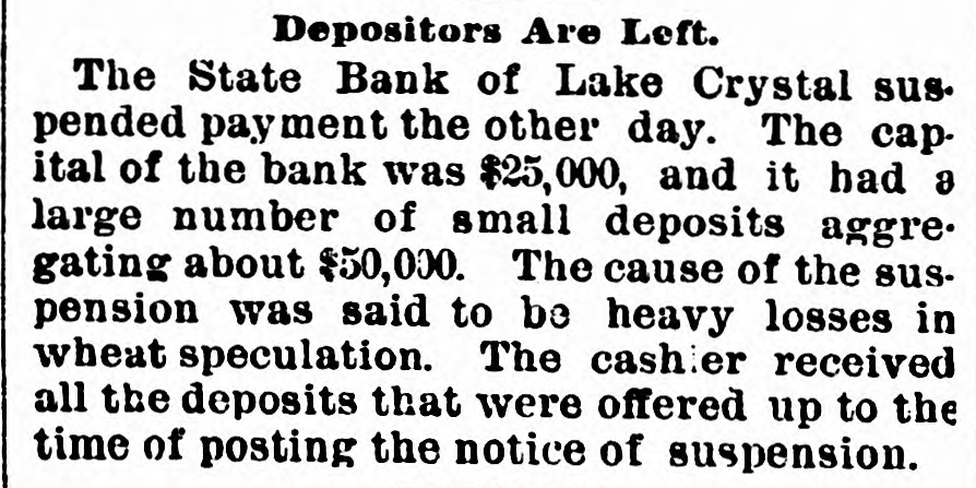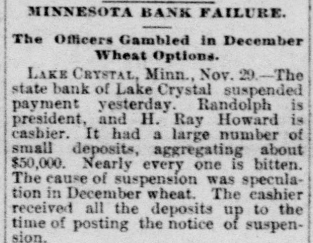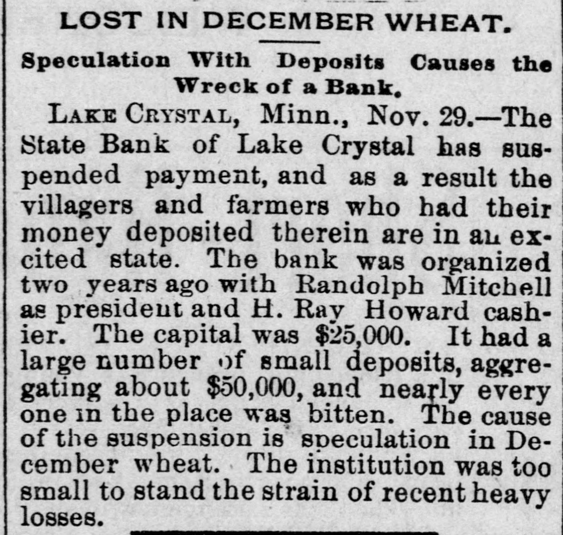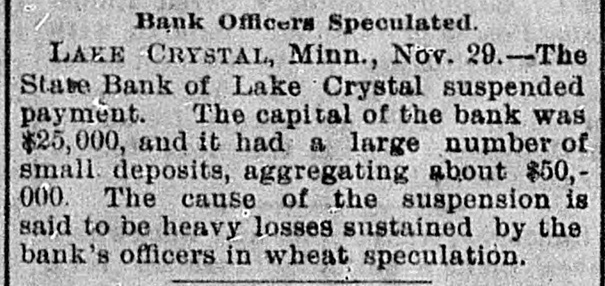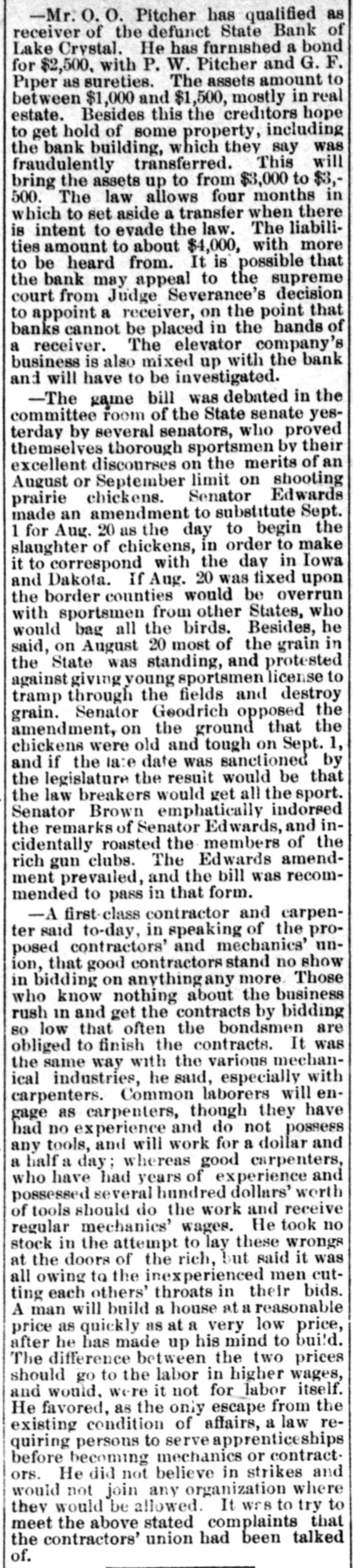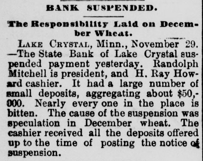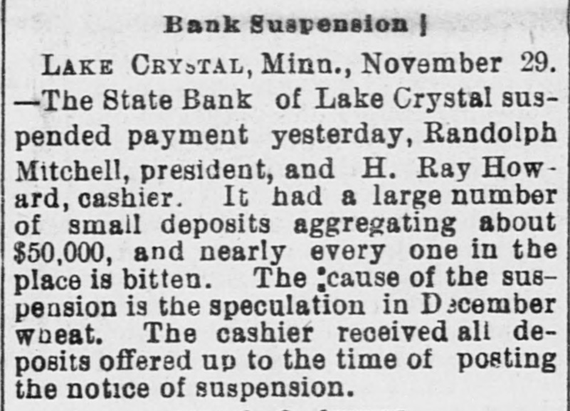 CONDENSED NEWS. Thomas Davis, a Cincinnati draughtsman, celebrated Thanksgiving by shooting himself through the head at his home. The State Bank of Lake Crystal, Minn., has suspended, swallowing the savings of many poor people. Deposits were received up to the time the notice was posted. A St. Louis special says the jute bagging trust is going to pieces. The sales have been far below the usual fall average. The sixteen factories leased and closed by the combine are soon to start up, which will cause a marked decline in prices. Kansas is being stirred from end to end in opposition to the Springer bill for the opening of Oklahoma to settlement, as it is feared all immigration will be attracted thereby to the Indian Territory. The body of Capt. Daniel Morrison, of Shelburne, N. S., was found in the wreck of his schooner, the M. & A. Morrison, of Provincetown, Mass. The rest of the crew were doubtless washed overboard and drowned. Mrs. Mary Dargenton died at Amesbury, Mass., from the effects of shot wounds inflicted Monday night by her husband, Jules Dargenton, who afterward committed suicide. The schooner David Faust, from Rondout, with cement, is ashore on Great Point Rip, Nantucket. A meeting of the executive committee of the National Association of Democratic clubs has been called for Dec. 15, at the Albermarle hotel, New York. During a Thanksgiving orgie in a Greenwich street tenement, in New York, a fight was started, and Mary Connell was thrown or fell from a fire escape and killed. Yale denies that a race has been arranged with the Cambridge (Eng.) university crew, to be rowed in England on April 15. Tramps have become so numerous and offensive about Olean, N. Y., that the local military company was called out end sent to break up their rendezvous. The tramps heard of the movement and fled. Wayman Sutton, of Lynchburg, Va., has cause for thanksgiving. He was to have been hanged Friday, but on Wednesday evening a mob tore down the jail and liberated him. The governor had refused to grant a petition for pardon. Sutton murdered a neighbor. Albert Walker's corpse is the latest result of thawing out dynamite. It thawed too quickly. Funeral at Sandusky, O. The striking switchmen at Indianapolis are making no progress in inducing other employes to join them, and their strike is a failure. Hon. James G. Blaine was in New York Thursday in attendance at the funeral of the wife of Gen. Sherman. The Lynn-Orlsfki broadsword combat, which was stopped by the police at New Haven some time ago, was finished at Berlin Thursday and won by Lynn. There were seven new cases of fever, but no death, at Jacksonville Thursday. Chief Arthur, of the Locomotive Brotherhood, has left New York for the west.