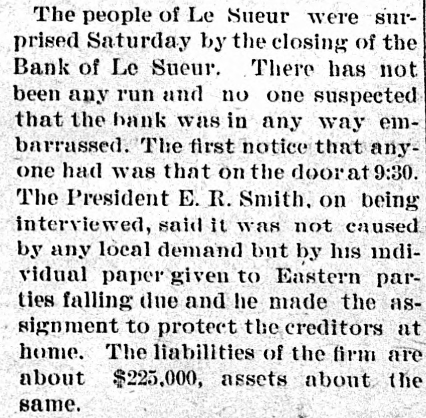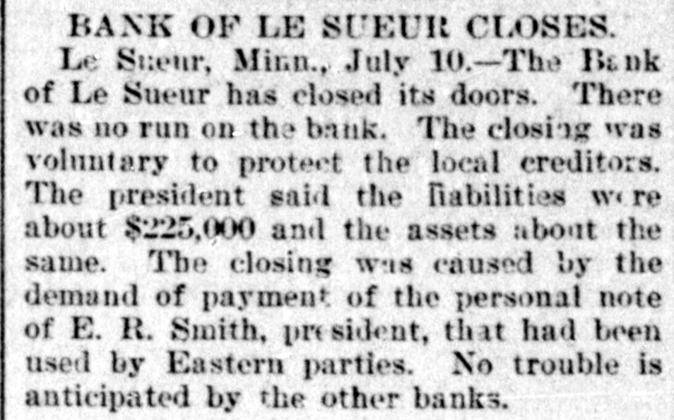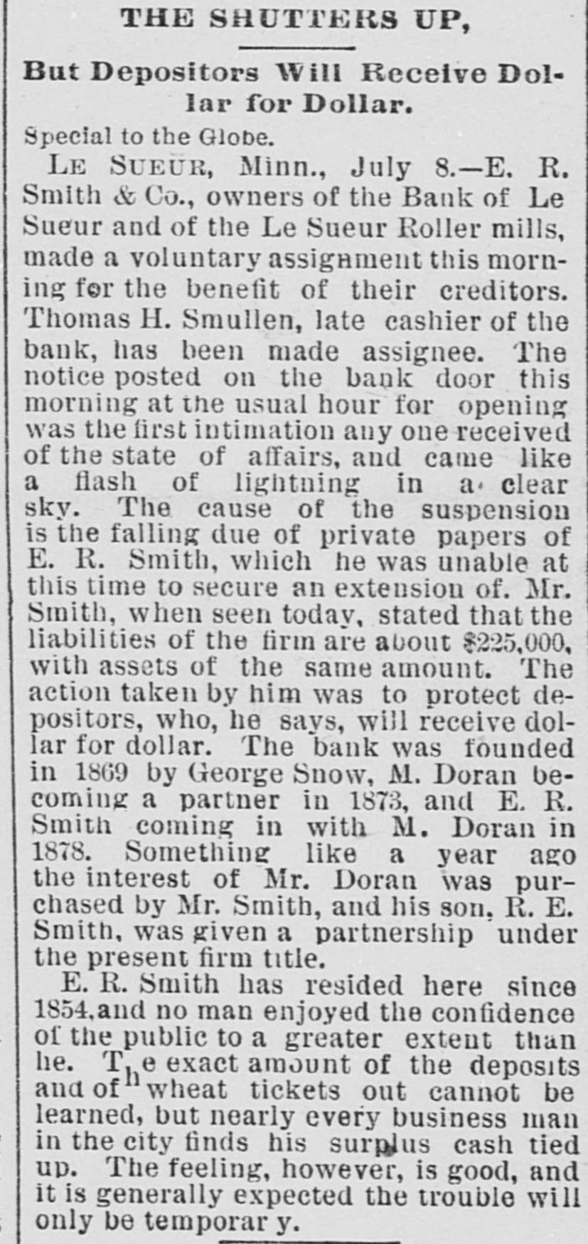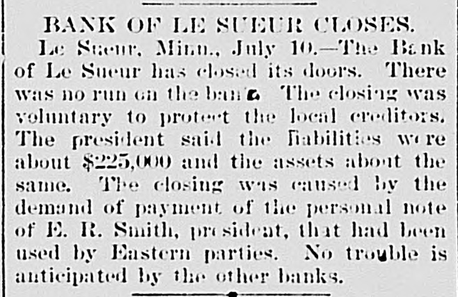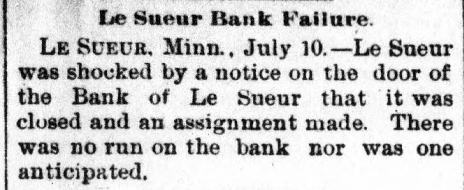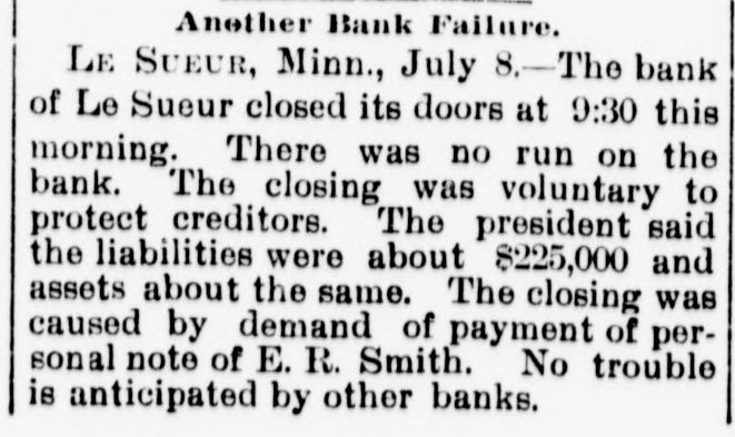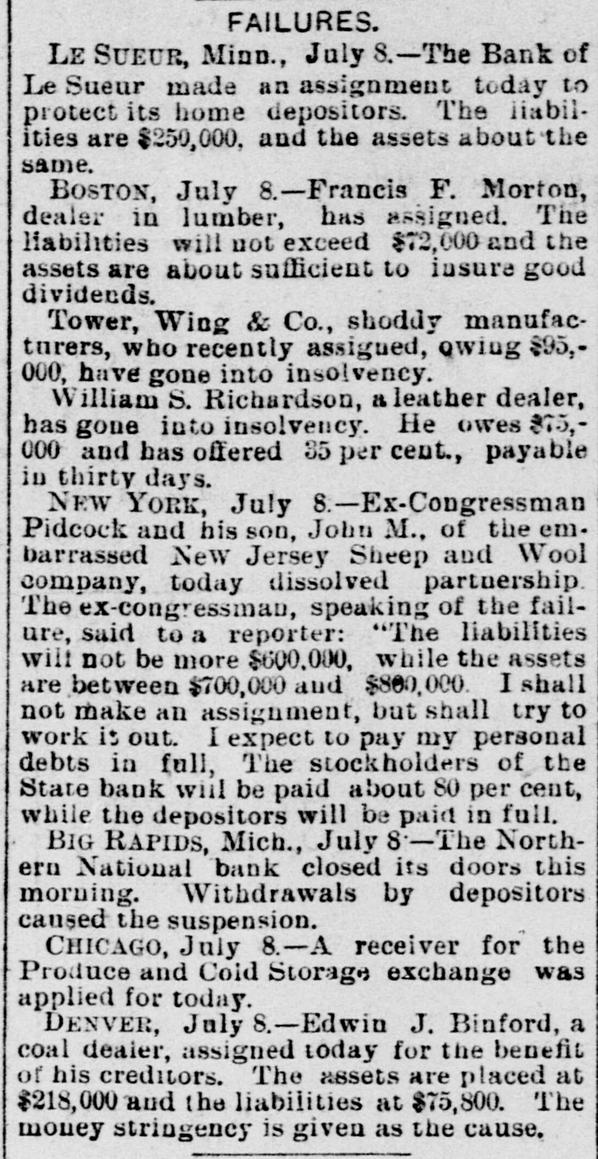 FAILURES. LE SUEUR, Minn., July S.-The Bank of Le Sueur made an assignment today to protect its home depositors. The liabilities are $250,000, and the assets about the same. BOSTON, July 8.-Francis F. Morton, dealer in lumber, has assigned. The liabilities will not exceed $72,000 and the assets are about sufficient to insure good dividends. Tower, Wing & Co., shoddy manufacturers, who recently assigned, qwing $95,000, have gone into insolvency. William S. Richardson, a leather dealer, has gone into insolvency. He owes 375,000 and has offered 35 per cent., payable in thirty days. NEW YORK, July 8.-Ex-Congressman Pidcock and his son, John M., of the embarrassed New Jersey Sheep and Wool company, today dissolved partnership. The ex-congressman, speaking of the failure, said to a reporter: "The liabilities will not be more $600,000, while the assets are between $700,000 and $800,000. I shall not make all assignment, but shall try to work it out. I expect to pay my personal debts in full, The stockholders of the State bank will be paid about 80 per cent, while the depositors will be paid in full. BIG RAPIDS, Mich., July 8:-The Northern National bank closed its doors this morning. Withdrawals by depositors caused the suspension. CHICAGO, July 8.-A receiver for the Produce and Cold Storage exchange was applied for today. DENVER, July 8.-Edwin J. Binford, a coal dealer, assigned today for the benefit of his creditors. The assets are placed at $218,000 and the liabilities at $75,800. The money stringency is given as the cause.