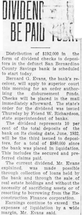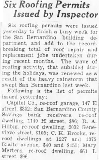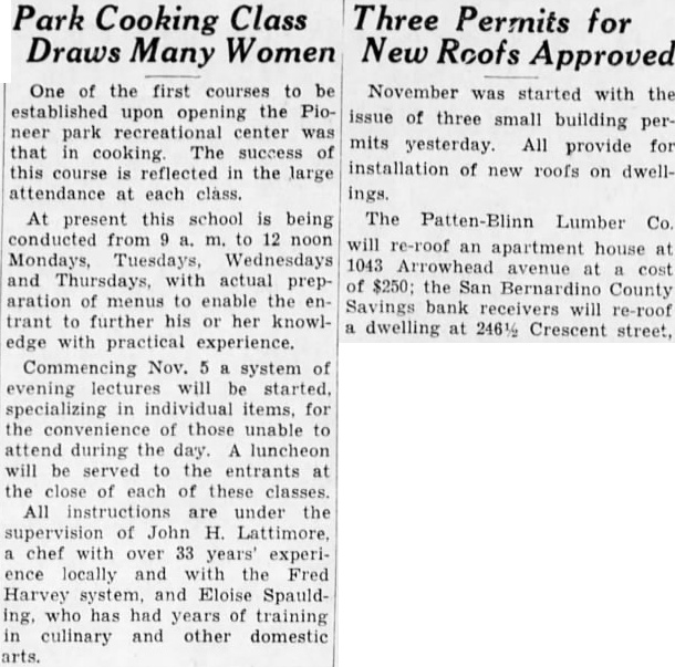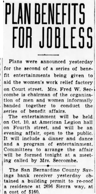 PLAN BENEFITS FOR JOBLESS Plans were announced yesterday for the second of a series of benefit entertainments being given to aid the women's work relief factory on Court street. Mrs. Fred W. Seccombe is chairman of the organization of men and women informally banded together to conduct the series of benefit affairs. The entertainment will be held on Oct. 10. at American Legion hall on Fourth street, and will be an evening affair, open to the public. It will include a dinner and dance and a program of entertainment. Committees to arrange the affair will be formed tonight at a meeting called by Mrs. Seccombe. The San Bernardino County Savings bank receiver yesterday obtained a building permit to re-roof a residence at 2696 Sierra way, at a cost of $160.