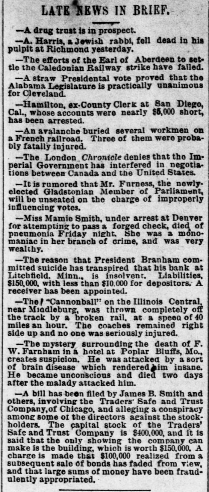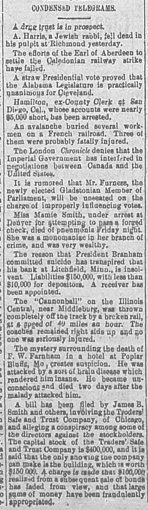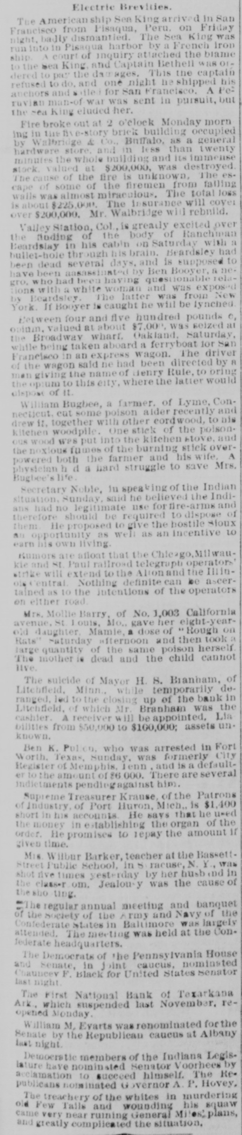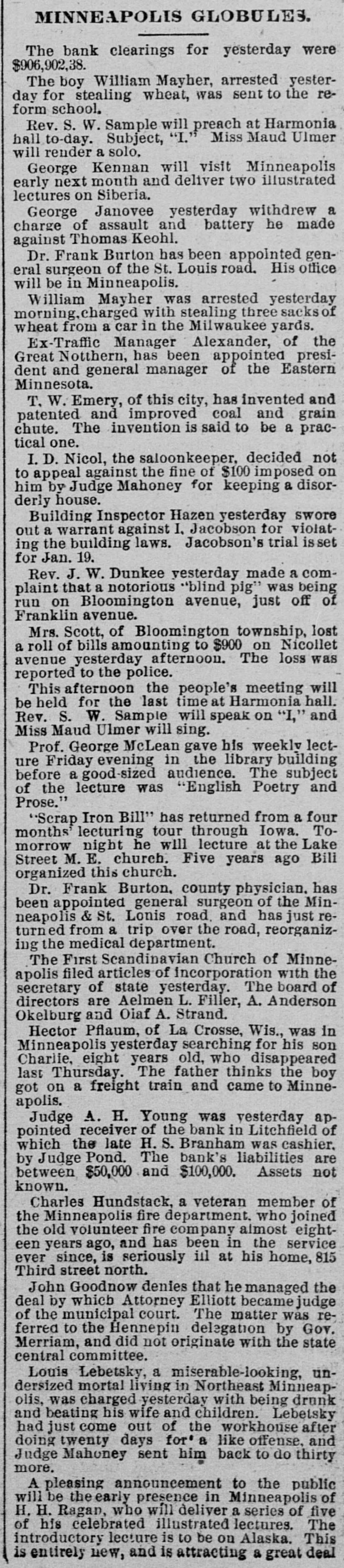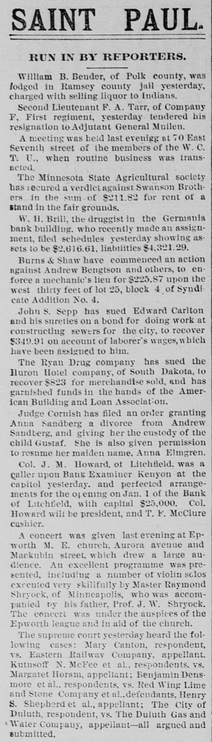 SAINT PAUL. RUN IN BY REPORTERS. William B. Bender, of Polk county, was lodged in Ramsey county jail yesterday, charged with selling liquor to Indians. Second Lieutenant F. A. Tarr, of Company F, First regiment, yesterday tendered his resignation to Adjutant General Mullen. A meeting was held last evenigg at 70 East Seventh street of the members of the W. C. T. U., when routine business was transacted. The Minnesota State Agricultural society has secured a verdict against Swanson Brothers in the sum of $211.82 for rent of a stand in the fair grounds. W. H. Brill, the druggist in the Germania bank building. who recently made an assignment, filed schedules yesterday showing assets to be $2,616.61, liabilities $4,321.29. Burns & Shaw have commenced an action against Andrew Bengtson and others, to enforce a mechanic's lieu for $225.87 upon the west thirty feet of lot 25, block 4 of Syndicate Addition No. 4. John S. Sepp has sued Edward Carlton and his sureties on a bond for doing work at constructing sewers for the city, to recover $349.91 on account of laborer's wages, which have been assigned to him. The Ryan Drug company has sued the Huron Hotel company, of South Dakota, to recover $823 for merchandise sold, and has garnished funds in the hands of the American Building and Loan Association. Judge Cornish has filed an order granting Anna Sandberg a divorce from Andrew Sandberg, and giving her the custody of the child Gustaf. She is also given permission to resume her maiden name, Anna Elmgren. Col. J. M. Howard, of Litchfield. was a caller upon Bank Examiner Kenyon at the capitol yesterday. and perfected arrangements for the of ening on Jan. 1 of the Bank of Litchfield, with capital $25,000. Col. Howard will be president, and T. F. McClure cashier. A concert was given last evening at Epworth M. E. church, Aurora avenue and Mackubin street, which drew a large audience. An excellent programme was presented, including a number of violin solos executed very skillfully by Master Raymond Shryock, of Minneapolis, who was accompanied by his father, Prof. J. W. Shryock. The concert was under the auspices of the Epworth league and in aid of the church. The supreme court yesterday heard the following cases: Mary Canton, respondent, vs. Eastern Railway Company, appellant. Kutnsoff N. McFee et al., respondents. VS. Margaret Horam, appellant; Benjamin Densmore et al., respondents, VS. Red Wing Lime and Stone Company et al., defendants, Henry S. Shepherd et al., appellant; The City of Duluth, respondent, VS. The Duluth Gas and Water Company, appellant-all argued and submitted.