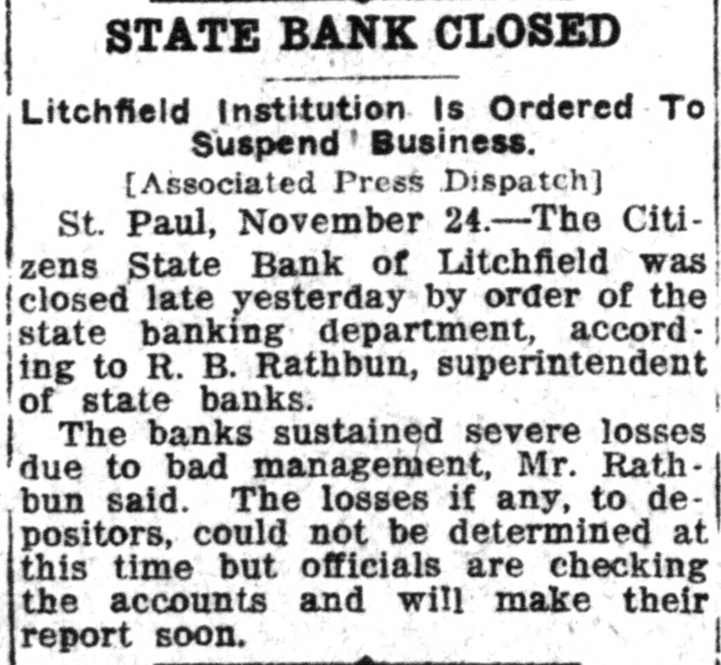 STATE BANK CLOSED Litchfield Institution Is Ordered To Suspend Business. [Associated Press Dispatch] St. Paul, November 24.-The Citizens State Bank of Litchfield was closed late yesterday by order of the state banking department, according to R. B. Rathbun, superintendent of state banks. The banks sustained severe losses due to bad management, Mr. Rathbun said. The losses if any, to depositors, could not be determined at this time but officials are checking the accounts and will make their report soon.