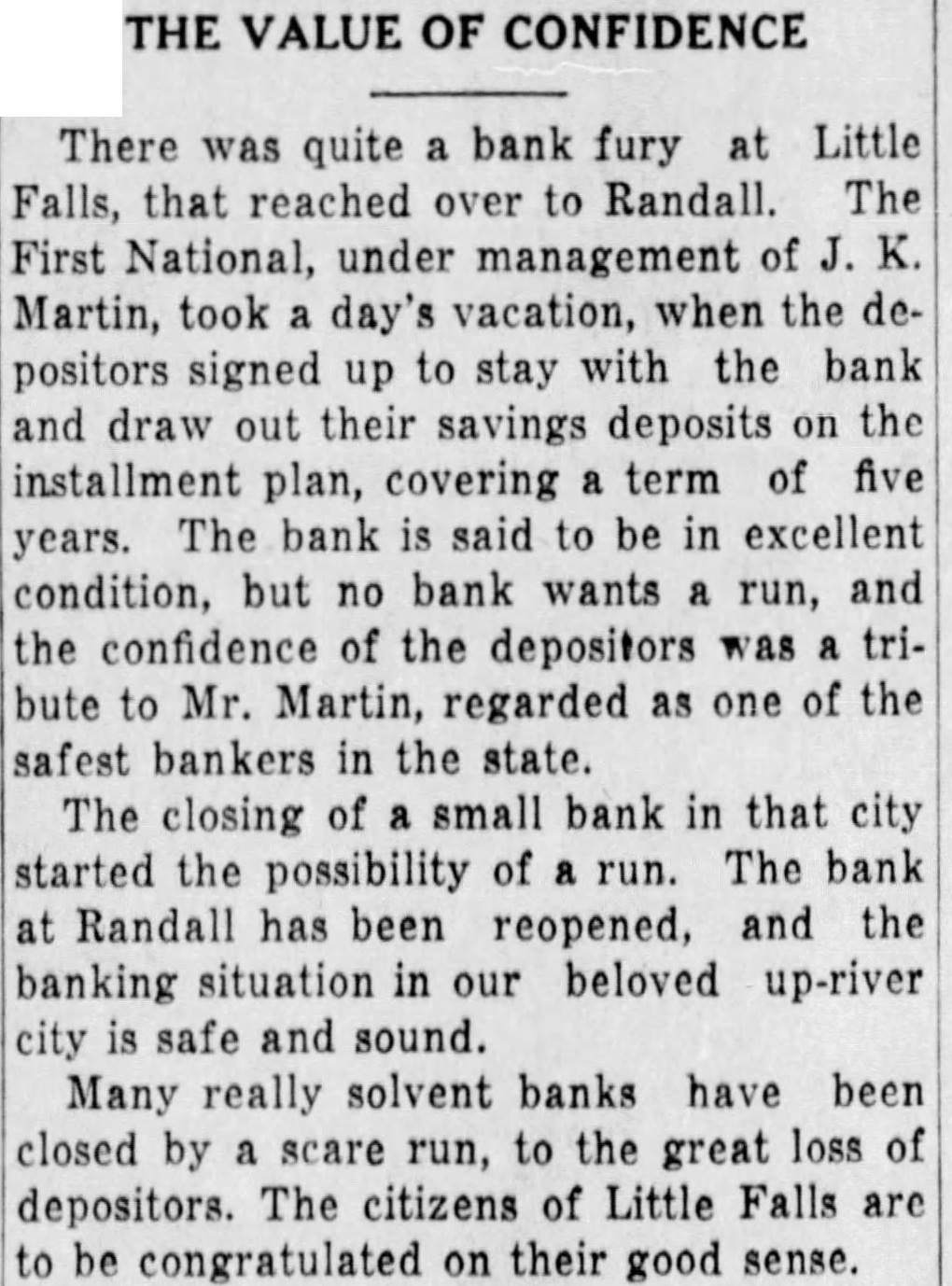 THE VALUE OF CONFIDENCE There was quite a bank fury at Little Falls, that reached over to Randall. The First National, under management of Martin, took a day's vacation, when the depositors signed up to stay with the bank and draw out their savings deposits on the installment plan, covering a term of five years. The bank is said to be in excellent condition, but no bank wants a run, and the confidence of the depositors was a tribute to Mr. Martin, regarded as one of the safest bankers in the state. The closing of a small bank in that city started the possibility of a run. The bank at Randall has been reopened, and the banking situation in our beloved up-river city is safe and sound. Many really solvent banks have been closed by a scare run, to the great loss of depositors. The citizens of Little Falls are to be congratulated on their good sense.