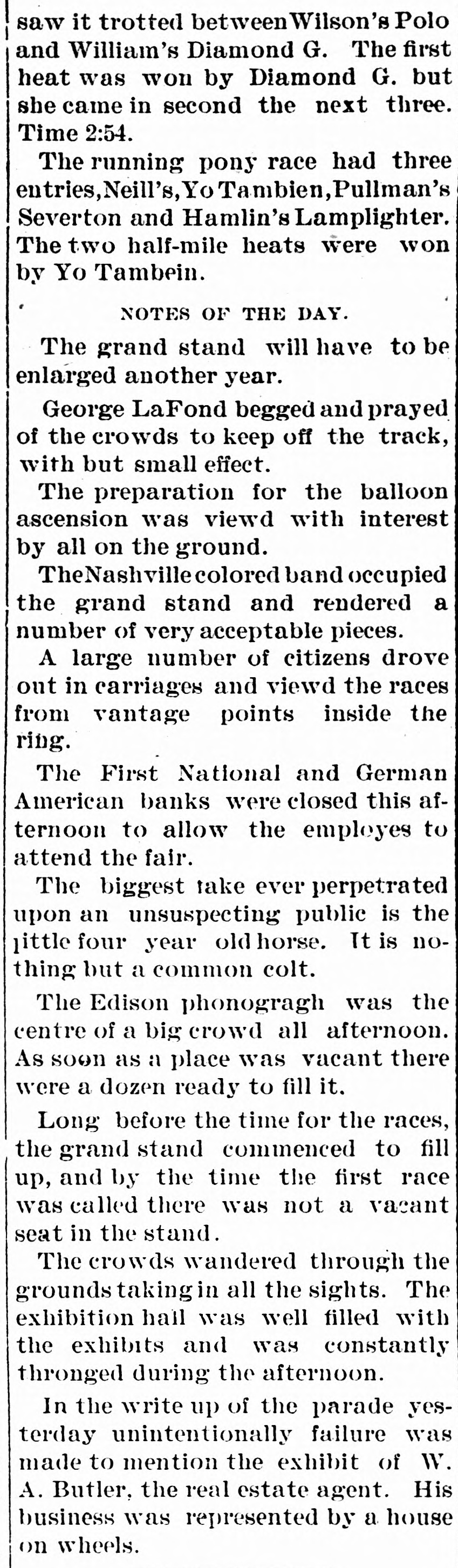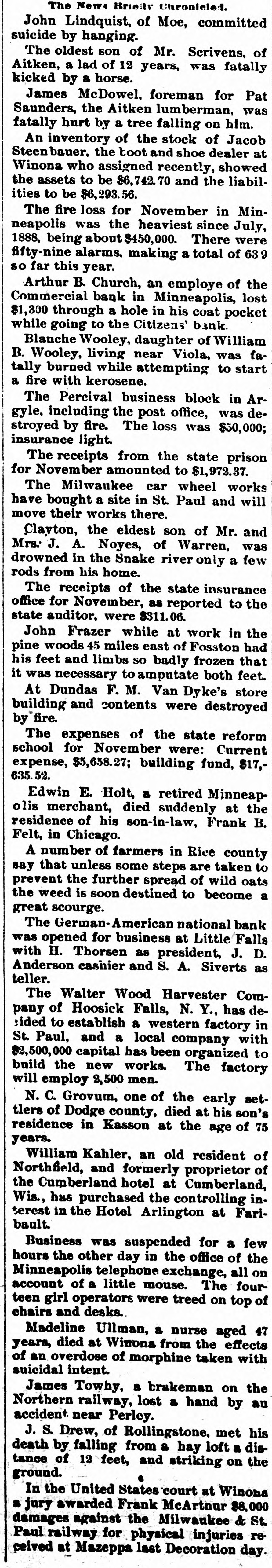 The News Briefir Chronicled. John Lindquist, of Moe, committed suicide by hanging. The oldest son of Mr. Scrivens, of Aitken, a lad of 12 years, was fatally kicked by a horse. James McDowel, foreman for Pat Saunders, the Aitken lumberman, was fatally hurt by a tree falling on him. An inventory of the stock of Jacob Steen bauer, the toot and shoe dealer at Winona who assigned recently, showed the assets to be $6,742.70 and the liabilities to be $6,293.56. The fire loss for November in Minneapolis was the heaviest since July, 1888, being about $450,000. There were fifty-nine alarms, making a total of 639 so far this year. Arthur B. Church, an employe of the Commercial bank in Minneapolis, lost $1,300 through a hole in his coat pocket while going to the Citizens' bank. Blanche Wooley, daughter of William B. Wooley, living near Viola, was fatally burned while attempting to start a fire with kerosene. The Percival business block in Argyle. including the post office, was destroyed by fire. The loss was $50,000; insurance light. The receipts from the state prison for November amounted to $1,972.37. The Milwaukee car wheel works have bought a site in St. Paul and will move their works there. Clayton, the eldest son of Mr. and Mrs. J. A. Noyes, of Warren, was drowned in the Snake river only a few rods from his home. The receipts of the state insurance office for November, as reported to the state auditor, were $311.06. John Frazer while at work in the pine woods 45 miles east of Fosston had his feet and limbs so badly frozen that it was necessary to amputate both feet. At Dundas F. M. Van Dyke's store building and contents were destroyed by fire. The expenses of the state reform school for November were: Current expense, $5,658.27; building fund, $17,635.52. Edwin E. Holt, a retired Minneapolis merchant, died suddenly at the residence of his son-in-law, Frank B. Felt, in Chicago. A number of farmers in Rice county say that unless some steps are taken to prevent the further spread of wild oats the weed is soon destined to become a great scourge. The German-American national bank was opened for business at Little Falls with H. Thorsen as president, J. D. Anderson cashier and S. A. Siverts as teller. The Walter Wood Harvester Company of Hoosick Falls, N. Y., has de:ided to establish a western factory in St. Paul, and a local company with $2,500,000 capital has been organized to build the new works. The factory will employ 2,500 men. N. C. Grovum, one of the early settlers of Dodge county, died at his son's residence in Kasson at the age of 75 years. William Kahler, an old resident of Northfield, and formerly proprietor of the Cumberland hotel at Cumberland, Wis., has purchased the controlling interest in the Hotel Arlington at Faribault. Business was suspended for a few hours the other day in the office of the Minneapolis telephone exchange, all on account of a little mouse. The fourteen girl operators were treed on top of chairs and desks. Madeline Ullman, a nurse aged 47 years, died at Winona from the effects of an overdose of morphine taken with suicidal intent. James Towhy, a brakeman on the Northern railway, lost a hand by an accident near Perley. J. S. Drew, of Rollingstone. met his death by falling from a hay loft a distance of 12 feet, and striking on the ground. In the United States court at Winona a jury awarded Frank McArtnur $8,000 damages against the Milwaukee & St. Paul railway for physical injuries received at Mazeppa last Decoration day.